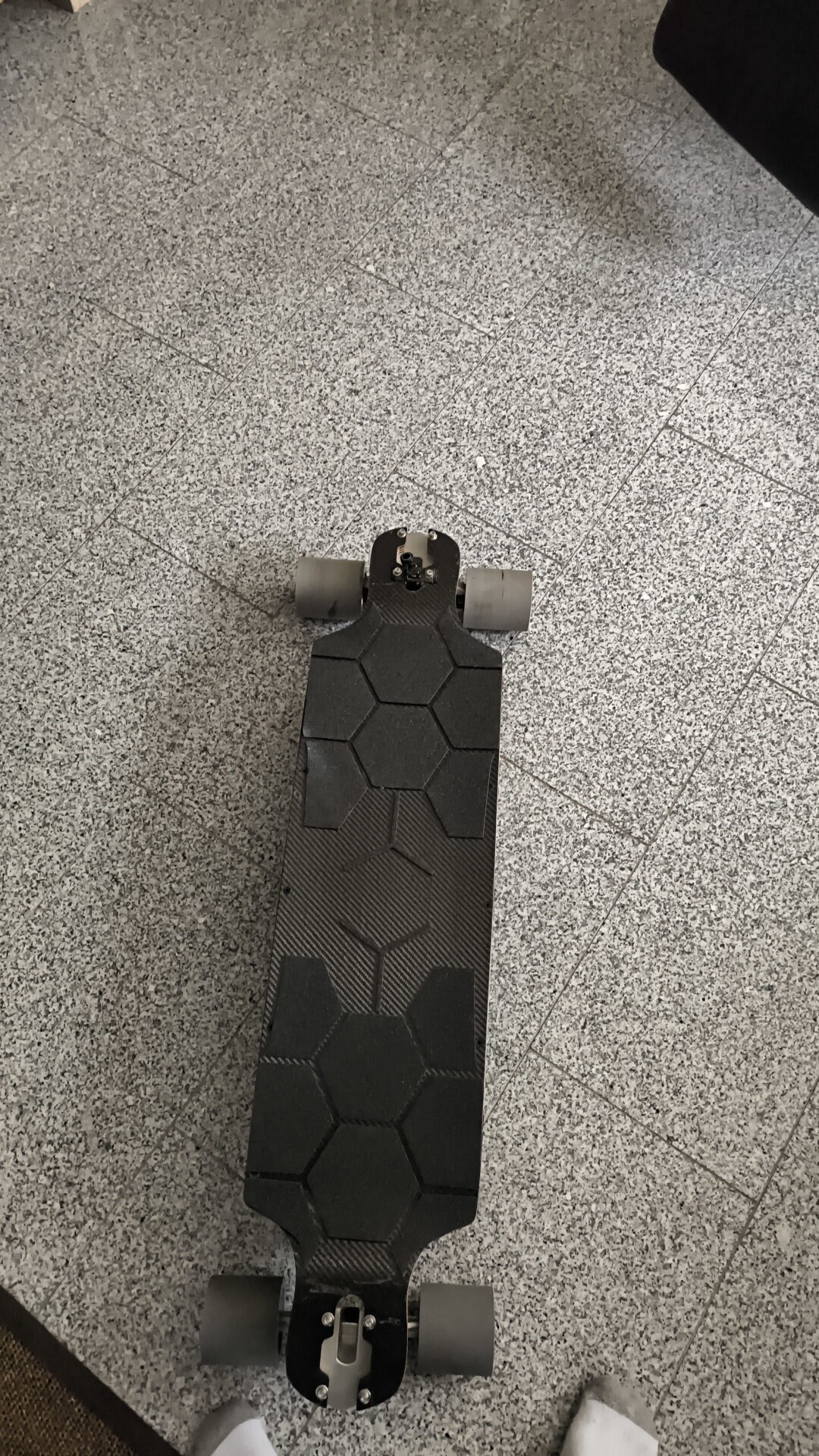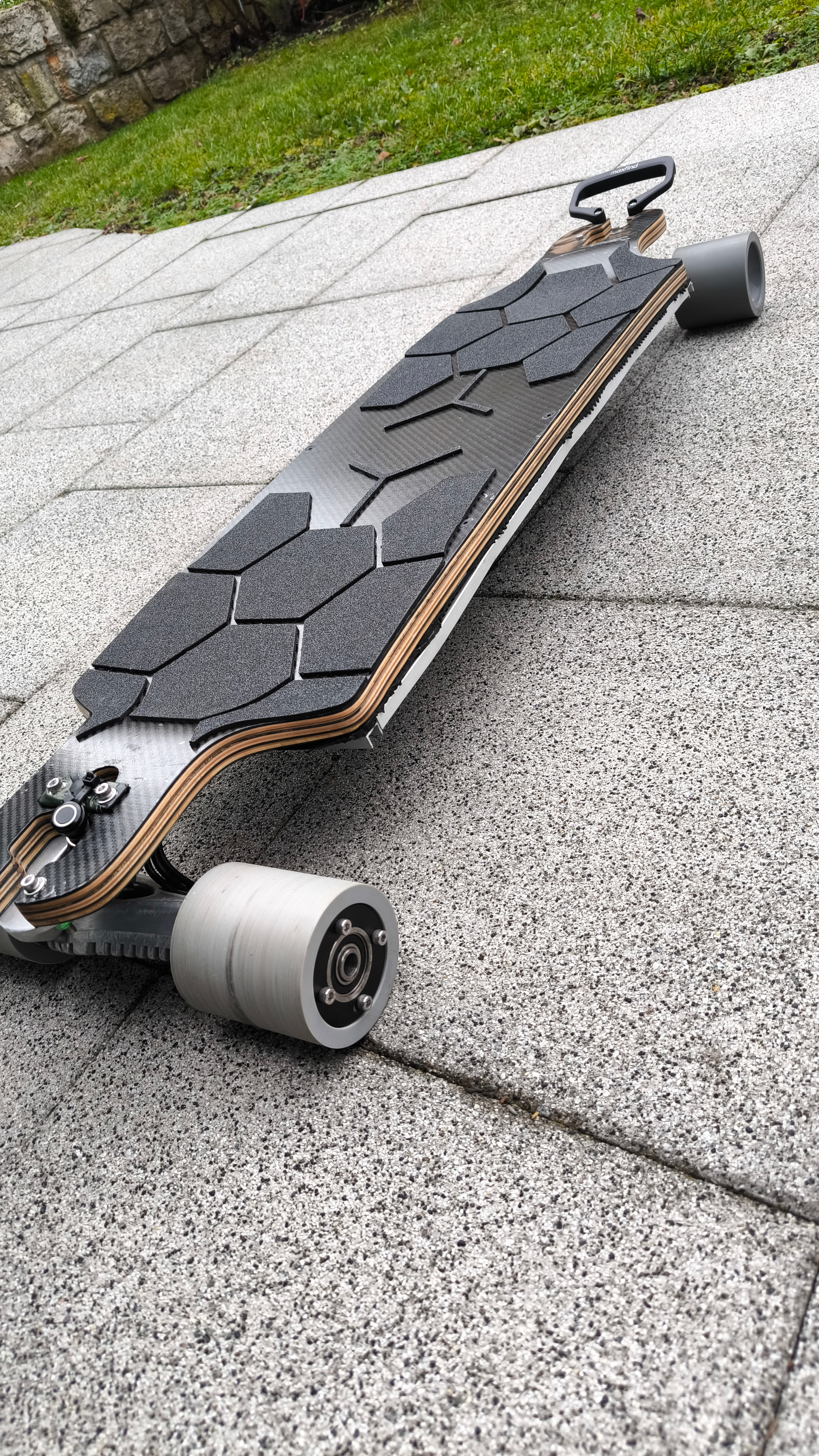 Nice choice of components for a first DIY. Main concern would be battery clearance and enclosure strength with hub motors have you checked flex under load and heat dissipation, especially if you carve the deck and run an aluminum cover?