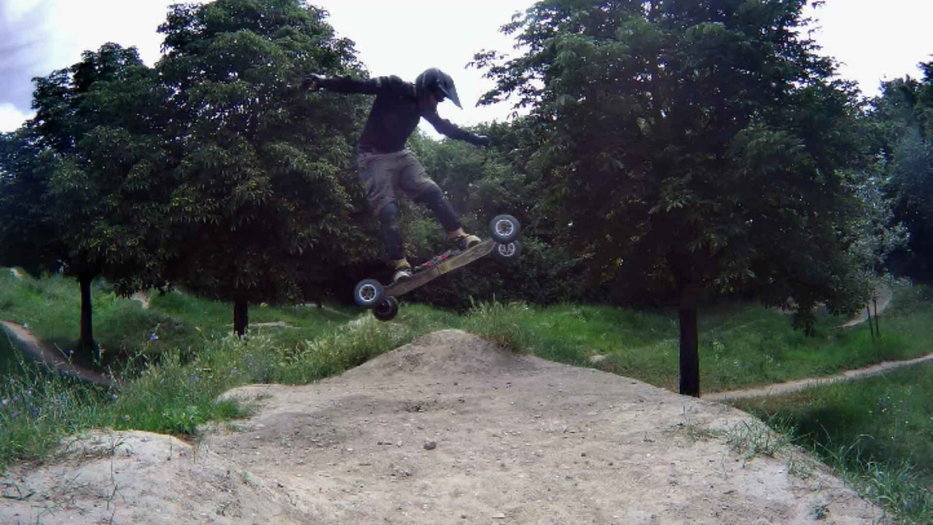 . I tried to lean back more at take-off and it helped a bit to get more air and less distance. Once I overshoot so much that I landed on the flat, that was a heavy impact from 2m or more height. The deck bottomed out and felt weak like butter and the trucks as well. Then I cranked the red shockblocks down, turning got quite hard but for jumping it felt more safe. Then empty battery as always…