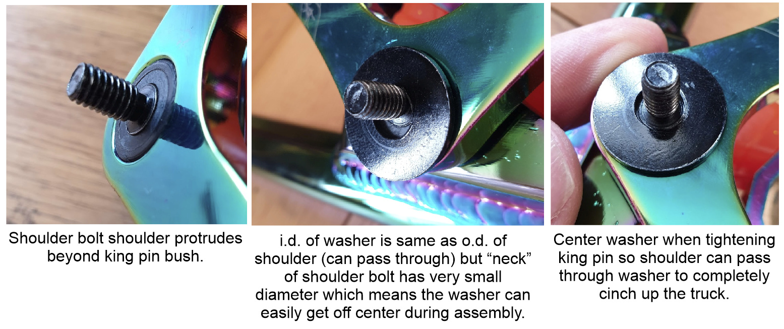 Weâve trained our assembly guys on this but obviously need to follow up again. The good news is itâs easy to fix - just loosen your king pin nut a little, center that washer and hold it in place while you re-tighten king pin. That should cinch it all up (gaps or no gaps). No washers required.
