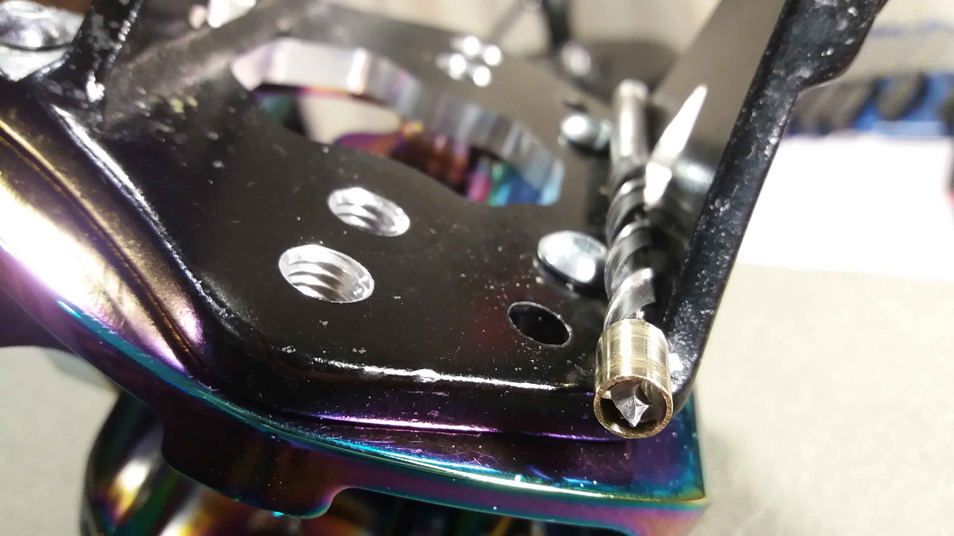 For the 5mm hole I put the brass tube on the drill bit to center it inside the 6mm hole of the Trampa baseplate. One pre-drilled hole was off center but with this method I forced the final hole to the center.