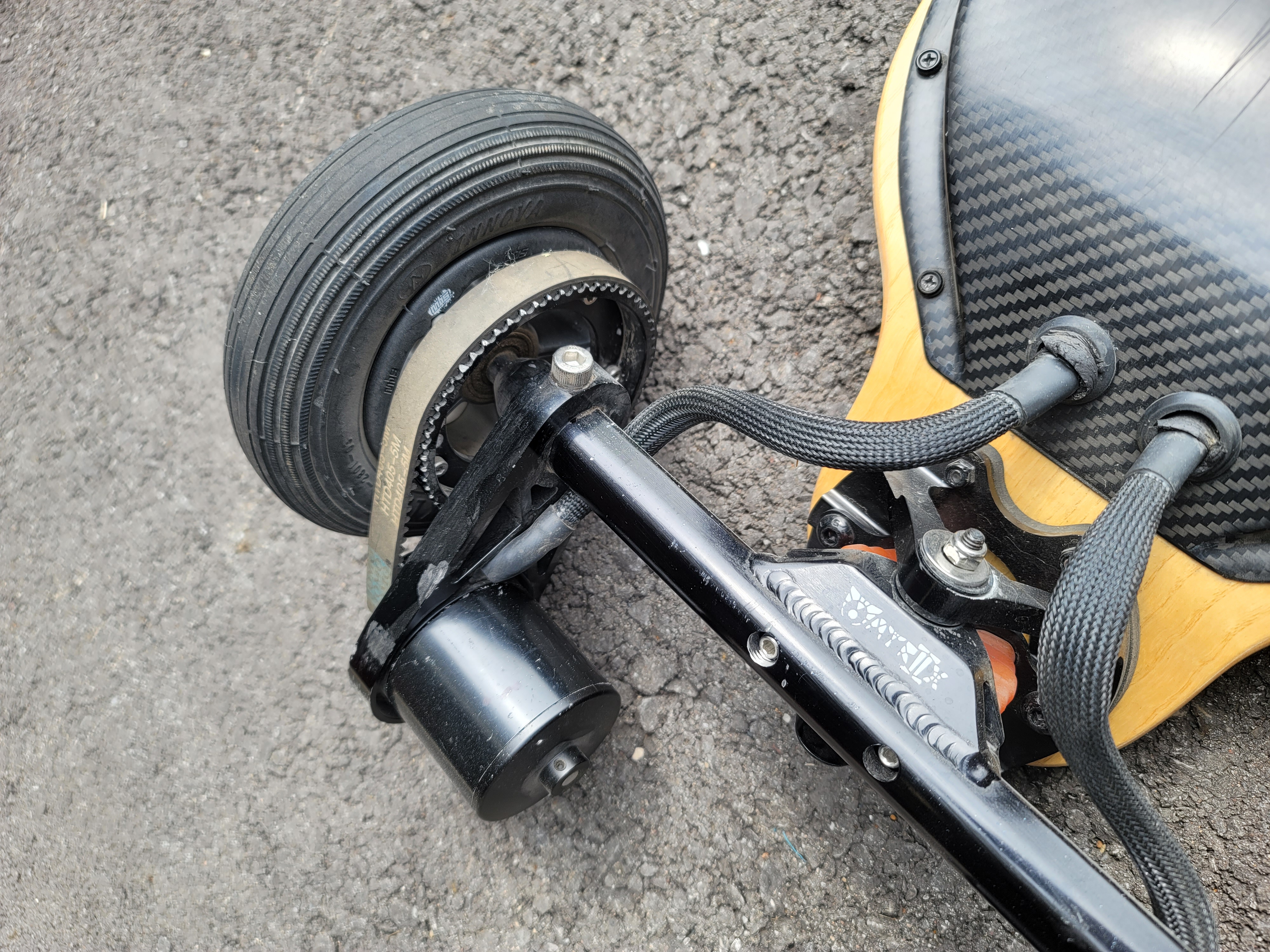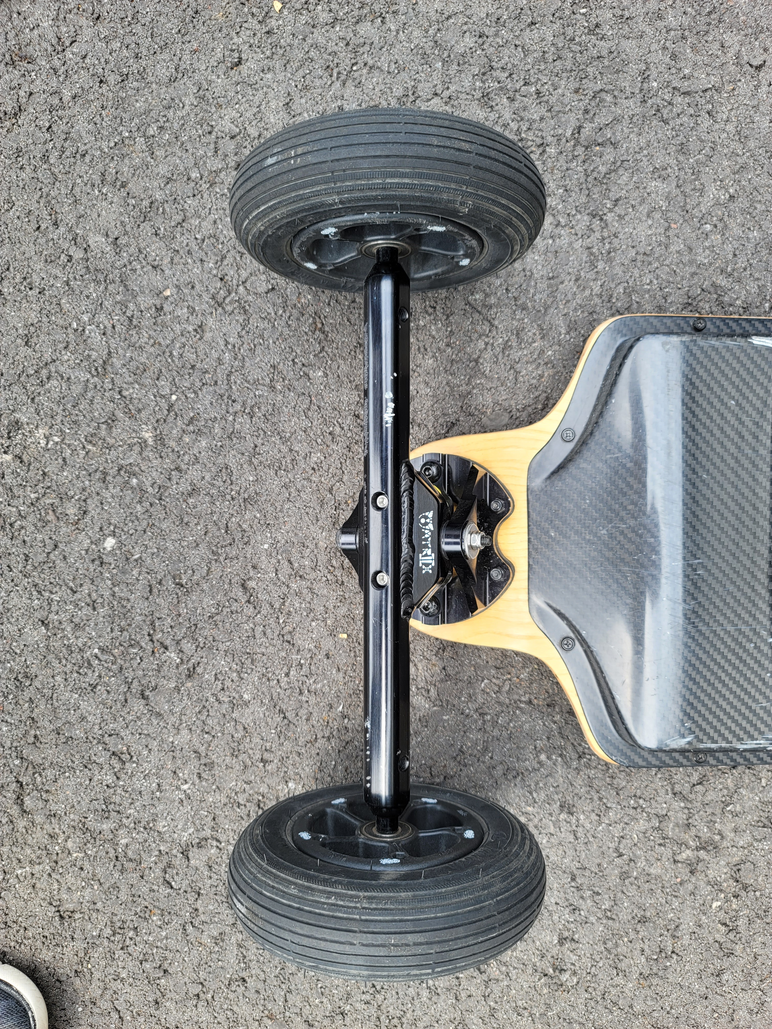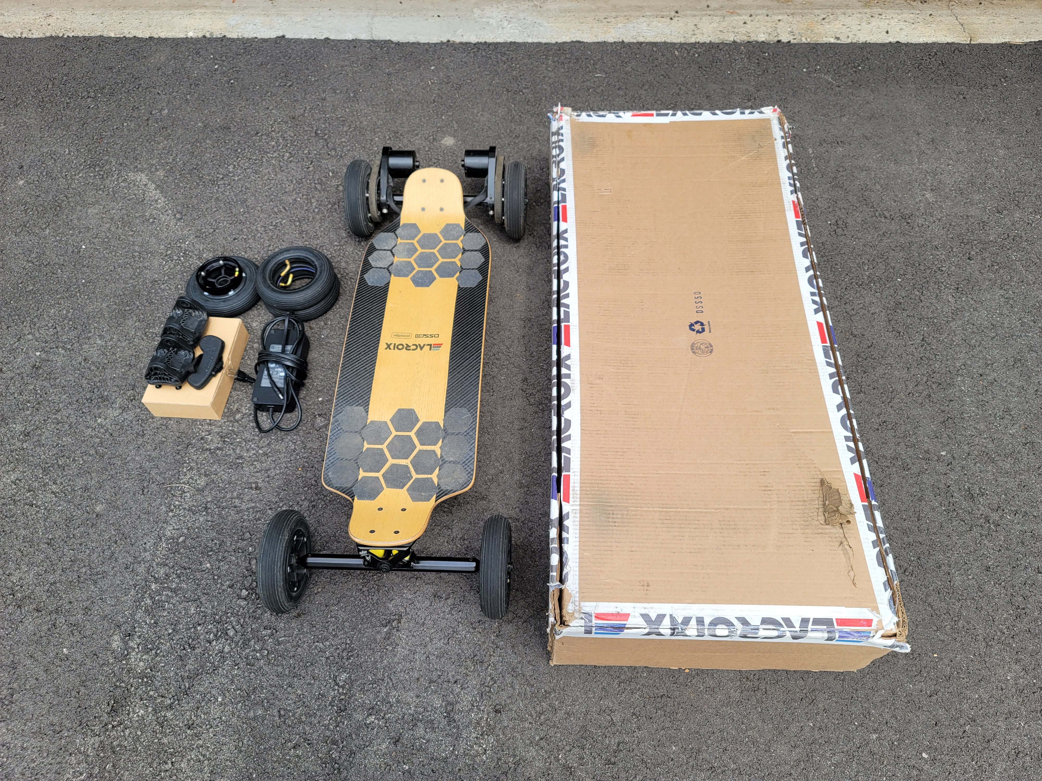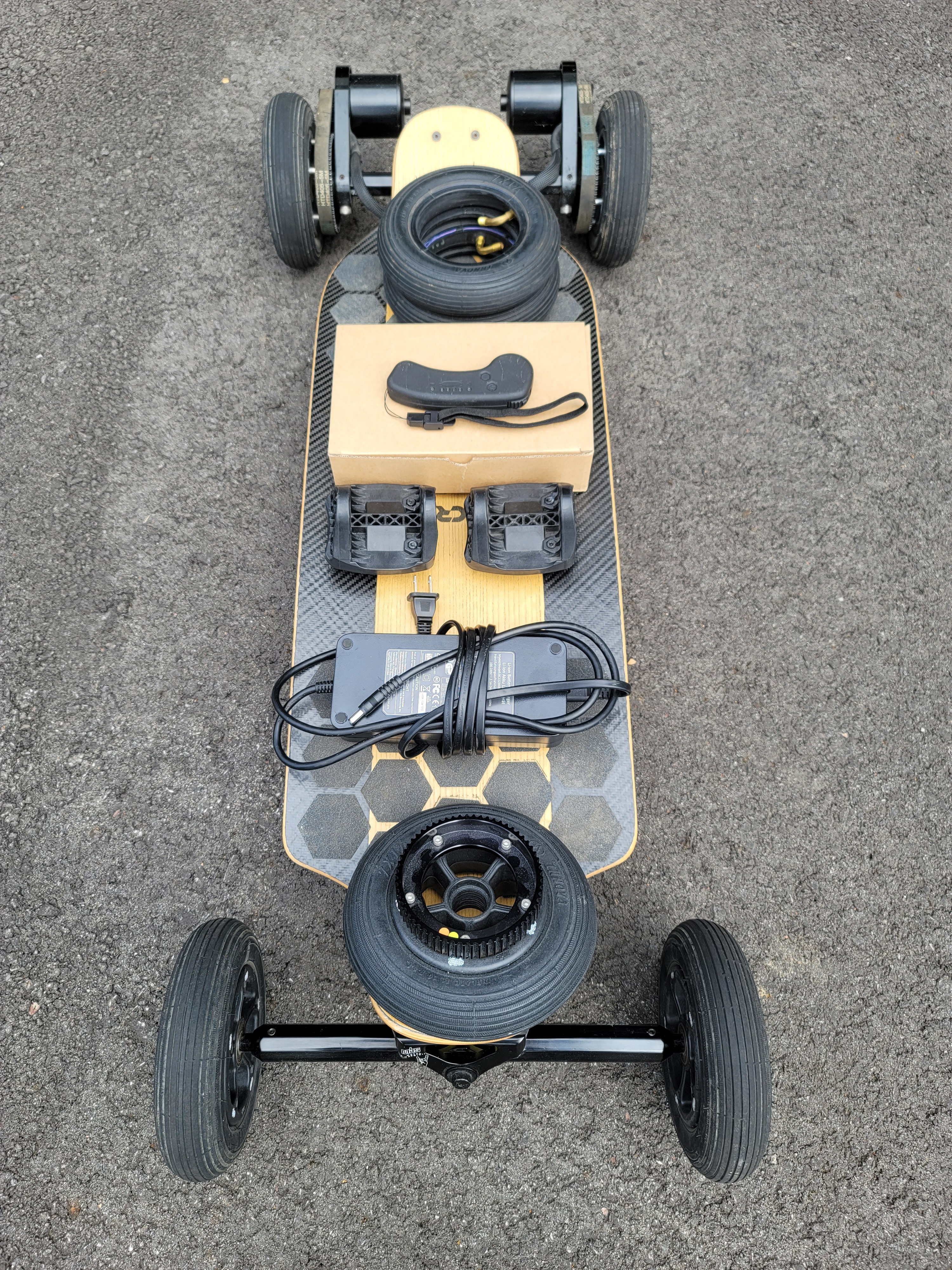 Ships in tbe original box with 2 extra tires and tubes, one compkete rear wheel and tire setup with gear, charger, remote, original accessories box with extra fasteners and grip tape octogons, original astic top trucks and manuals.