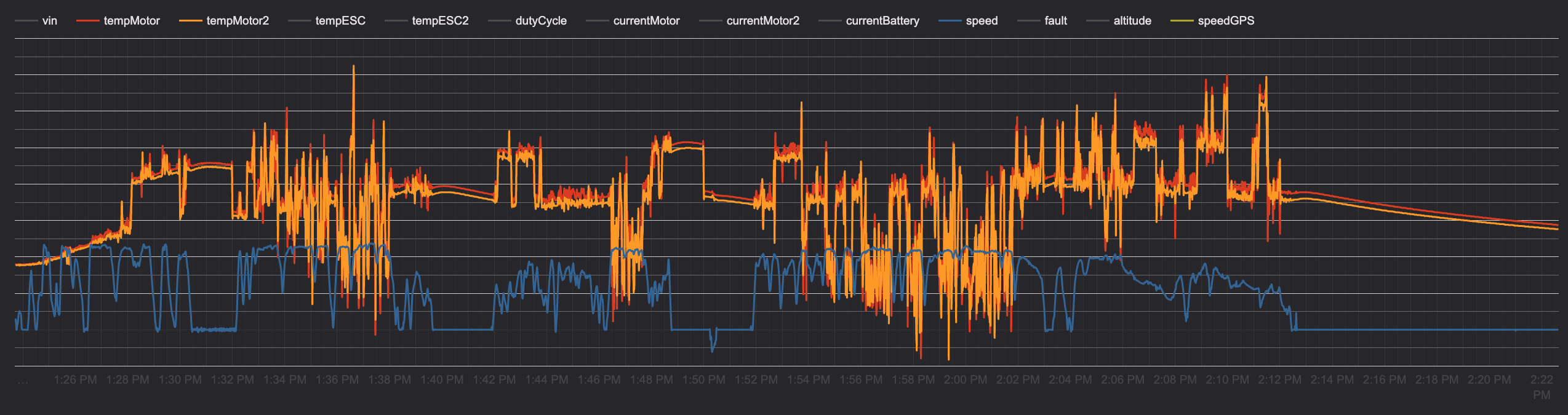 I managed to not trigger faults while collecting this data by using freesk8 app to hack the motor temp cutoff end to 200c