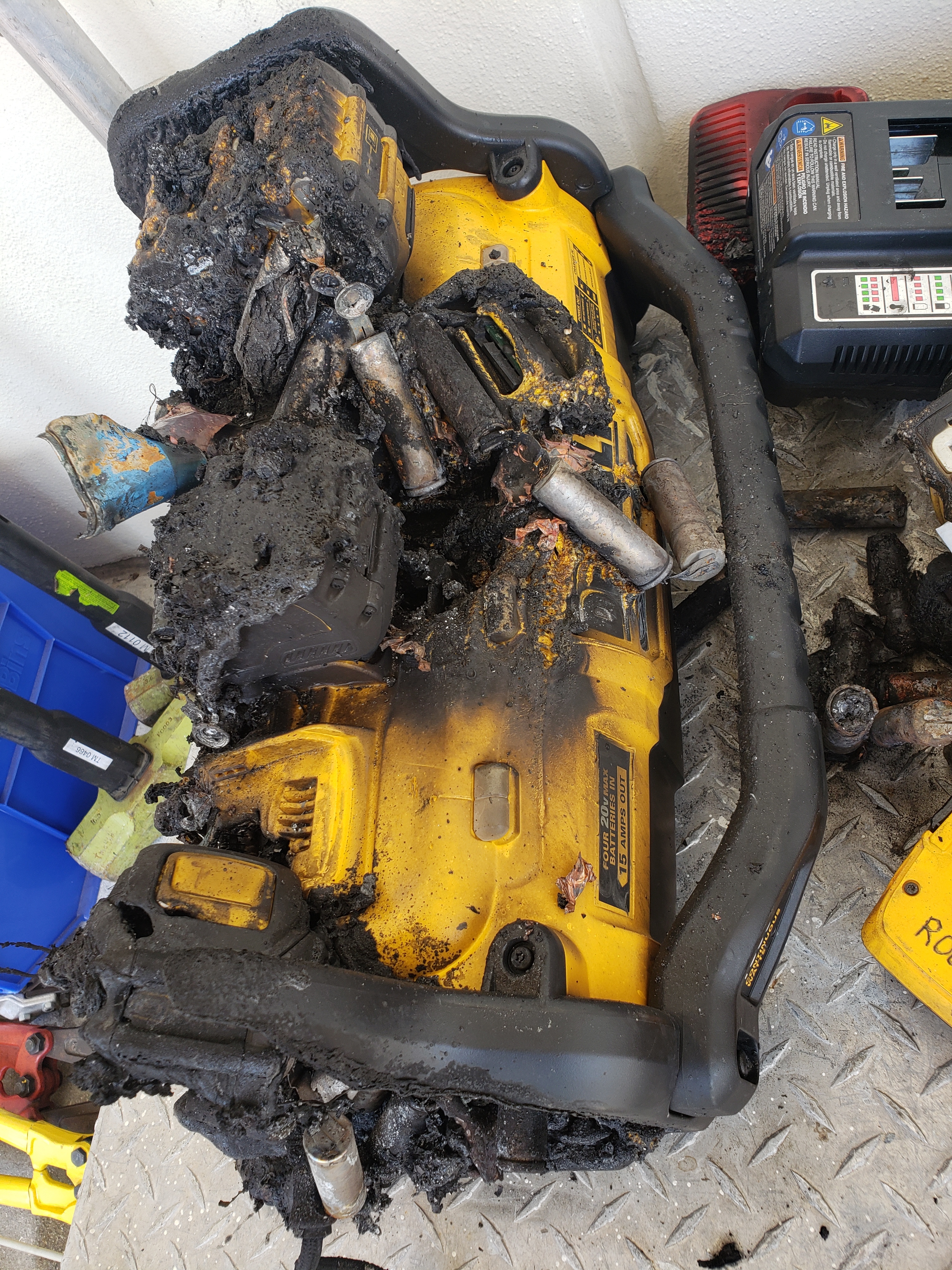 You can see the battery that started it in the pic, it’s the second from top. We have 2 of these chargers, completely full of the 9ah packs. I’ll bet this will end up costing close to $60k. It caused our sprinklers to flood the entire lower level, tool room, shop, and probably 10 offices. Total mayhem. Water restoration services have 10+ people here ripping out drywall and insulation