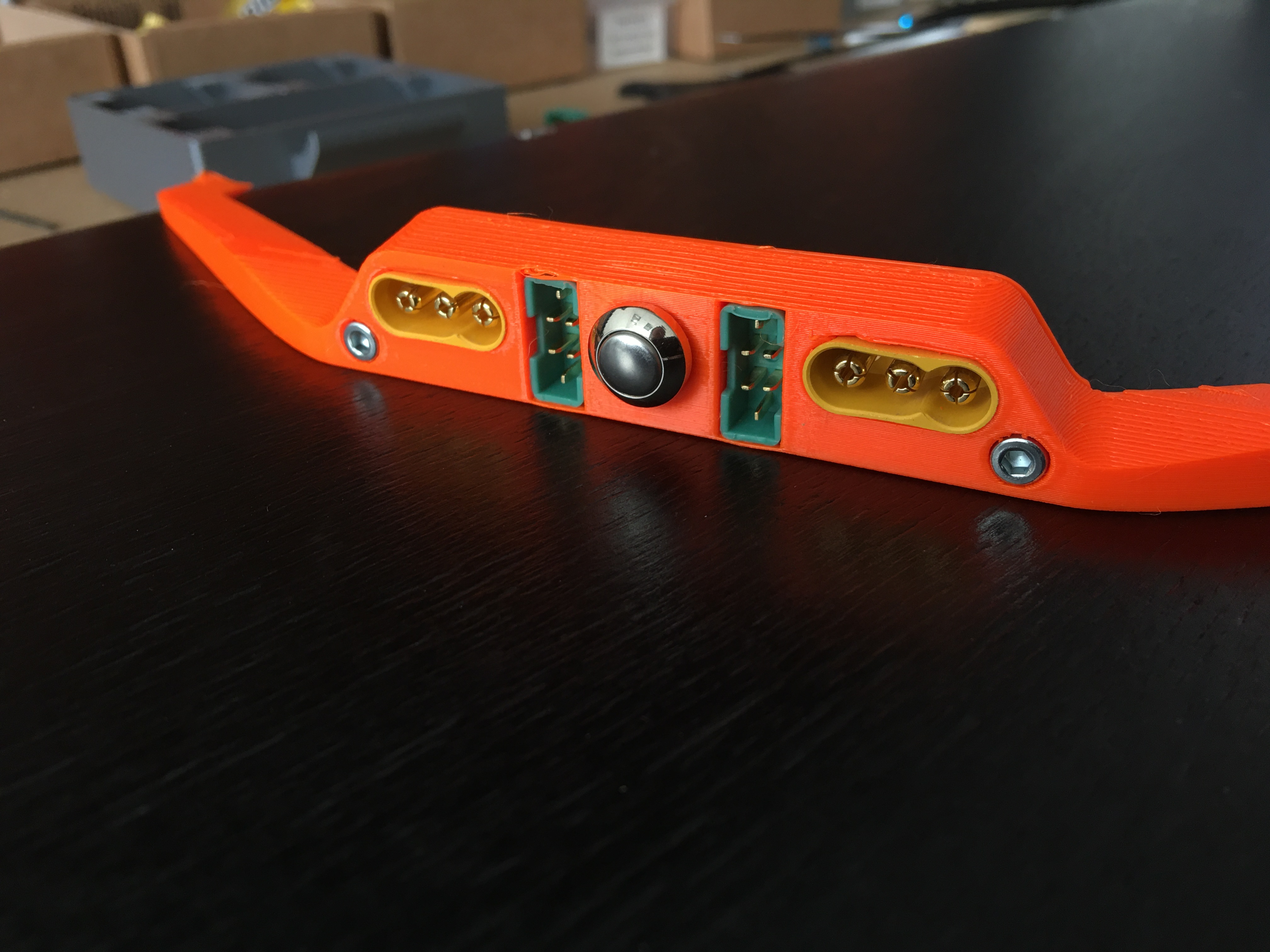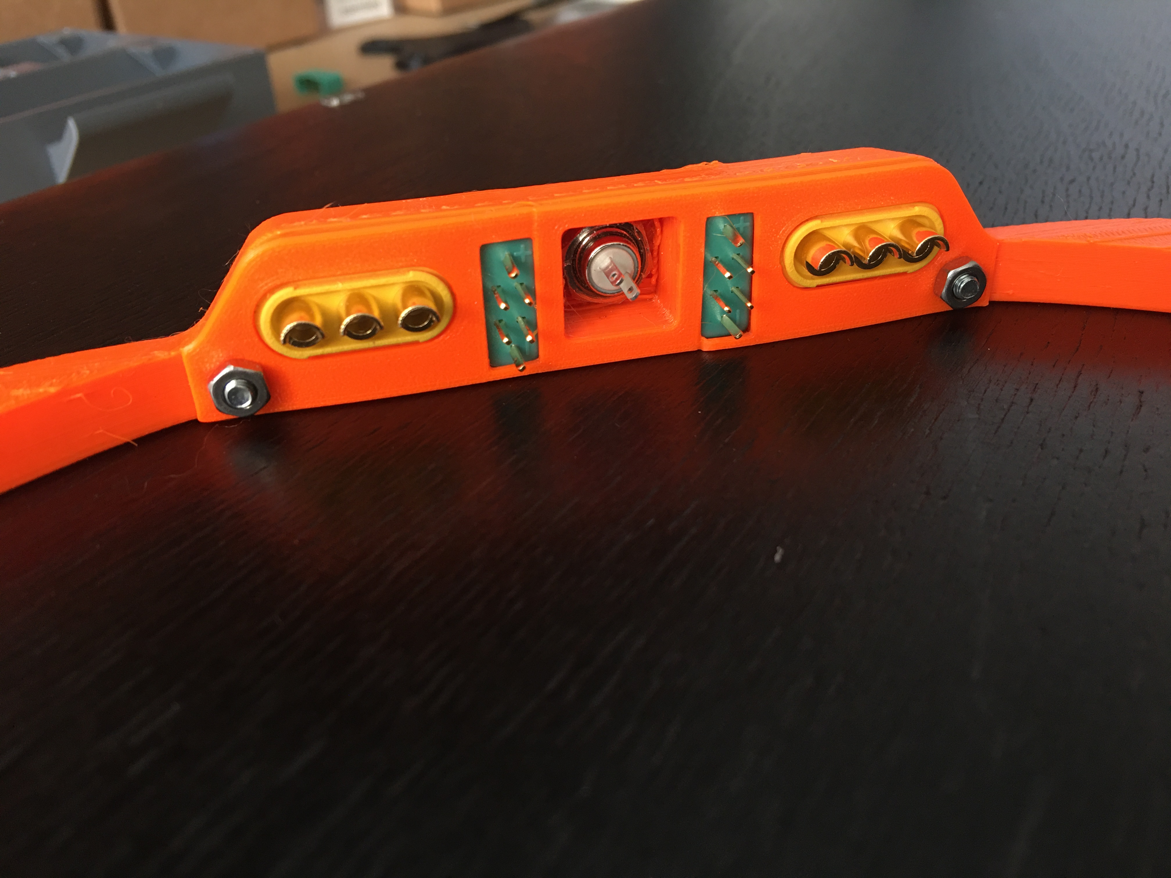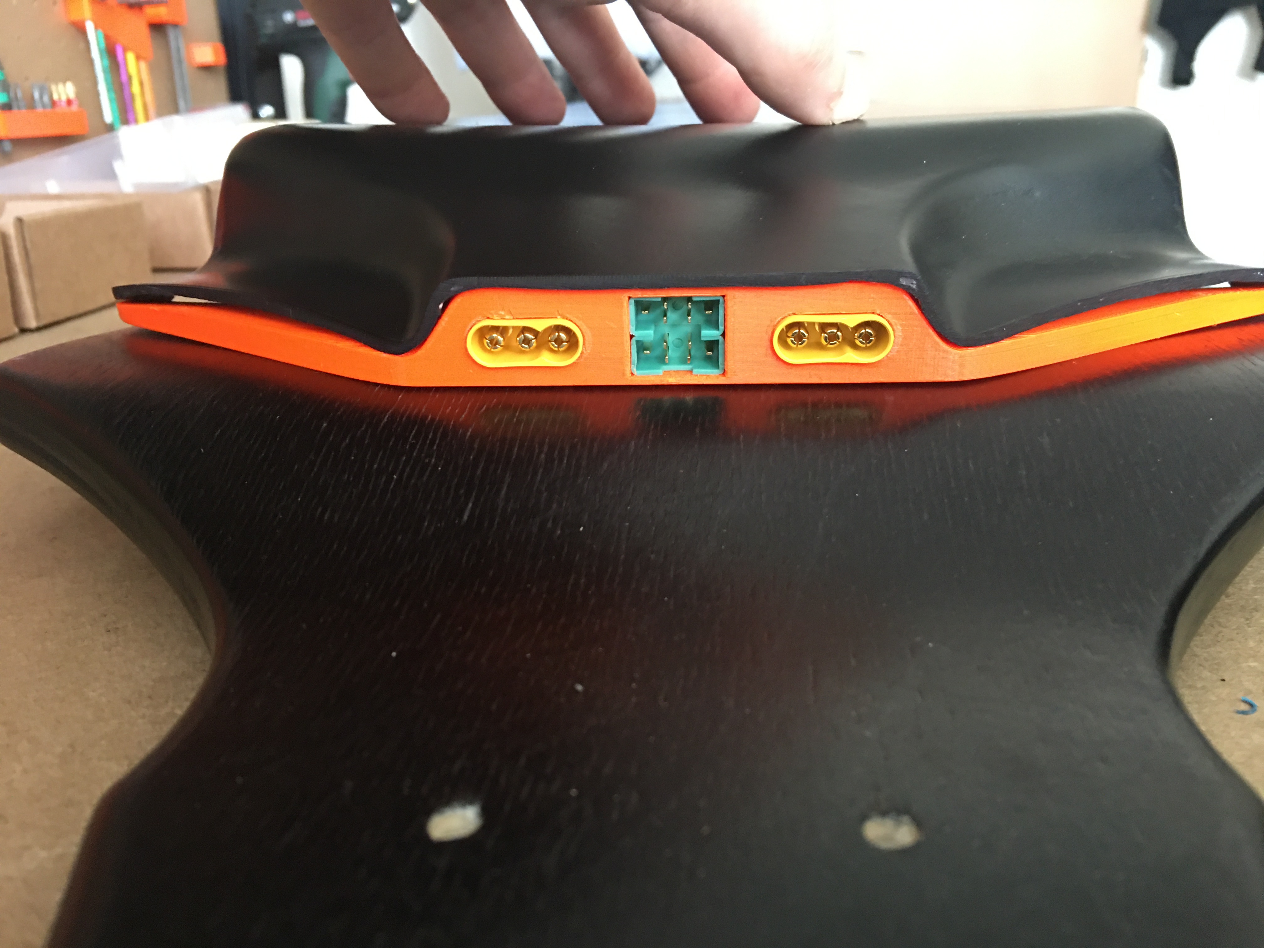 The bigger notch is for the DAVEGA cable and the two small ones are for charge cable. I plan to make a thin riser for the front truck that will hold XT30 for charging.