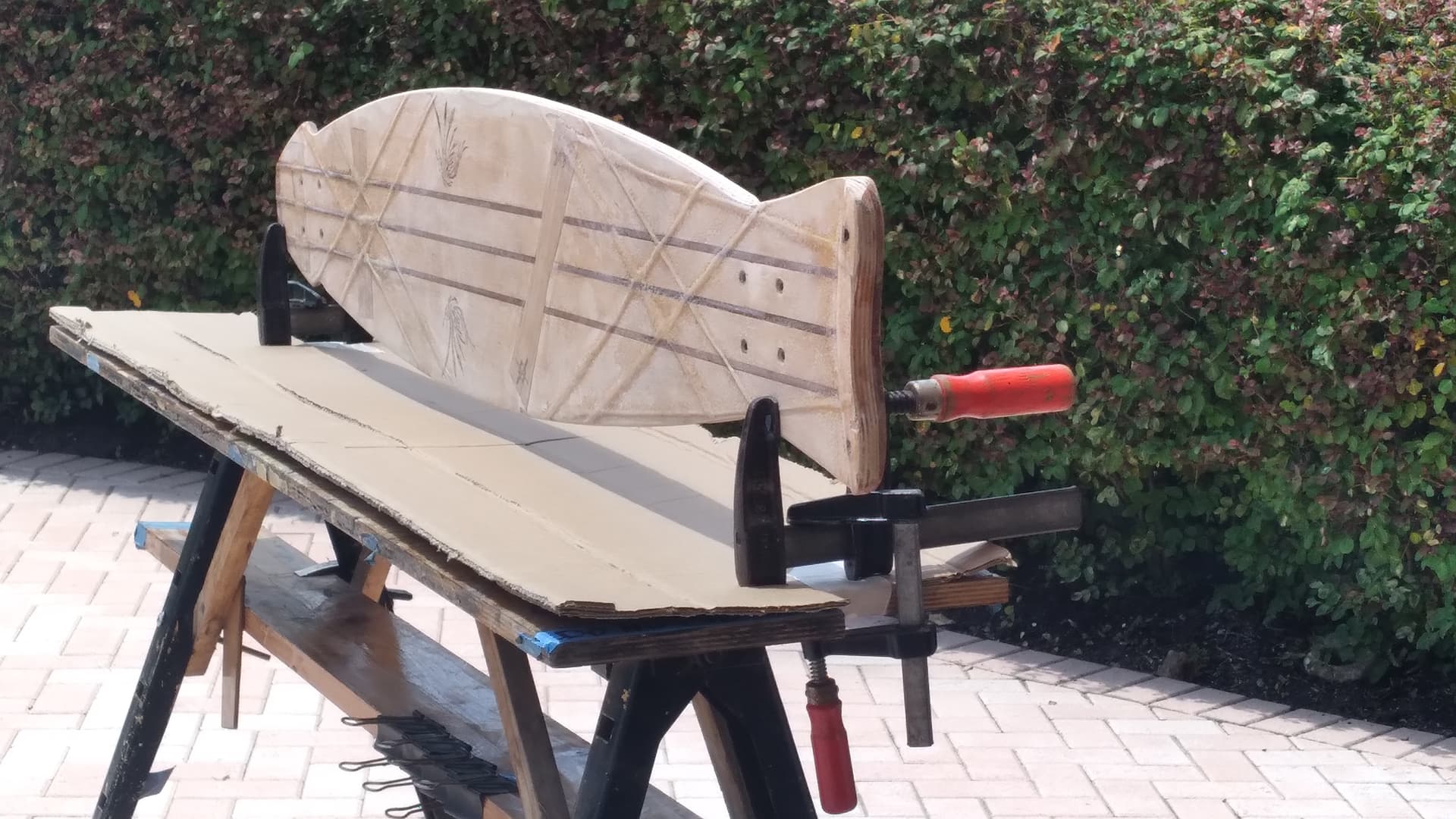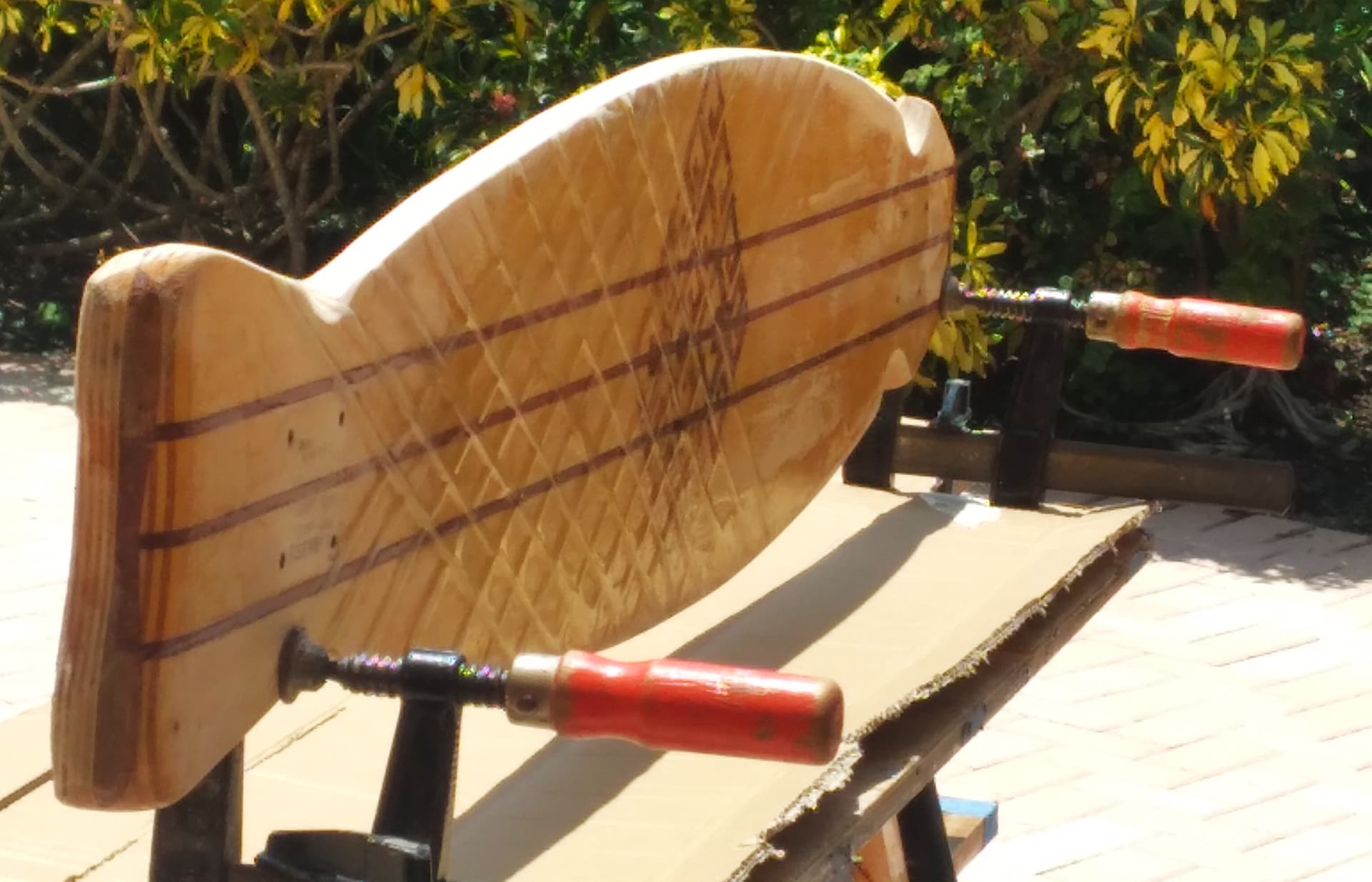 It was also my first lamination job, and because the board was shaped from a much bigger blank, Iād shaped away the harder foam, and the board was soft, and the glass job, my first or maybee second lamination without assistance, was far from good.