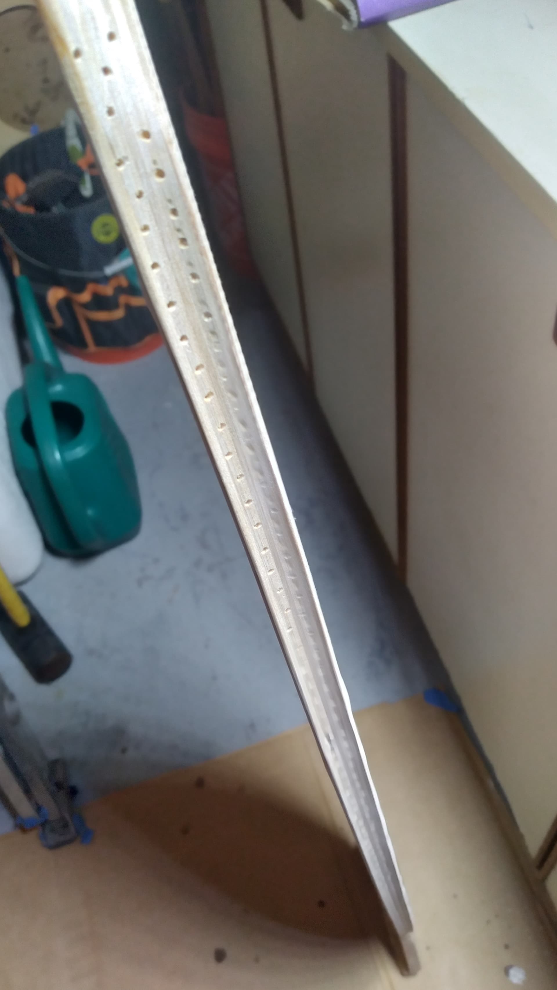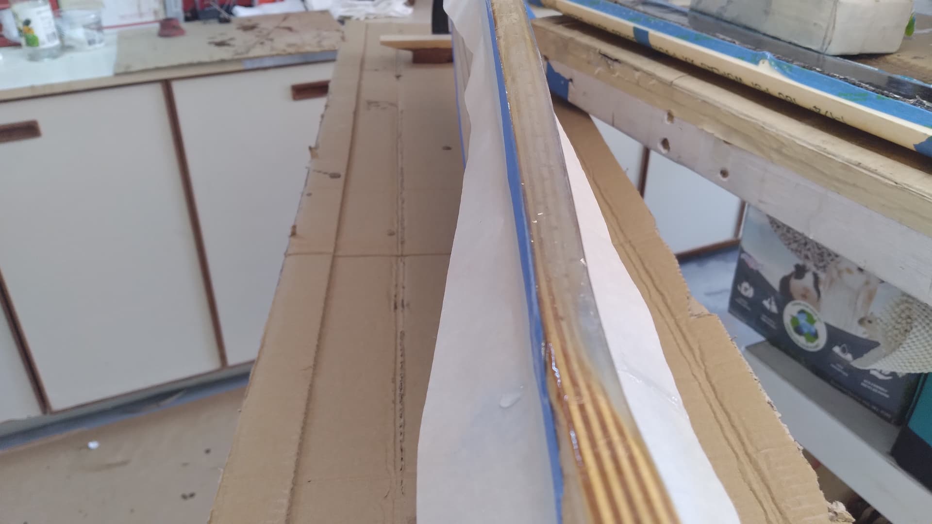 I wound up spending a huge amount of effort inlaying in some Cedar on top and below the stringer for the I beam effect, and then pulling carbon Fiber strips tightly rail to rail, to keep the two halves together, and glassed over it.
