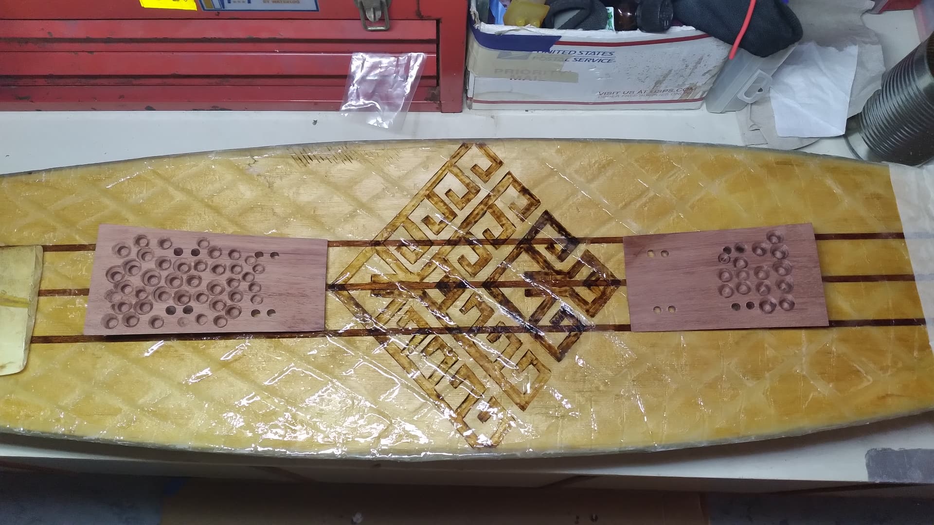 When i broke that deck, I busted out the triple stringer deck, and decided to add some White oak butterflies across the top to hold it together. That worked well, and the board got ridden hard and started getting more and more flexible. So I added the cross hatching roving strips top and bottom to stiffen it up a bit.