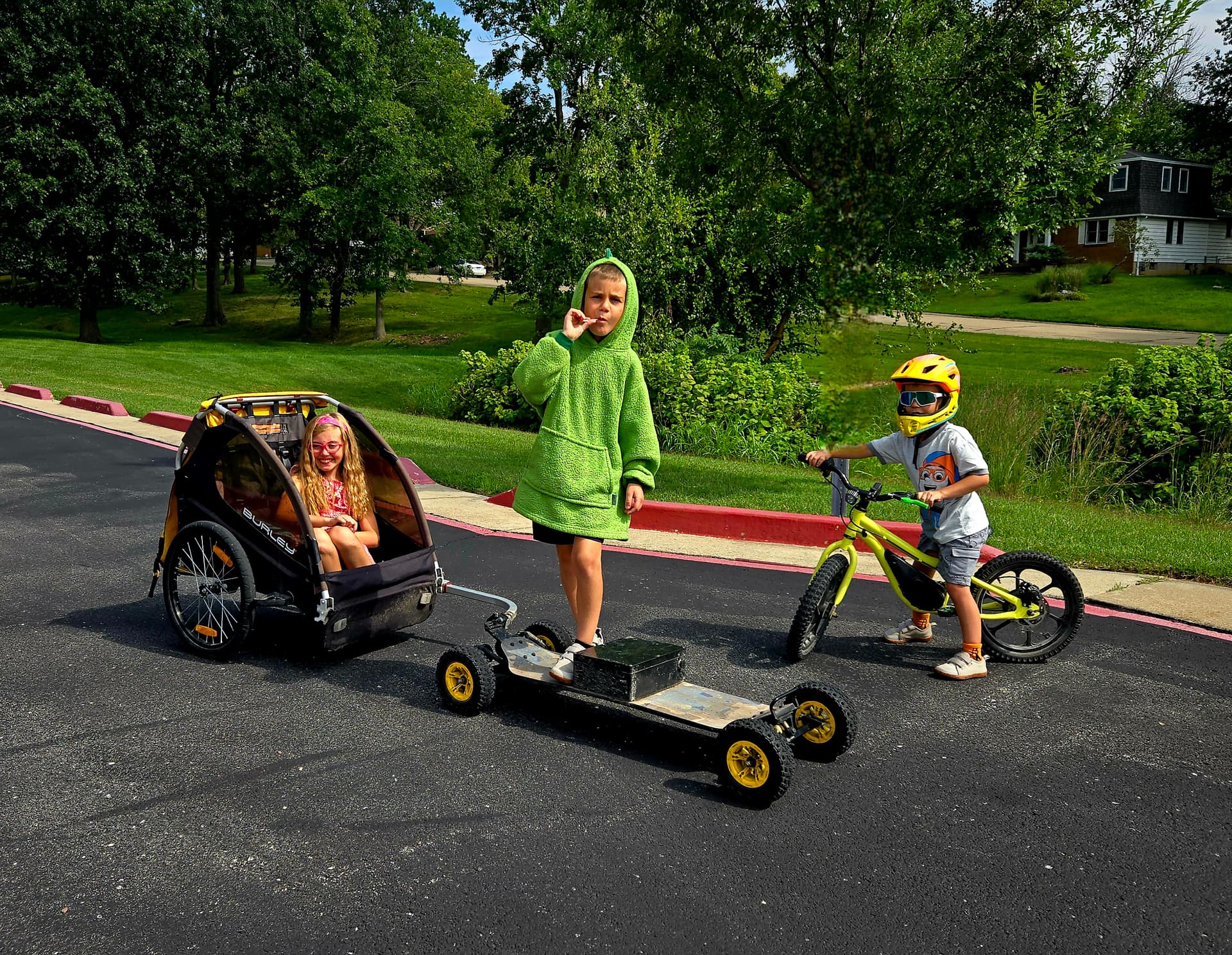 I rode the GT, and Naia rode the Death Scooter and Luca rode his bike.