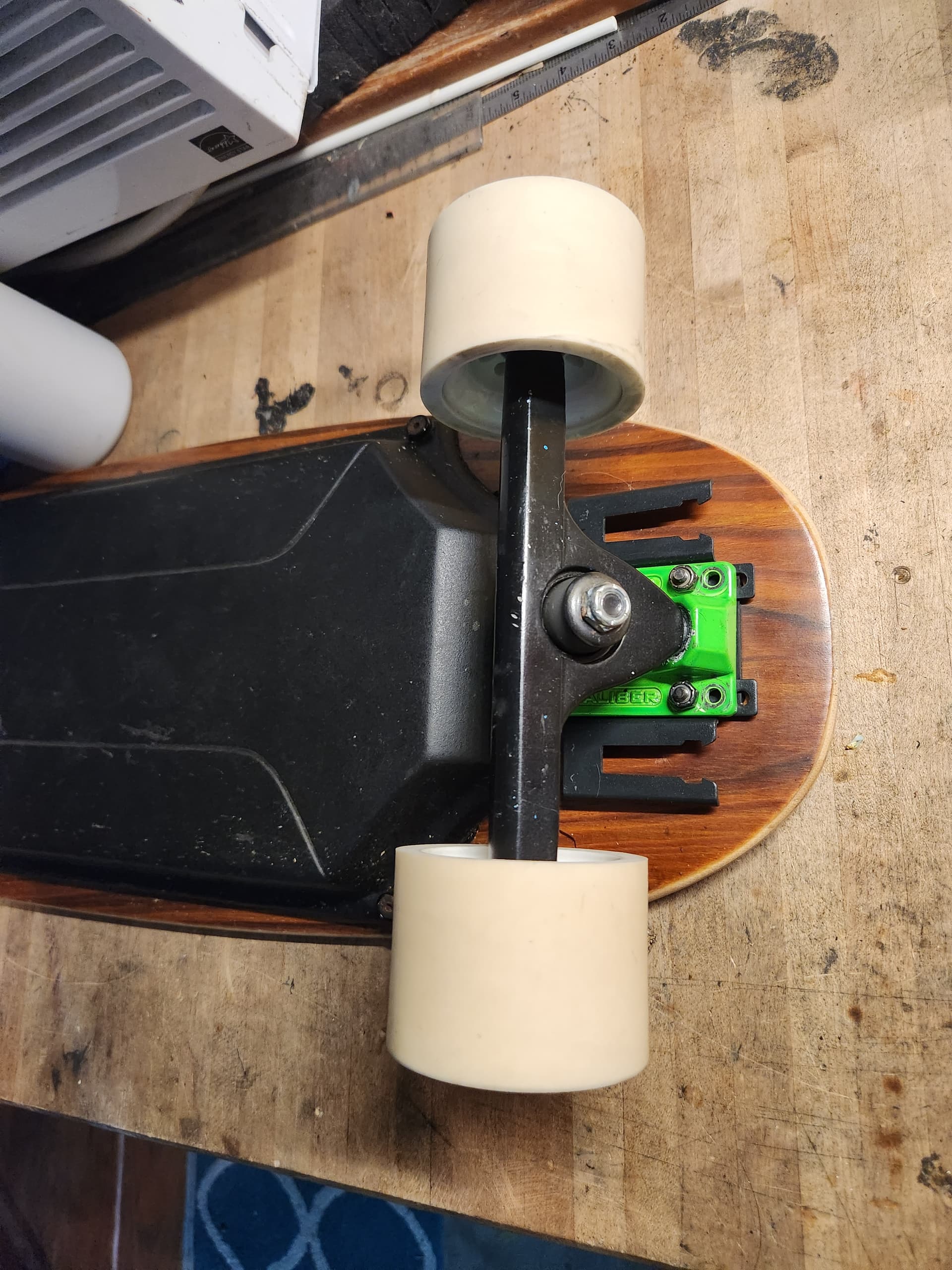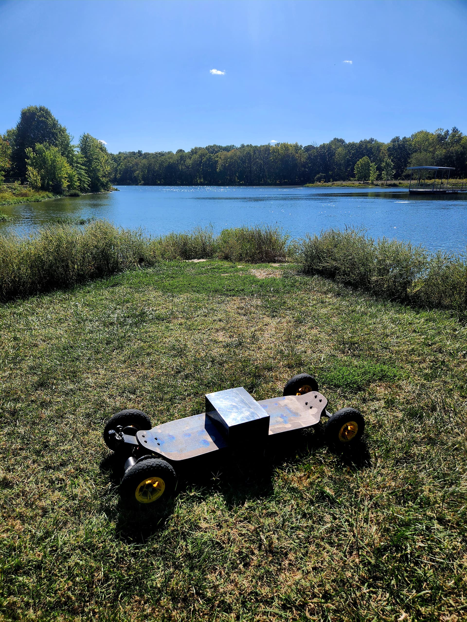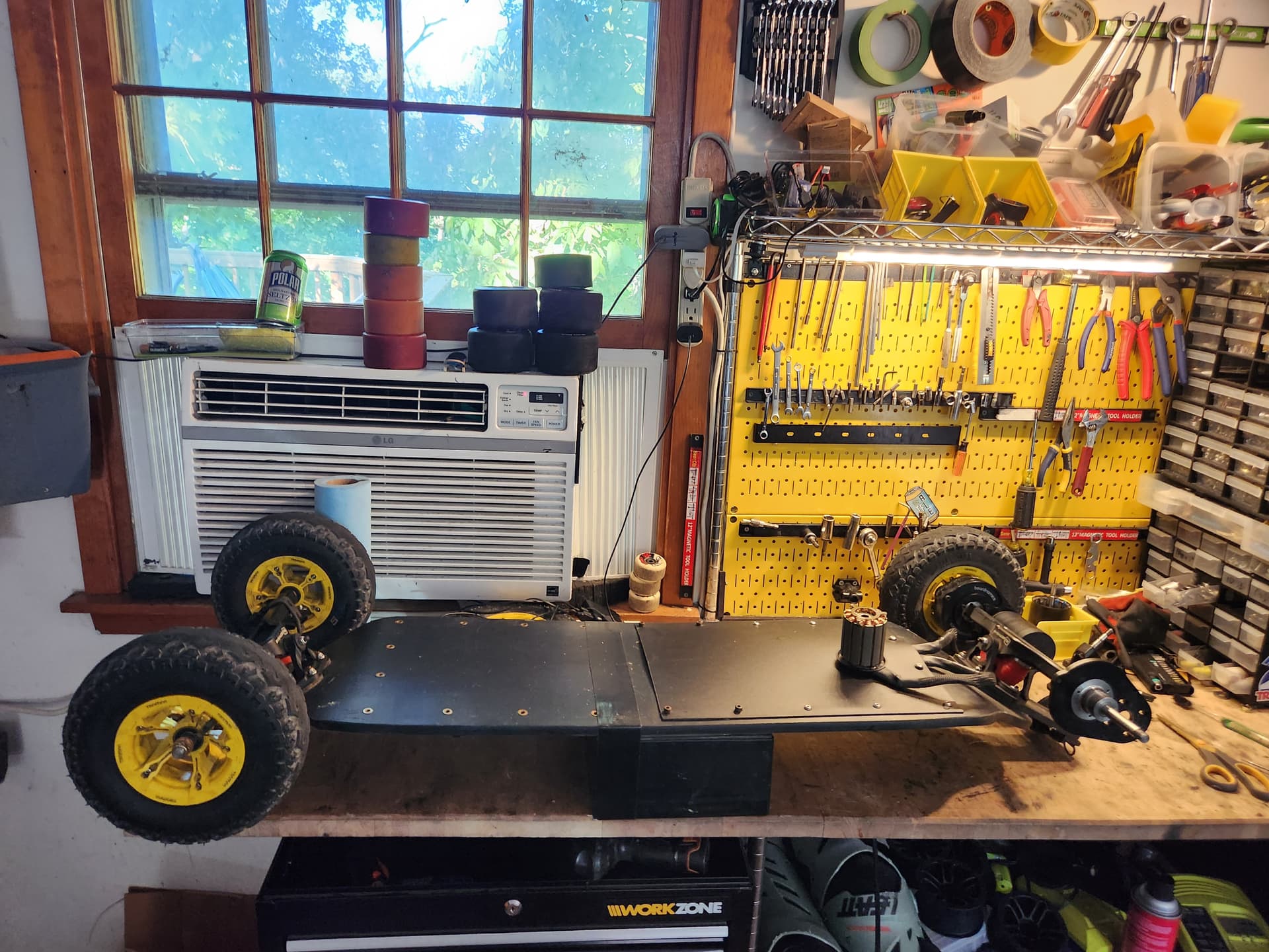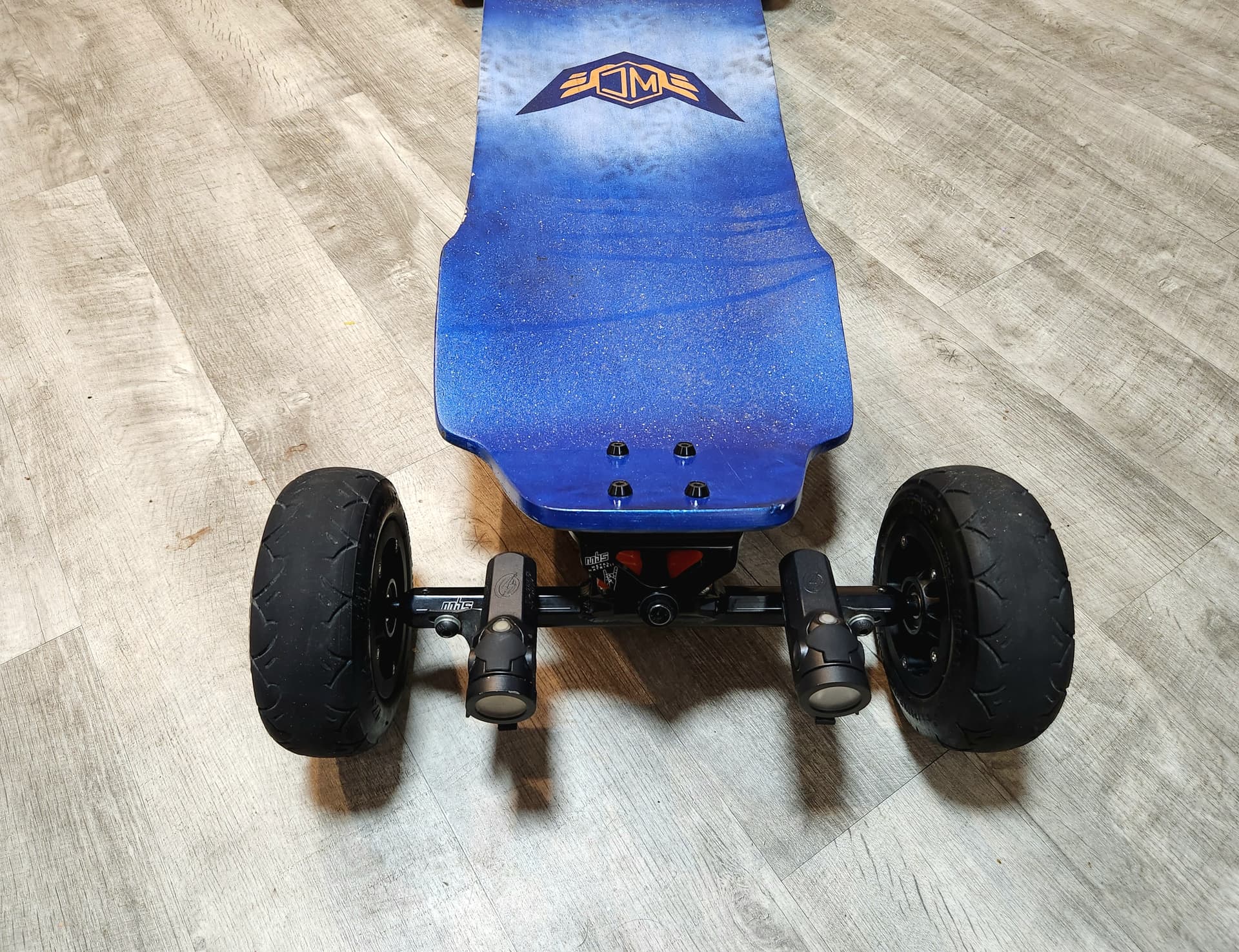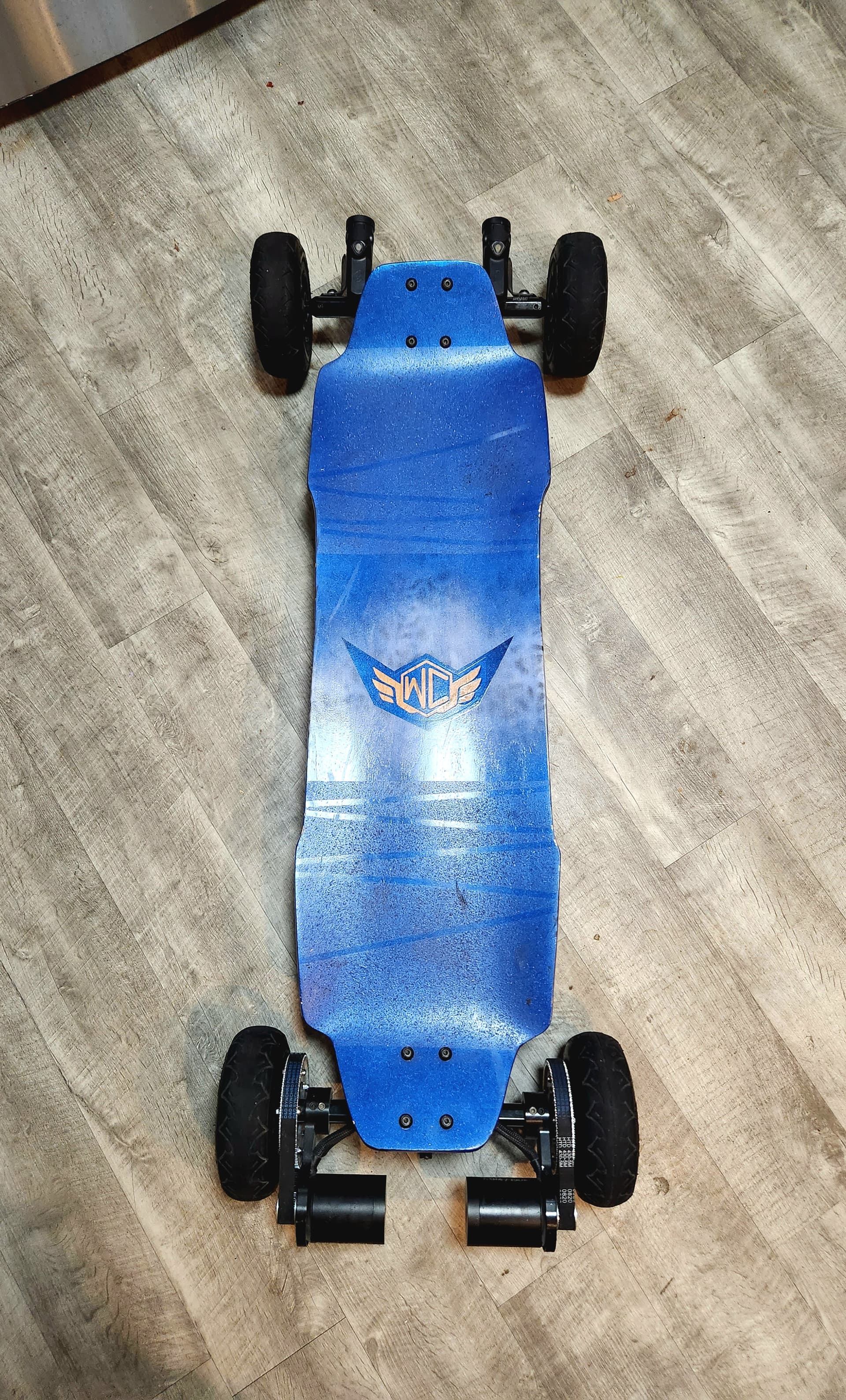 I turned 60 in June. Yea things didn’t happen all that quickly. I really was going 10mph or so and saw the obstacle in time to process it and steer some in hopes that the center of the board would clear. It has 4wheel independent suspension so it has more clearance down the centerline. I really do remember wondering why my leg betrayed me as I was actually falling. Think: You take a big running step and stumble enough that your other foot doesn’t have the chance get fully under you. The thoughts of embarrassment probably came after actually standing back up since it should have been a real easy runout. Thought I’d rolled my ankle is the soft dirt, but nothing hurt. Wasn’t until I’d flipped the board over and verified that nothing was broken that my right calf started to feel like I’d taken a knee strike to the muscle. After stretching for a bit I continued the off road portion of the ride for another 7 or 8 miles and was fine. The next day though…. Dayum I hate getting old! Here’s the board. I think Propel lists the weight at 65lbs but I had the second battery lashed to the deck between my feet at the time, so I’m sure it’s 70lbs.