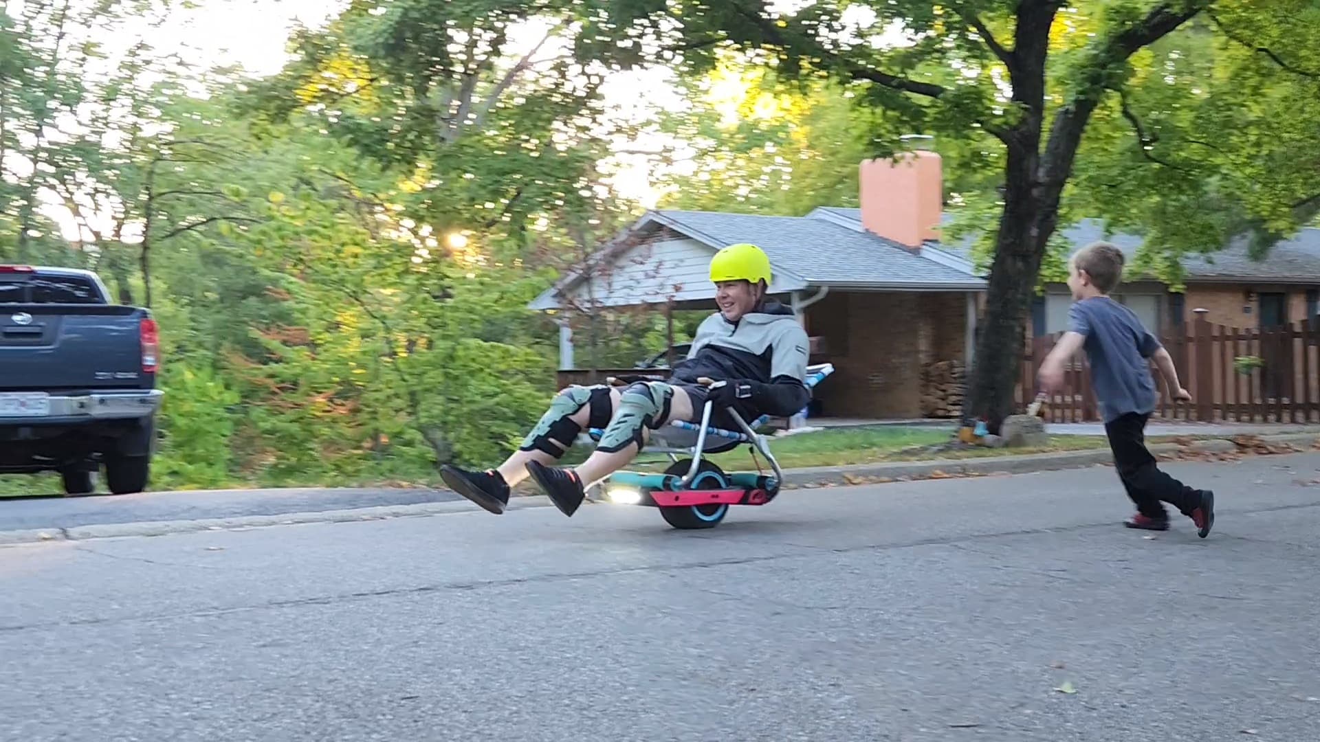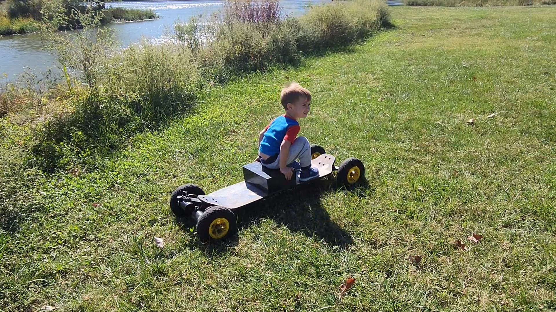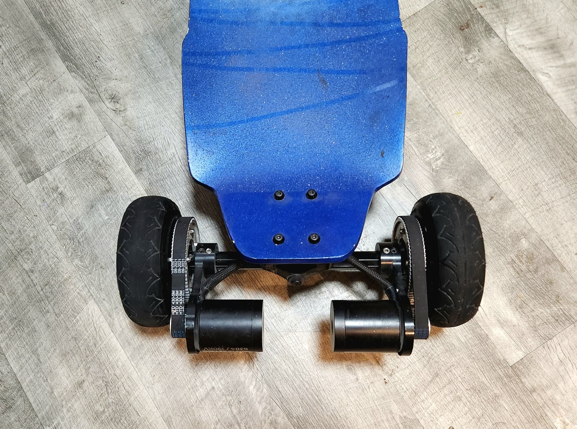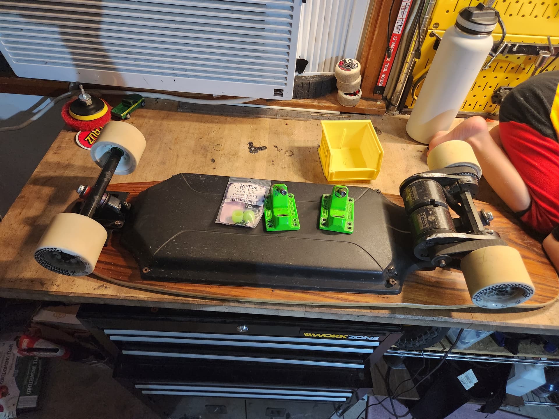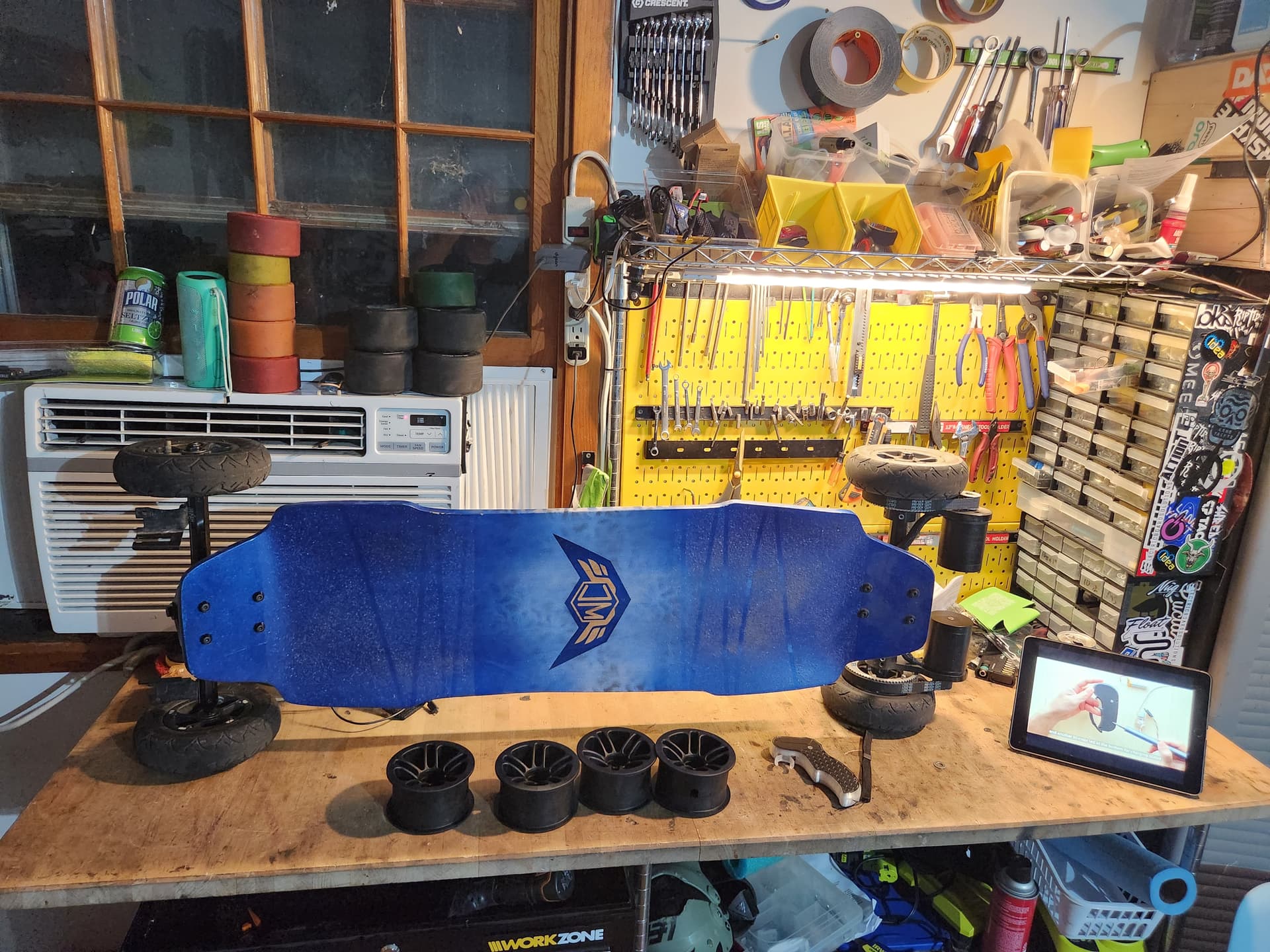 I turned 60 in June. Yea things didn’t happen all that quickly. I really was going 10mph or so and saw the obstacle in time to process it and steer some in hopes that the center of the board would clear. It has 4wheel independent suspension so it has more clearance down the centerline. I really do remember wondering why my leg betrayed me as I was actually falling. Think: You take a big running step and stumble enough that your other foot doesn’t have the chance get fully under you. The thoughts of embarrassment probably came after actually standing back up since it should have been a real easy runout. Thought I’d rolled my ankle is the soft dirt, but nothing hurt. Wasn’t until I’d flipped the board over and verified that nothing was broken that my right calf started to feel like I’d taken a knee strike to the muscle. After stretching for a bit I continued the off road portion of the ride for another 7 or 8 miles and was fine. The next day though…. Dayum I hate getting old! Here’s the board. I think Propel lists the weight at 65lbs but I had the second battery lashed to the deck between my feet at the time, so I’m sure it’s 70lbs.