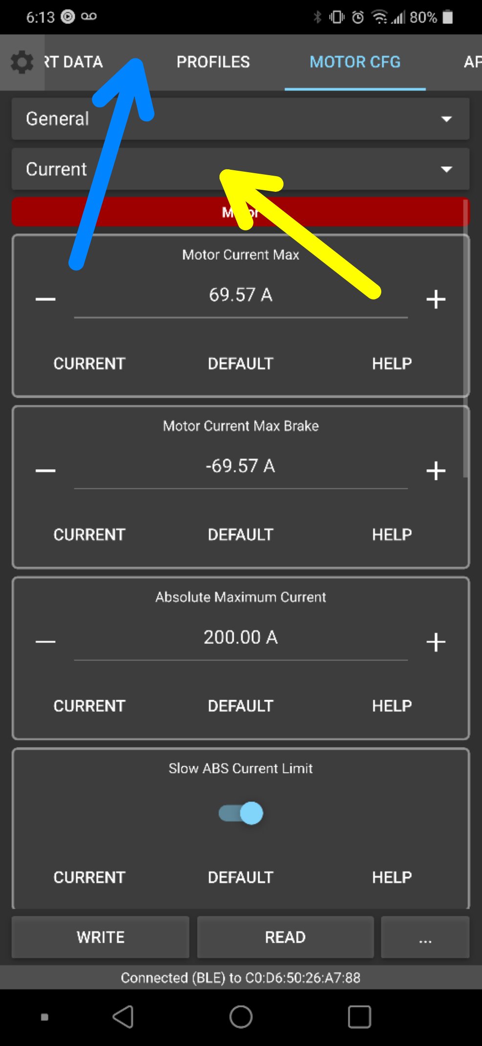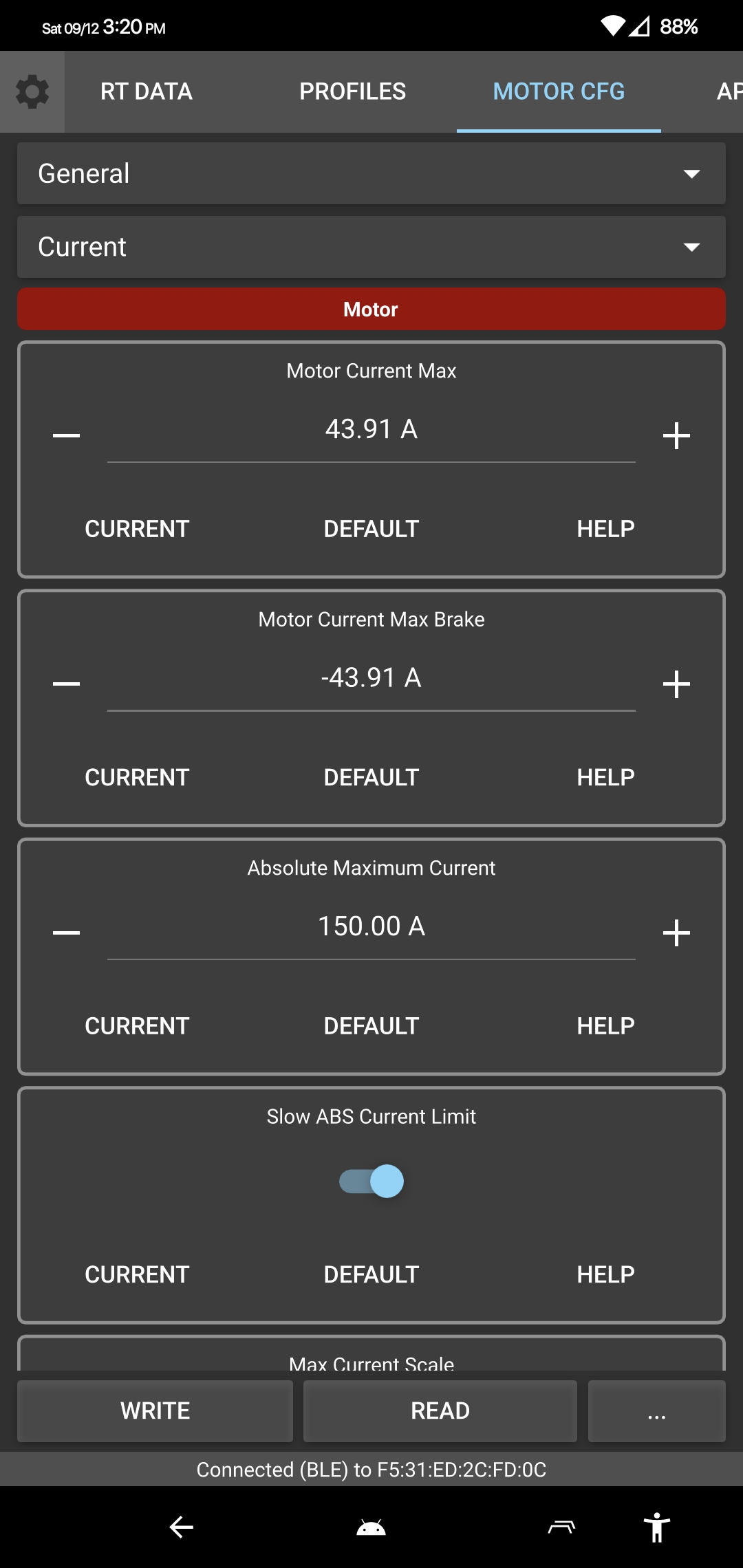 Lol there’s your problem. Battery current max is set to 99 on all 4 vescs. That needs to be 10-15 each. And again, we need to know more about the battery before setting that.