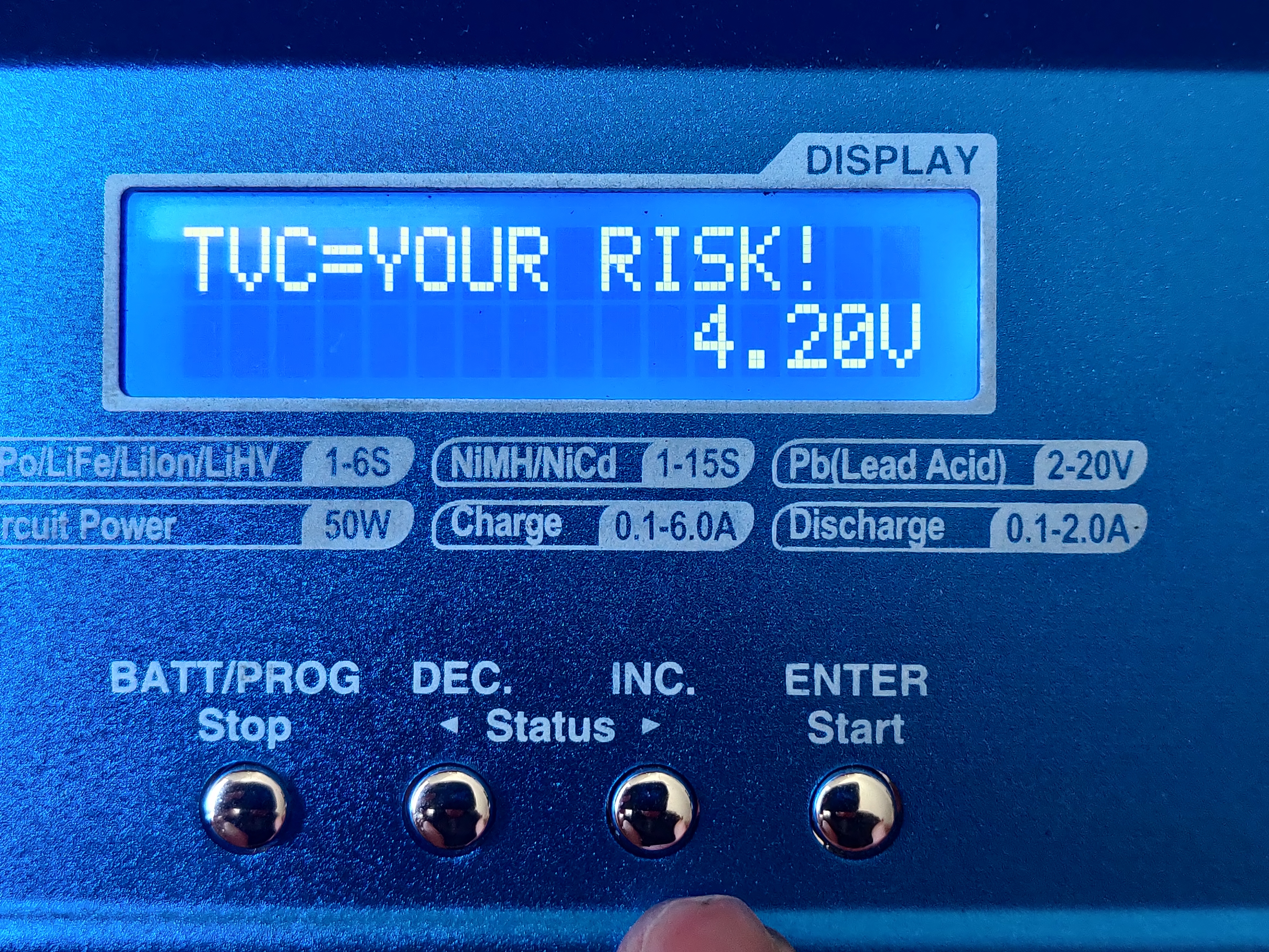 Go to Batt memory - confirm place 1 - choose battery type and enter - from there press left or right until you get to TVC - YOUR OWN RISK