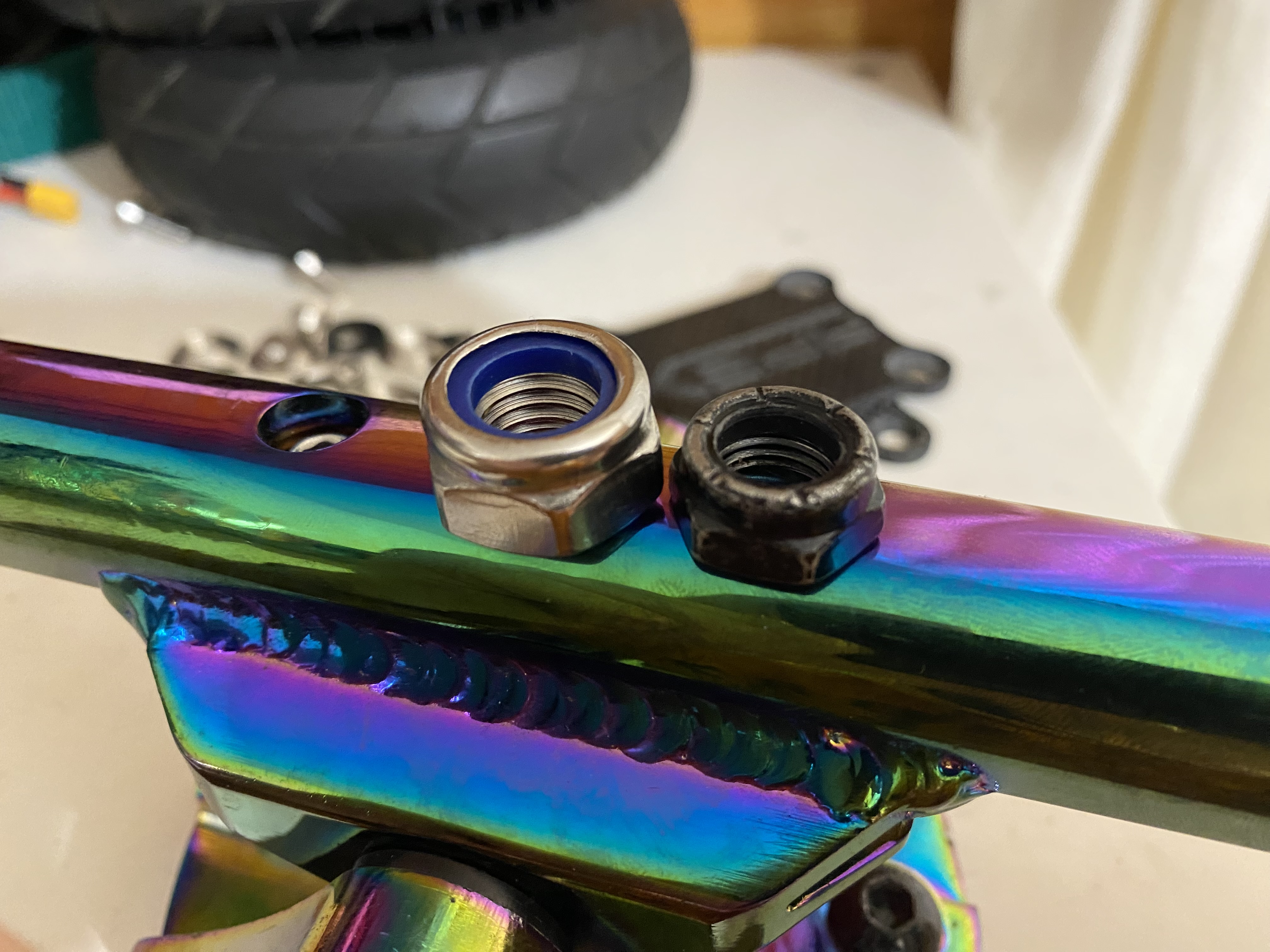 Standard M12 is a pitch of 1.75, I’m planning on M12x1.25 since more turns holding on the wheel is nice. Pictured is standard M12 vs stock Matrix 2 nut. I could try make thinner nuts on the lathe as well.