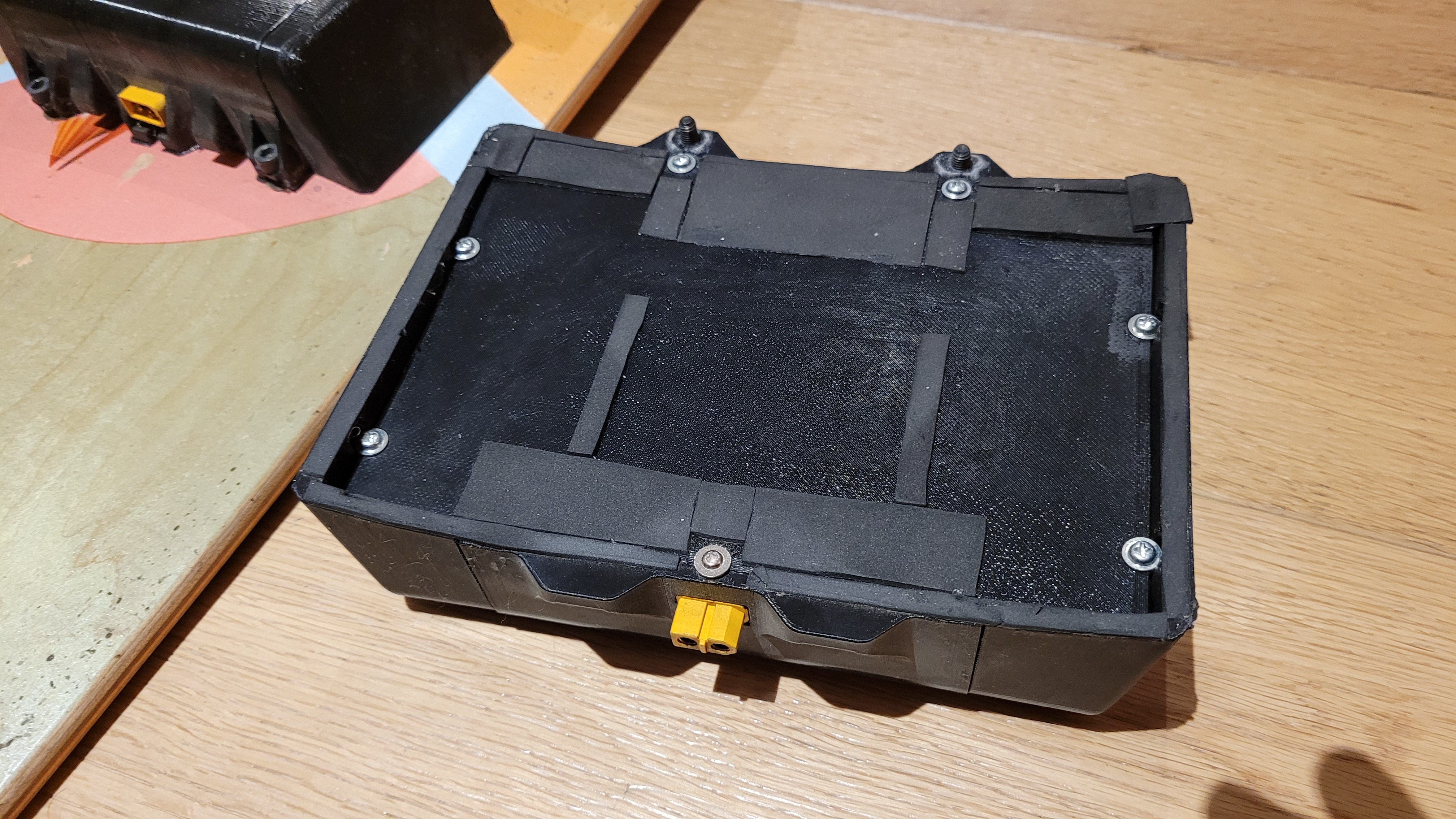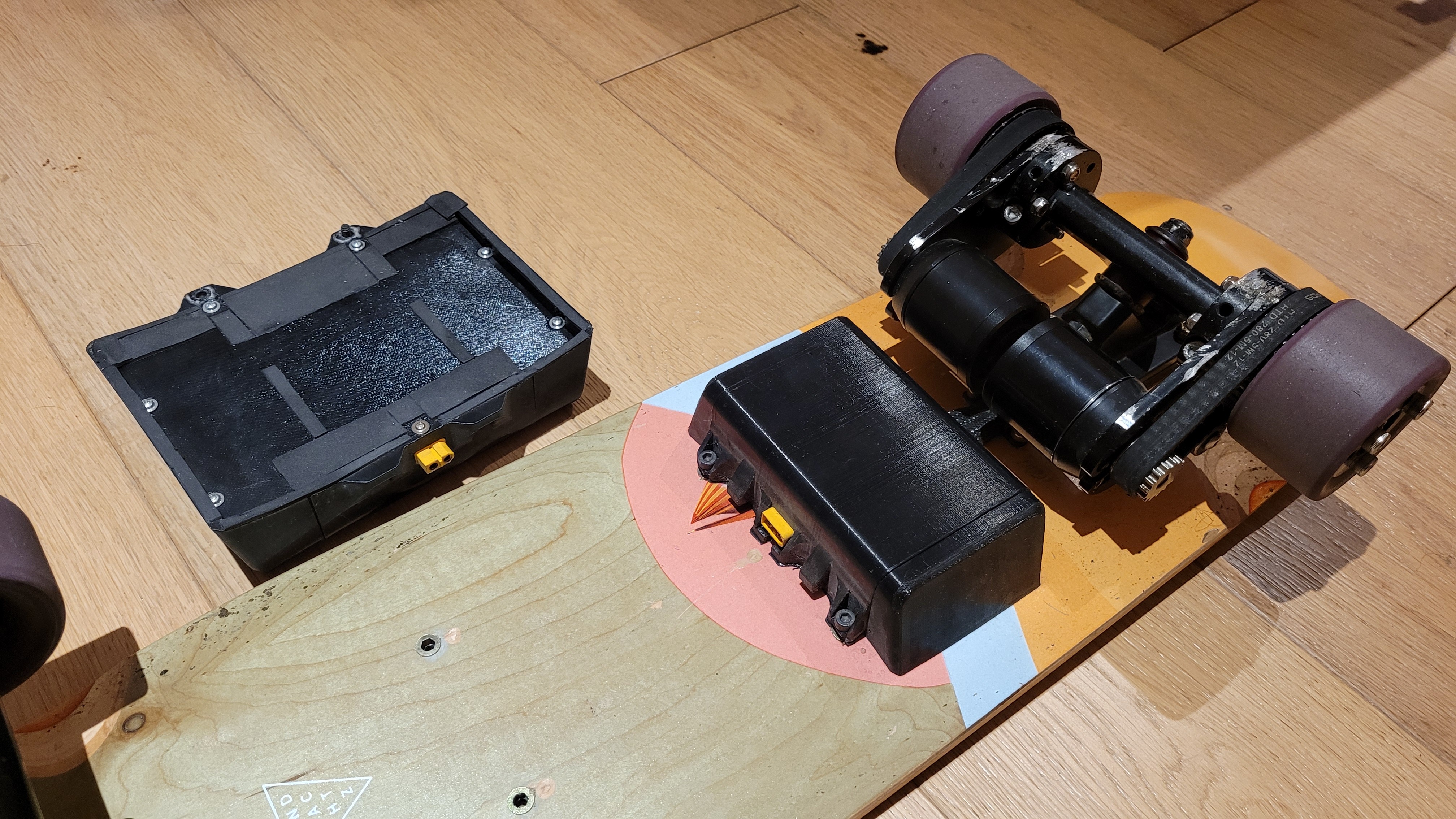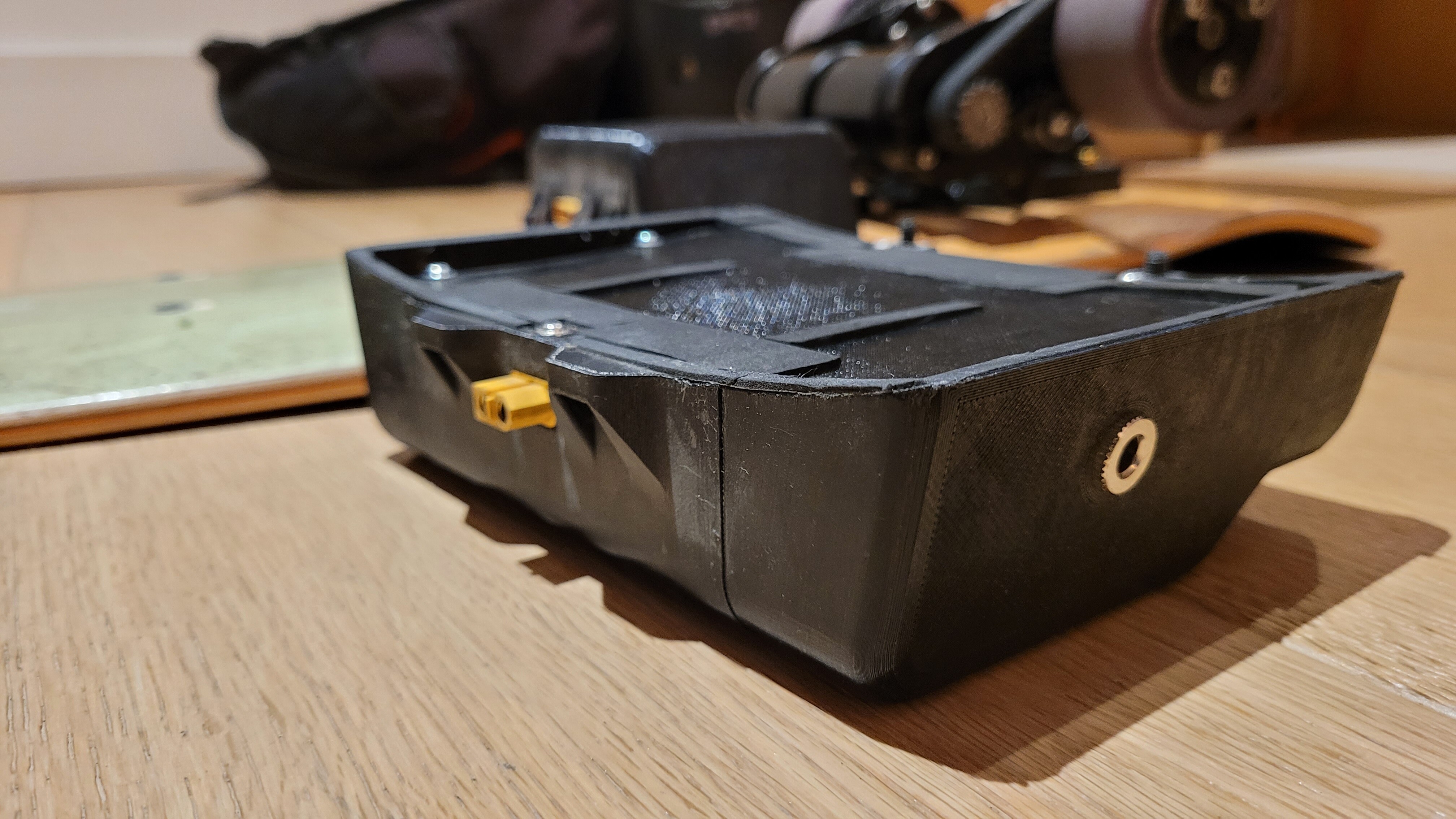 The interlocking enclosure isn’t perfect. I definitely need to redesign the VESC enclosure to support the battery better. I thought I designed it well enough, but I’ve noticed some cracking near the bolts. I superglued it and it’s been fine since, but ideally it’ll need to replaced so it can better support most of the entire weight of the battery.