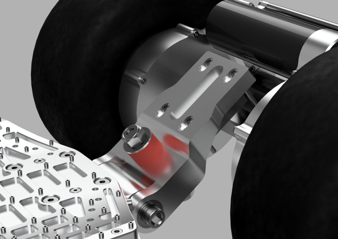 Also there’s one ride height option added into the swingarm itself, there’s a 12mm riser which can be either above or below the swingarm, changing height. The picture shows both positions filled but only one of them will be filled at a time. It still allows the swingarm base to be clamped from both the top by the chassis and the bottom by the bellypan, this way the bellypan adds significant torsional rigidity to the system, since it’s also bolted to the chassis.