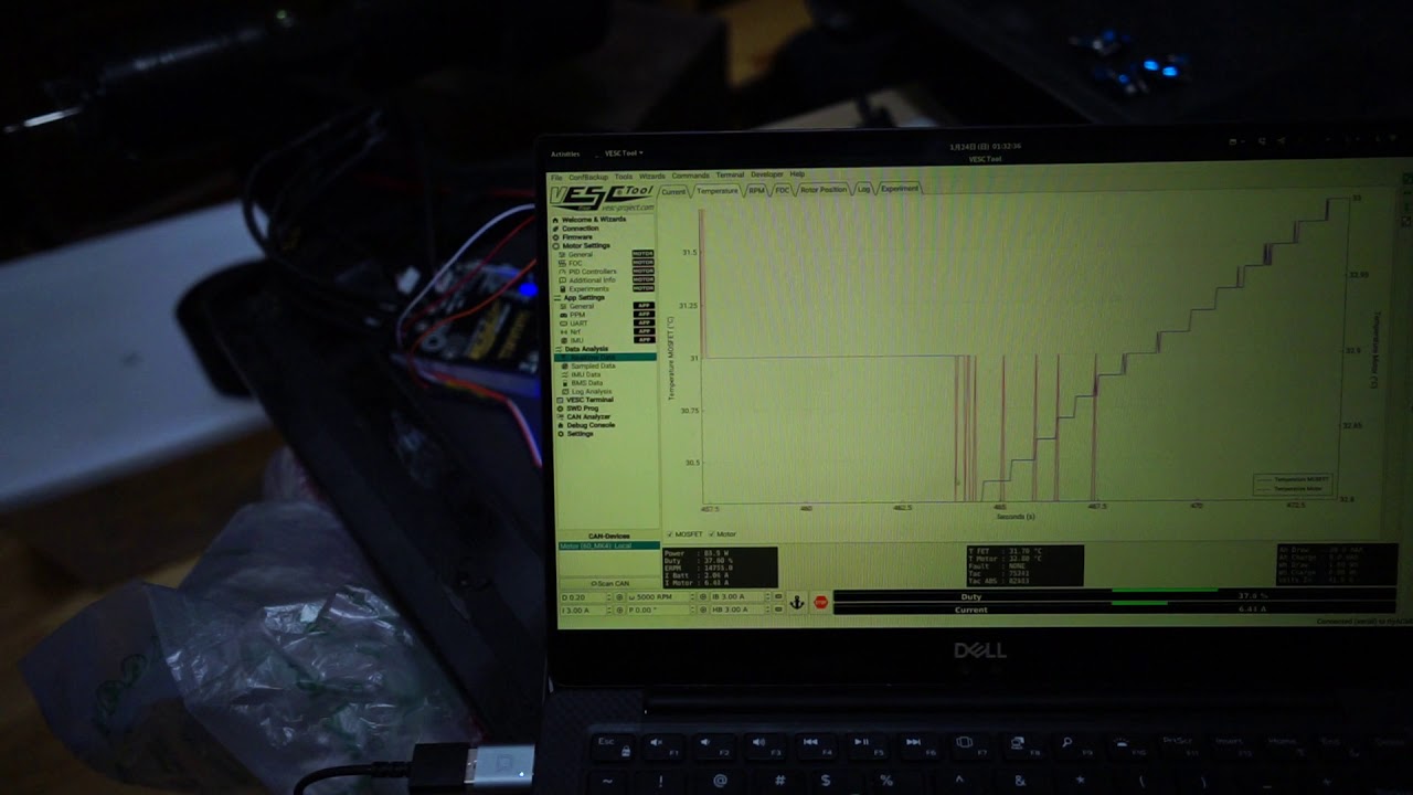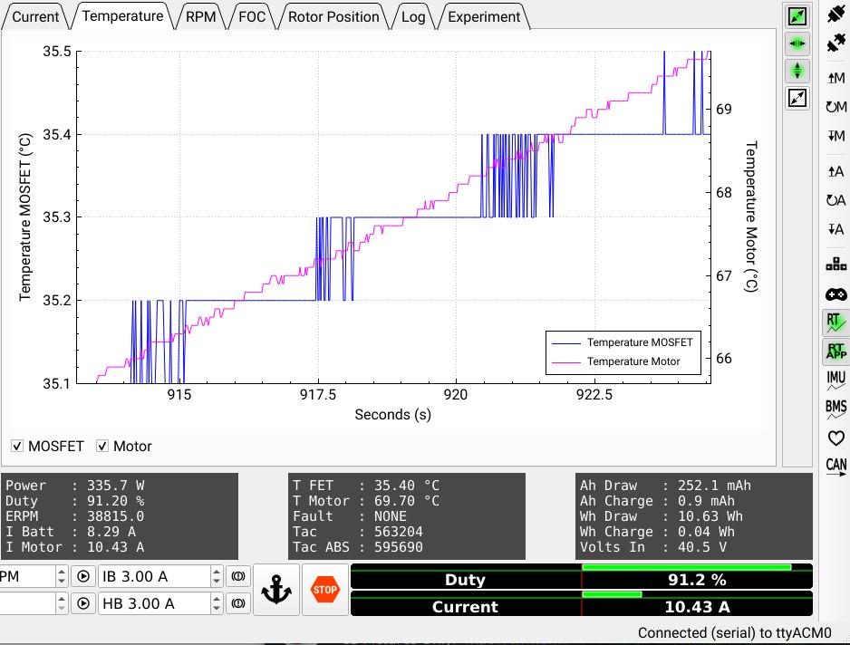 Hmm, maybe it was the vesc; tried again and it’s only 2.5A at max duty. Still heats up at a rate of 6 degrees per minute though ![]()