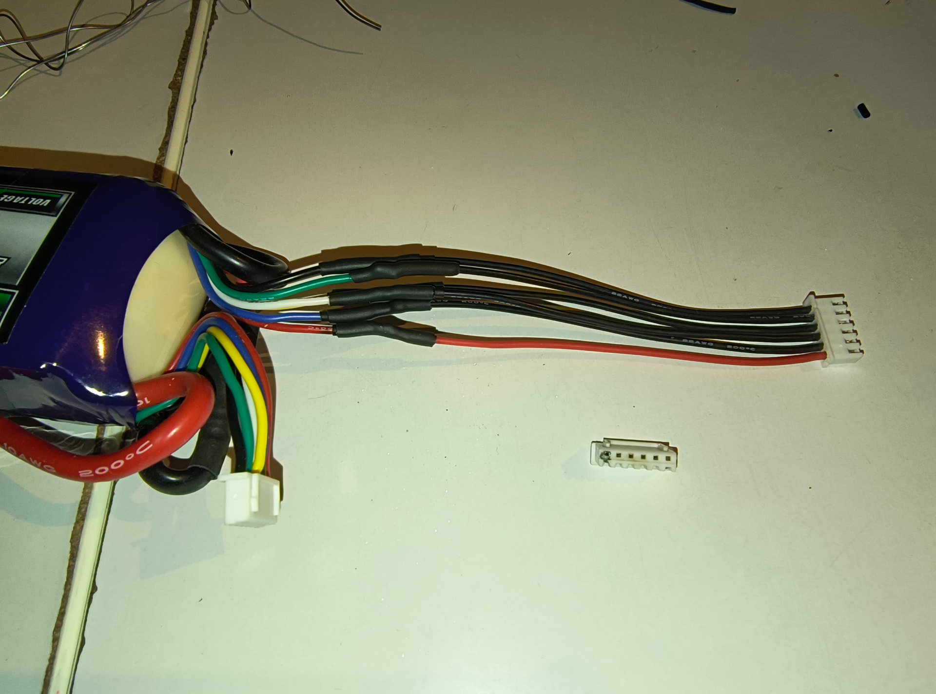Despite all the caution I tried to apply when pugging my connectors, I managed to make a mistake. I have a 10S turnigy (4Ah) battery where the 10S balance wires are separated in two 6pins connectors. Therefore one pin in common.