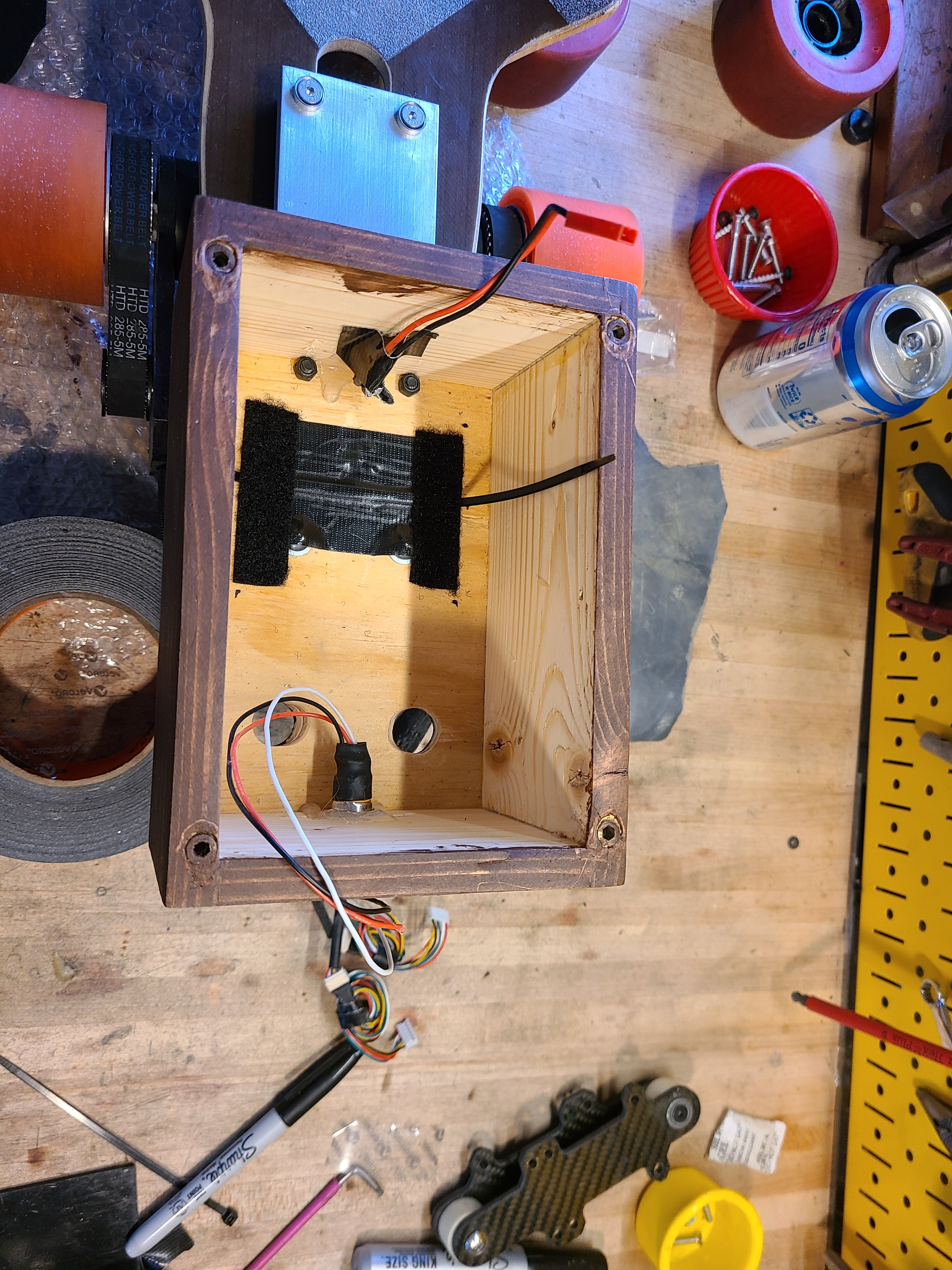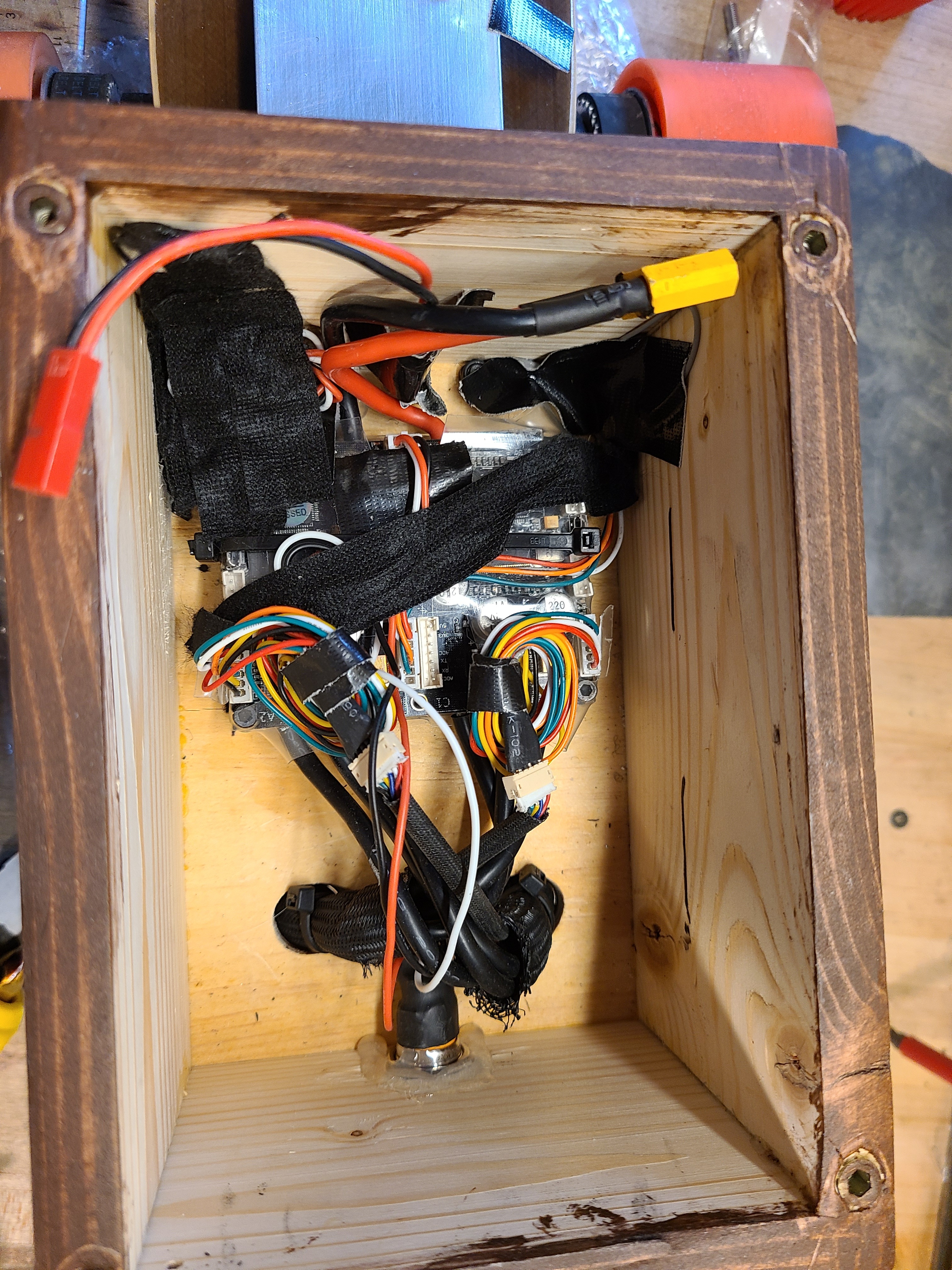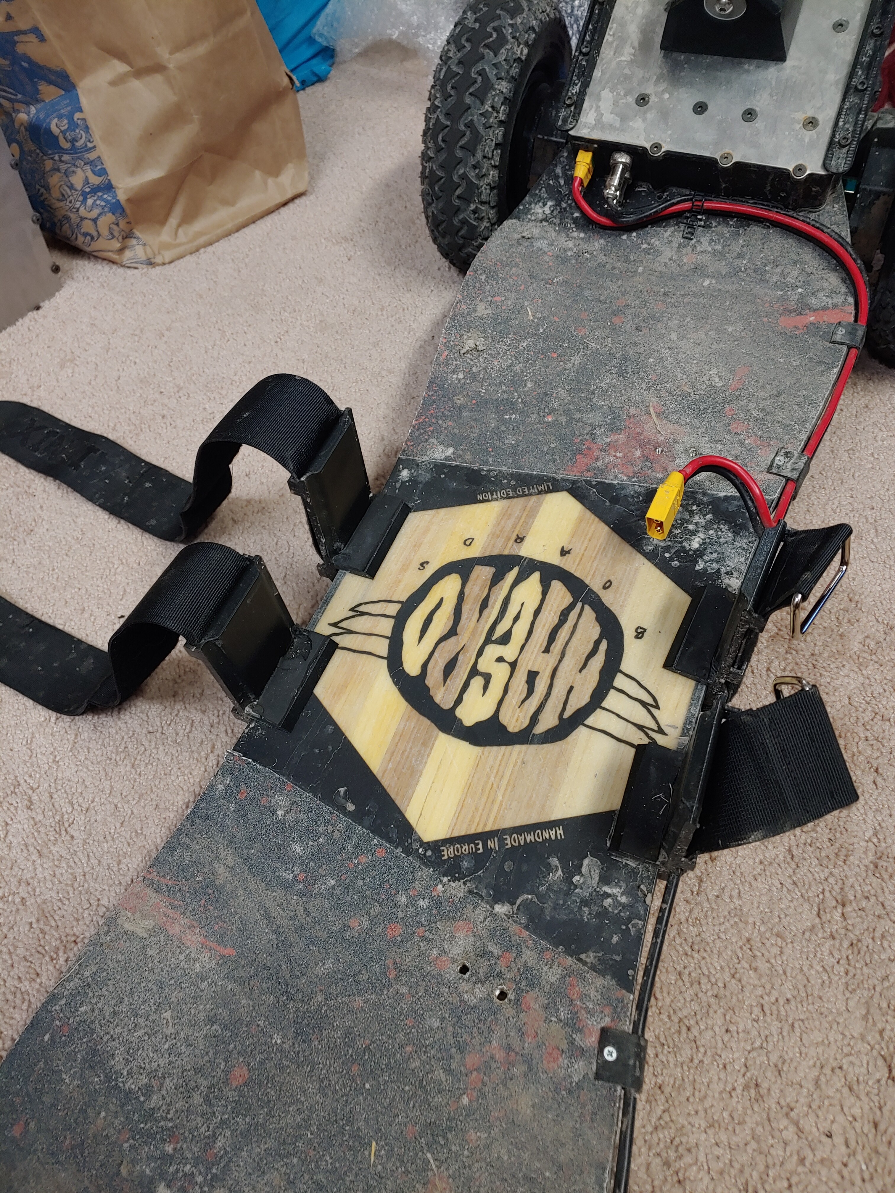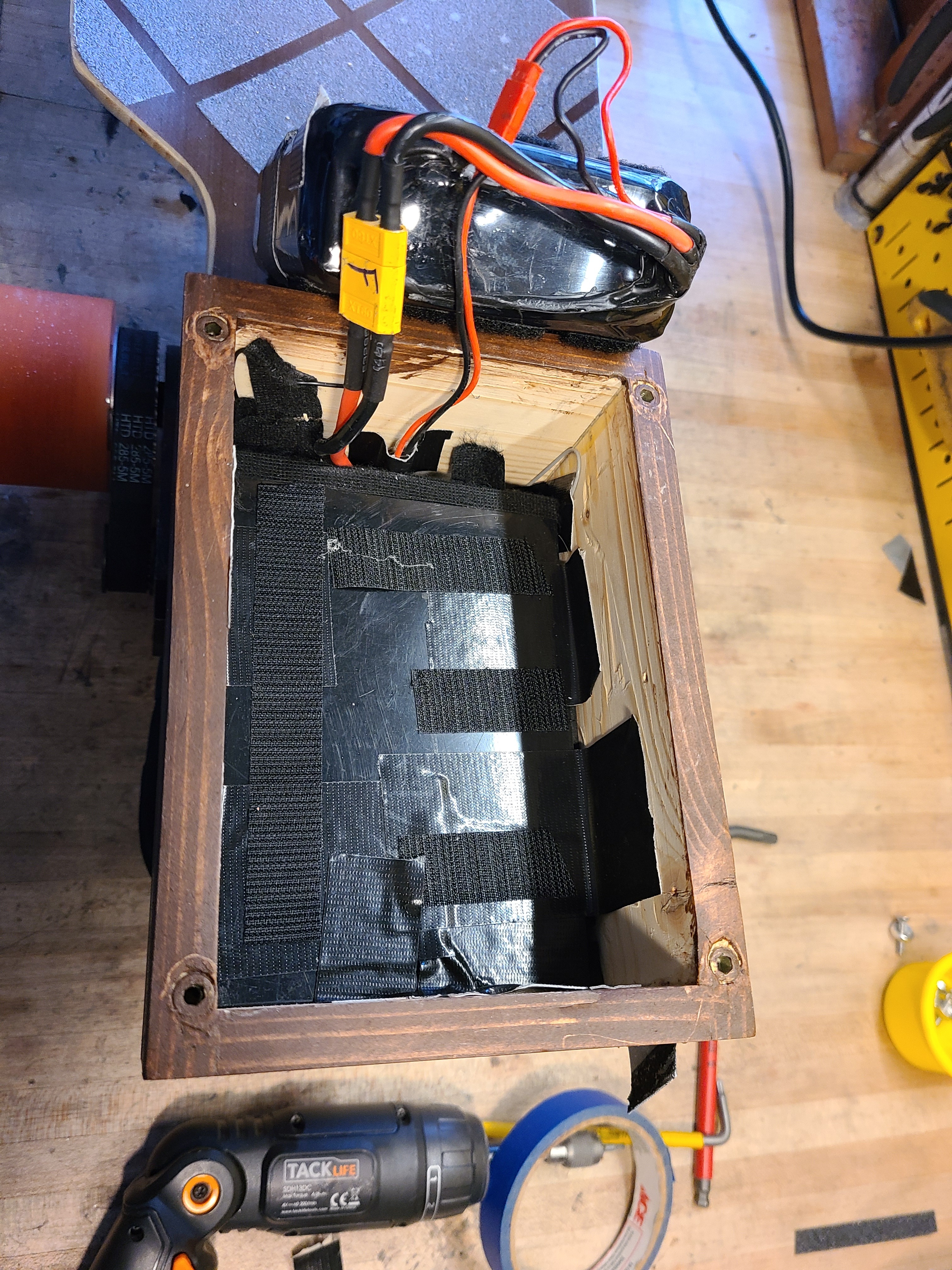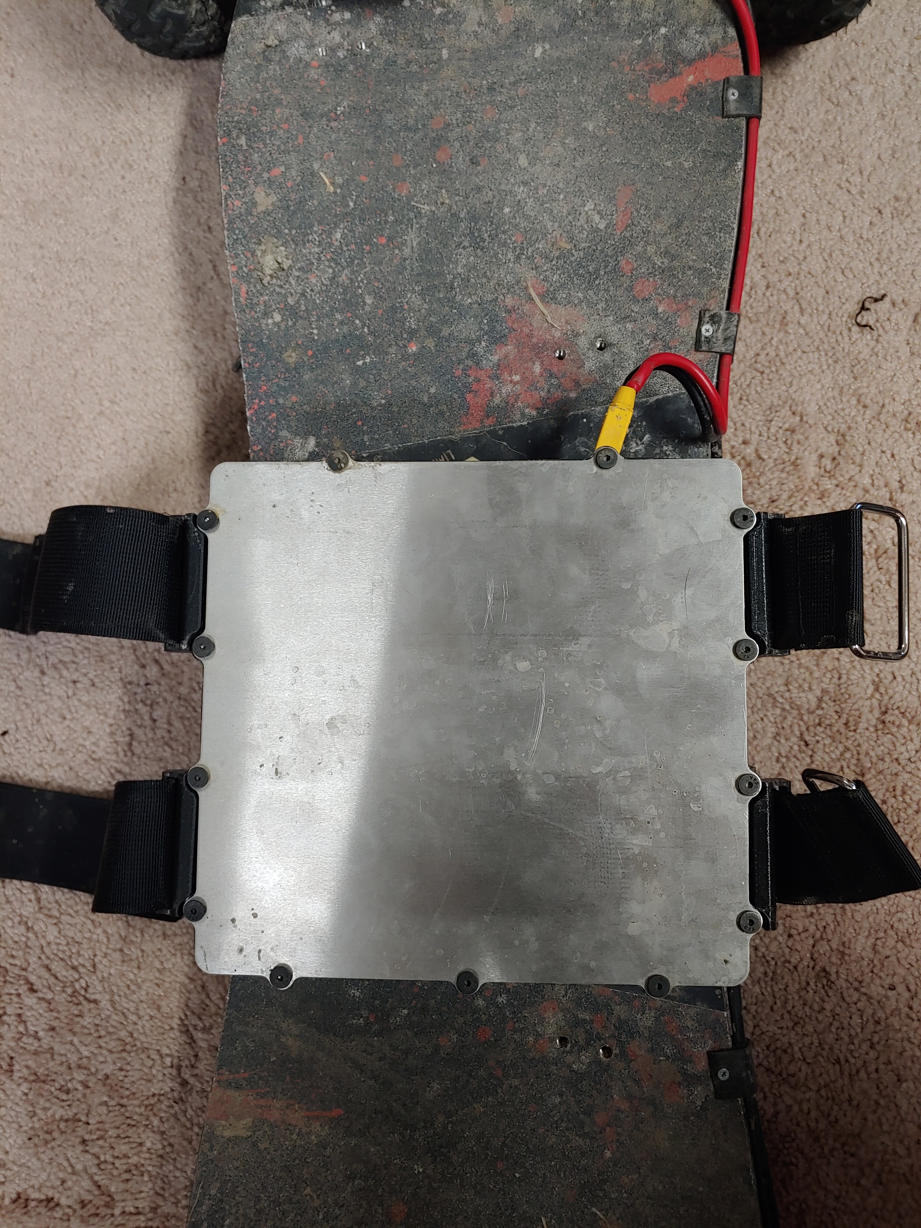 Thanks! I designed some 3D printed guides that clip to the deck and lock the battery in place when the two 2" velcro straps are pulled tight. They also act as wire channels for my headlights and DAVEga X.