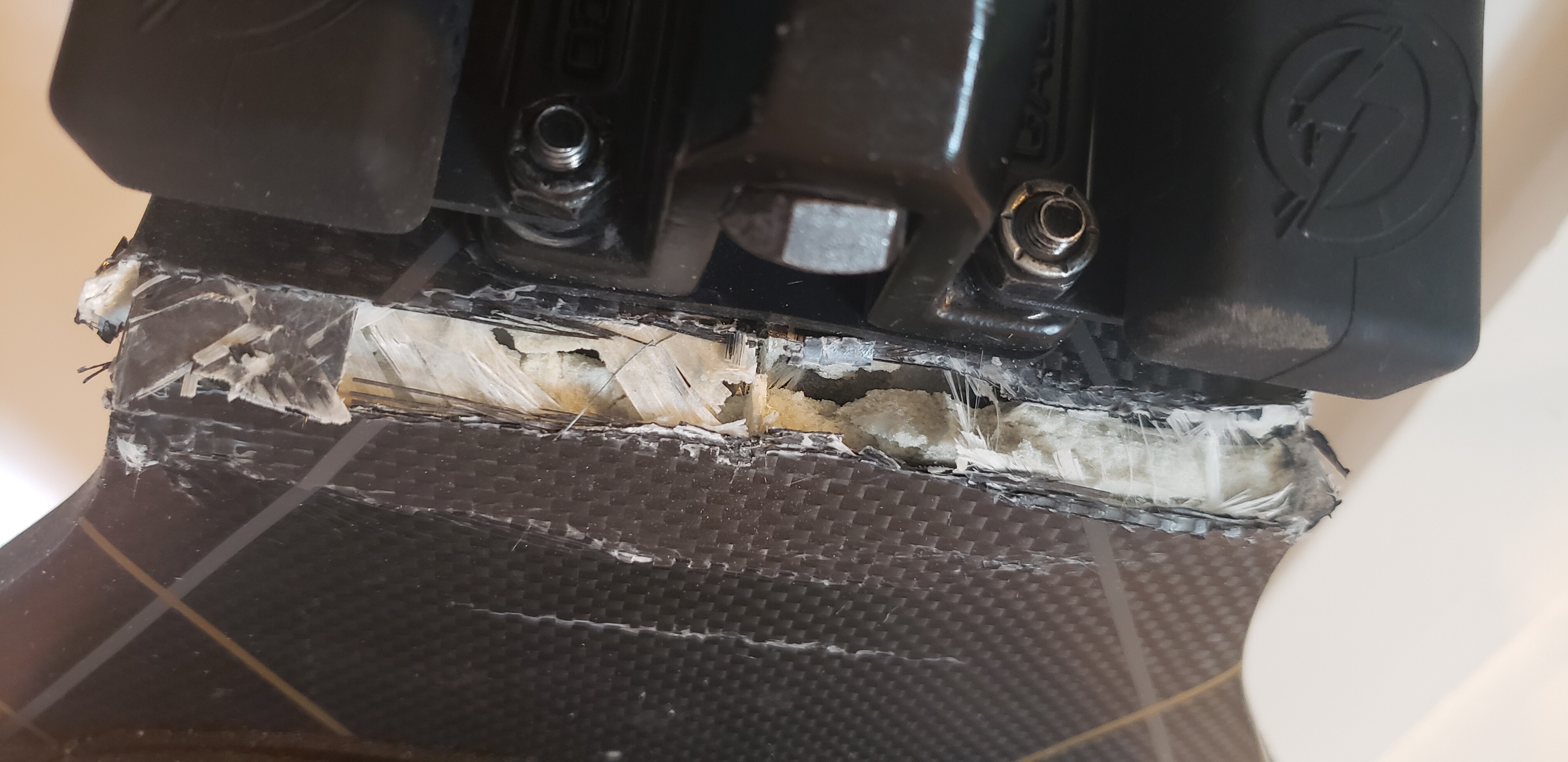 Definitely disappointing. I really love this deck and it is decently strong. Iām close to 250 lbs when Iām geared up and it has performed well. I canāt put weight on my heel today, so it was serious forces going through that board, but they shouldnāt market it as pure carbon fiber.