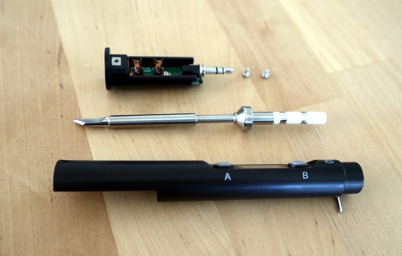 In use, it’s remarkably similar to the other irons we’ve looked at of similar size and shape. Soldering is straightforward, it’s light and easy to use with plenty of heat. The instruction leaflet has a blow-up diagram of its internals, but it pains me to admit that this iron provided a rare moment in which my tear-down skills were defeated. Unexpectedly the tip is mounted to a sub-assembly that comes away from the mainboard with a 3.5mm jack, and while this was easy to remove, it proved almost impossible to slide the mainboard out of the handle tube. The reason was that the two silicone buttons would foul on the display and would not budge despite a lot of coaxing. I could have revealed the board by intentionally destroying either buttons or the display, but since I prefer to keep the iron useful I didn’t do that. If similar irons are anything to go by I would expect it to contain a USB-PD chip, and an 8-bit microcontroller because it has none of the firmware upgradeable features of the TS100 or Pencil, and then a MOSFET to control the tip. It’s a tested and reliable formula for these irons.