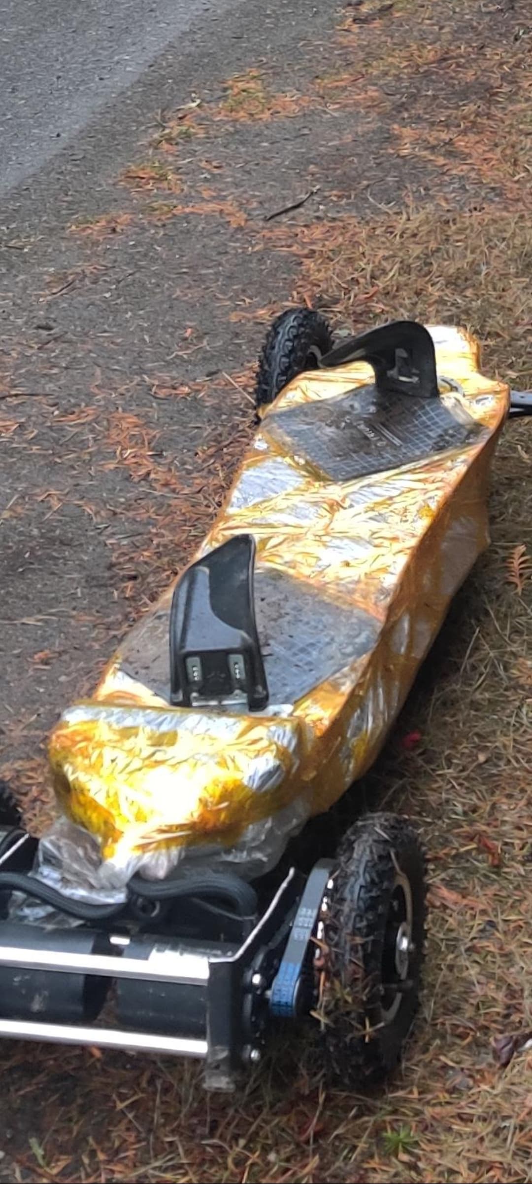 They are either insane or completely sane and just want to create chaos. Even just taking out that thing for a photo when it just stopped raining is absurd, but to make it worse it looks like they might have ridden it before the photo. pine needles are stuck on the back wheels so it at least rolled in them and was not just placed there
