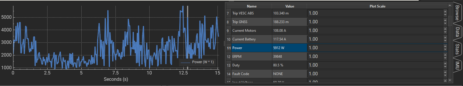 . I need to start putting some 45lb plates in a backpack to even the playing field. I didnât have a fully charged board though. Does anyone know of a better way to look at CSV logs than vesc tool on windows it doesnât show max so I just had to click on a peak and hope that its the max.