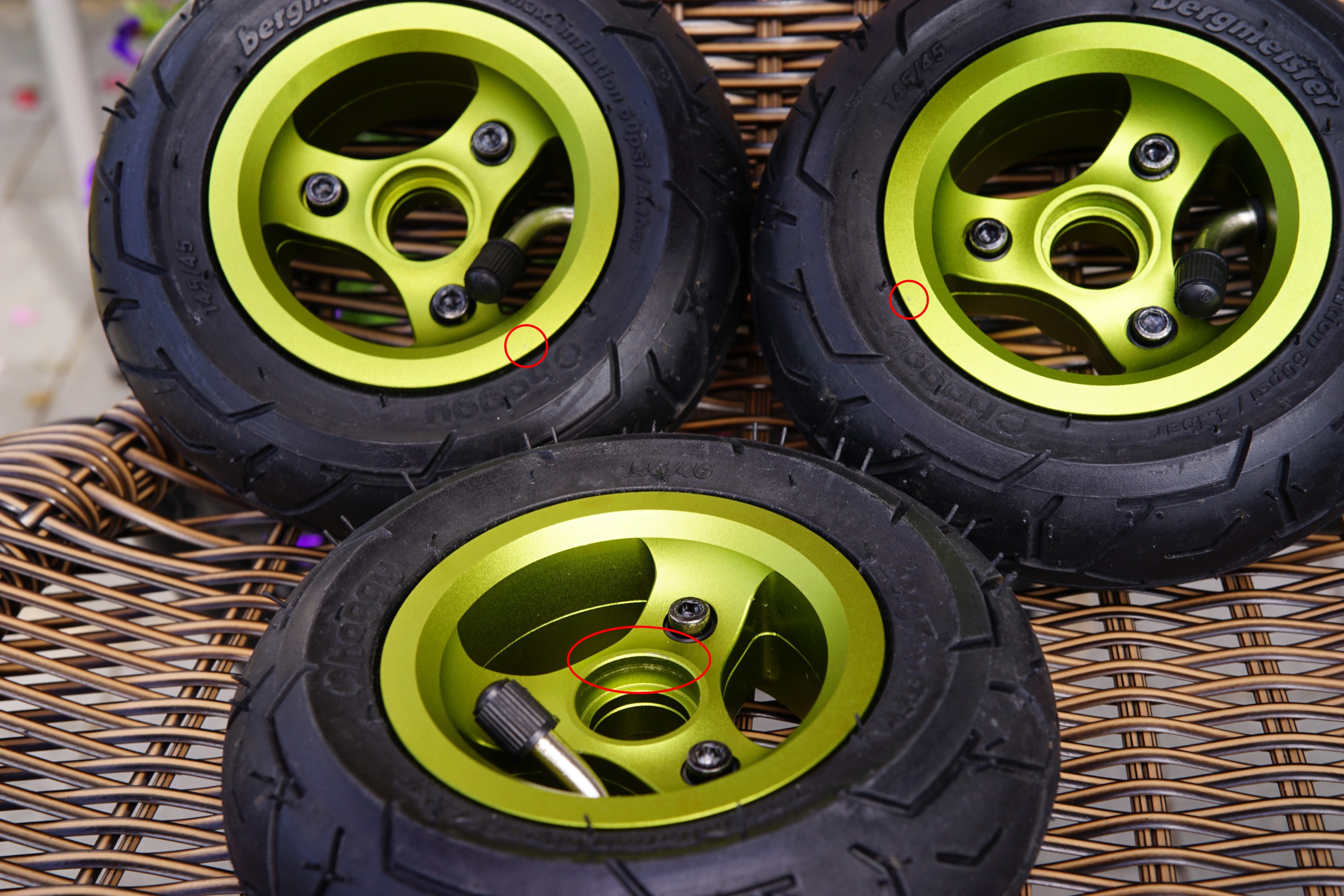 These wheels have only been used for about 400m (tested them on a non-electric board up and down my street once). I only noticed 3 minor scratches of the anodized paint, which I’ve marked with red circles.