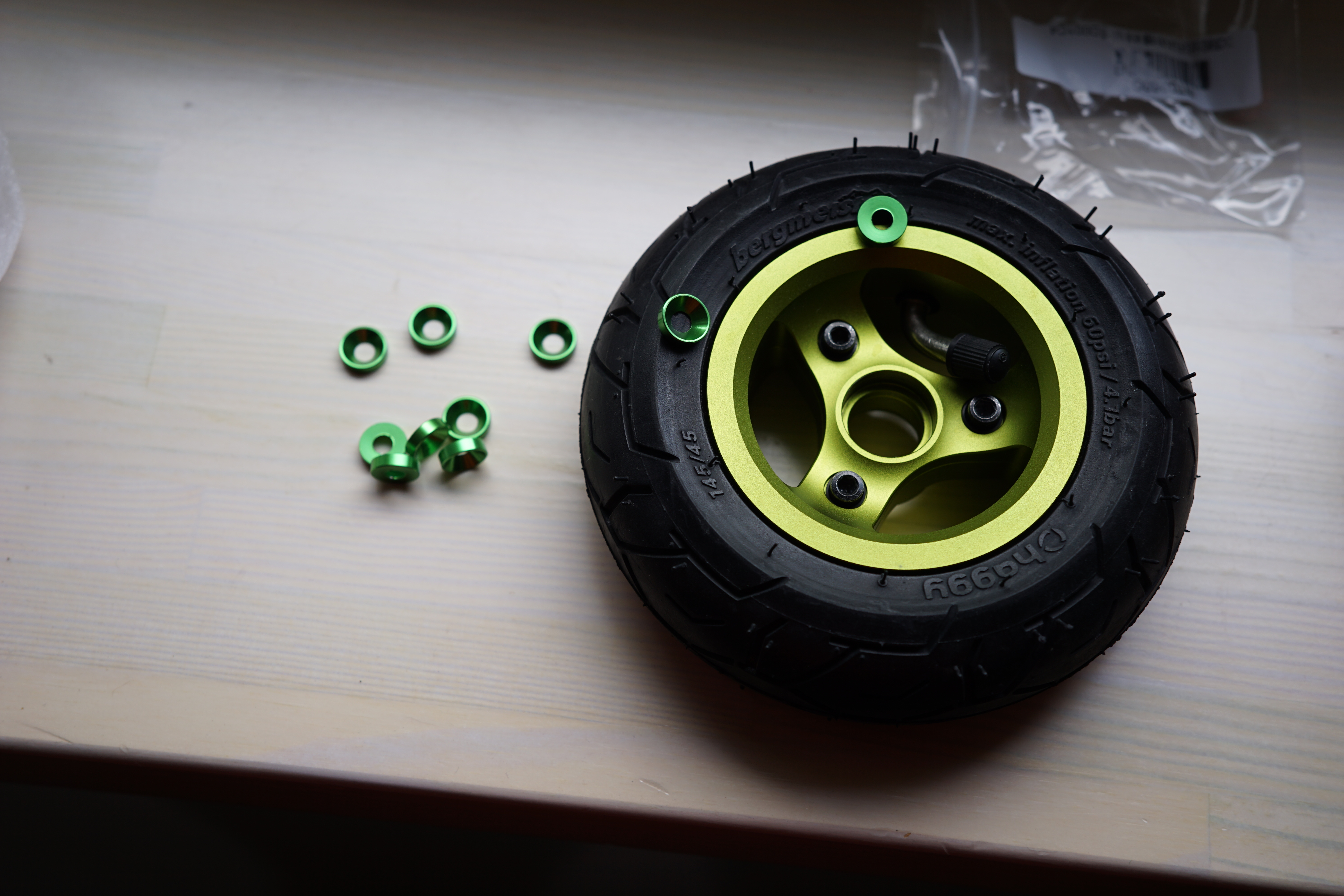 I can also include up to 20 green M5 countersunk washers for free. They aren’t the exact color of the wheels, but hey, they’re green: