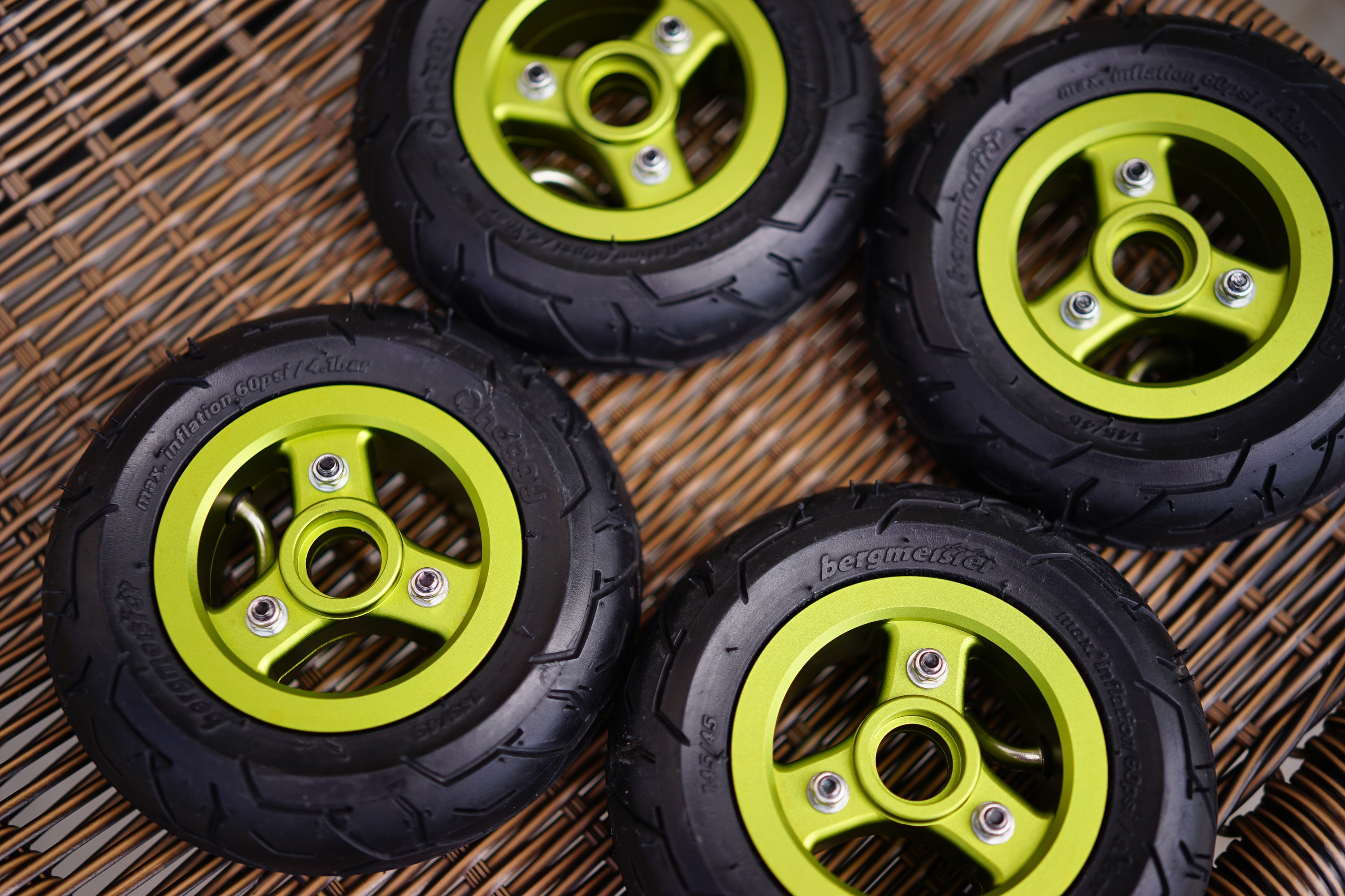 Am selling my set of green Bergmeister tires, with the rubber o-rings already installed, all tires pumped up with a bit of air and valves centered in their holes. (Spent 3 hours doing that yesterday; getting the screws out takes forever.)