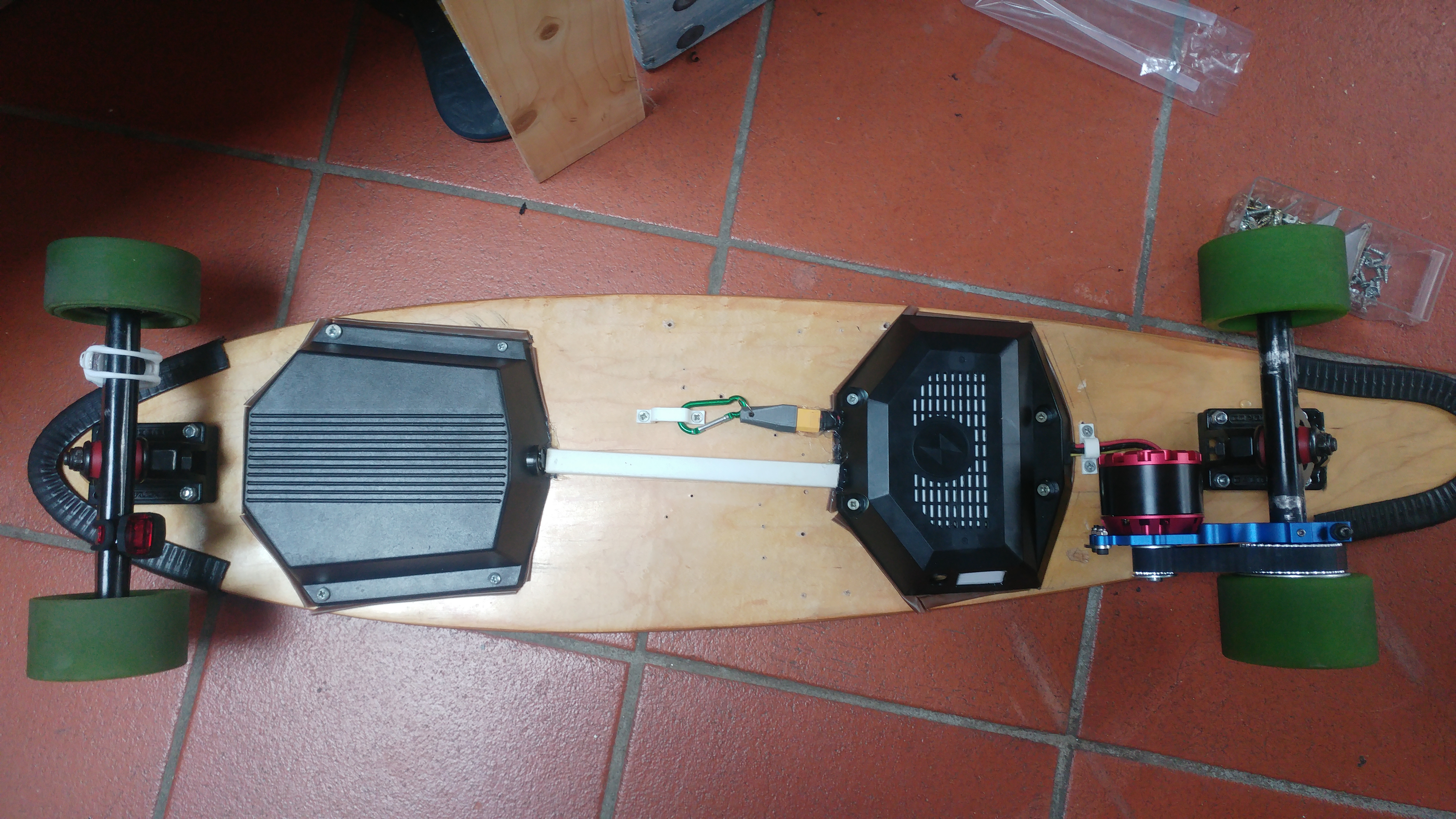 I’ve finally completed (kinda, want a different deck) my first board, the "Infinite Build [Infinite build | Dickyho mounts | dual 6354 200kv | Dual Maytech vesc | Caliber 2's | 2x Zippy 5000mah 3s in series | HX-6S-A06 rev 1 BMS | 83mm flywheel clones | Meepo style enclosures] which was planned as a dual drive but ended up having to make it single drive.
