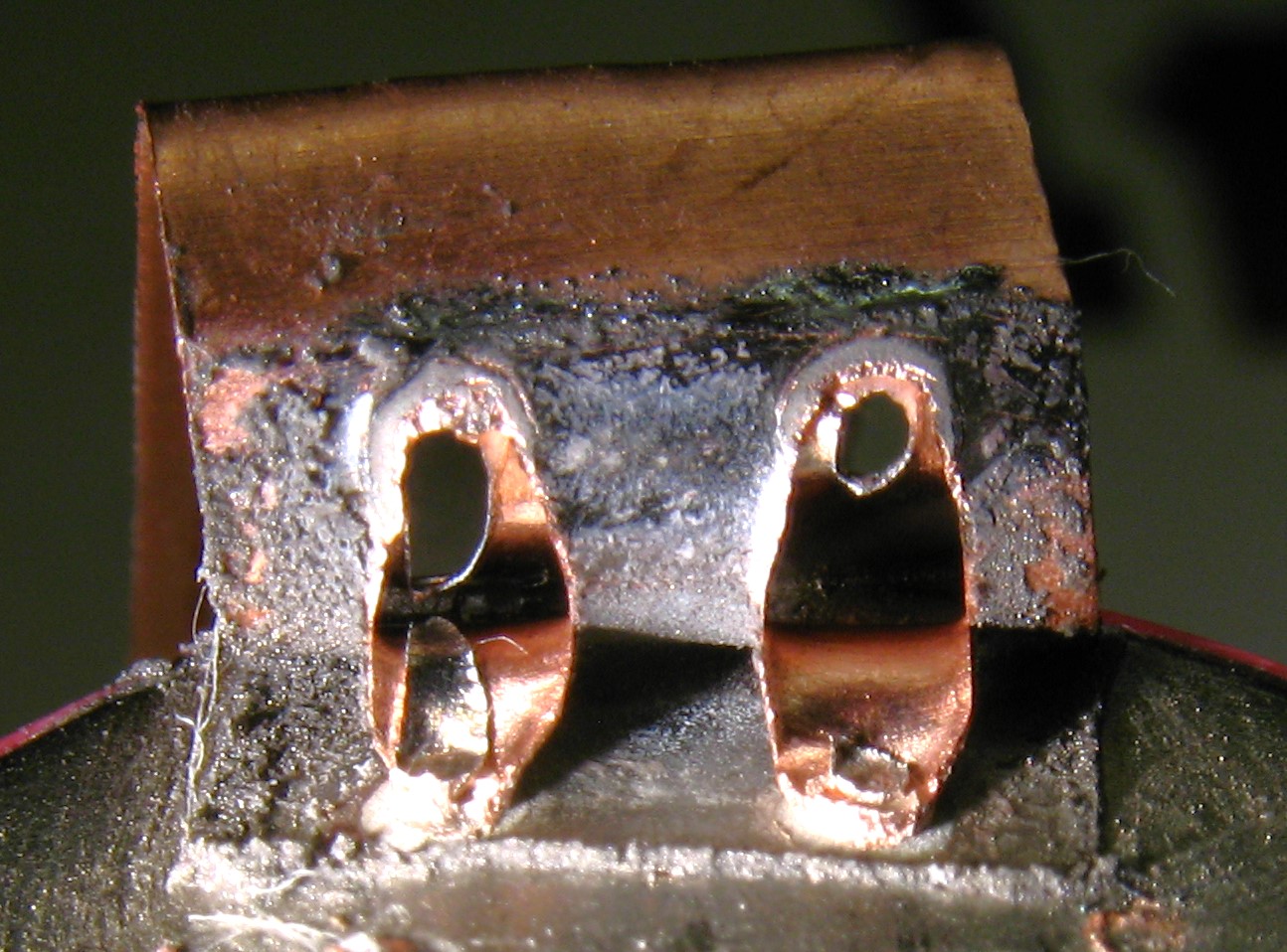 There is now 0.2mm thick, ~10mm wide copper from Anode to the 15 amp fuse( instead of 0.3mm nickel plated steel) , and the cathode contact I welded the original tab with crimped wire to some 0.2mm copper, to extend the tab, and then welded that to cathode under 0.1m stainless.