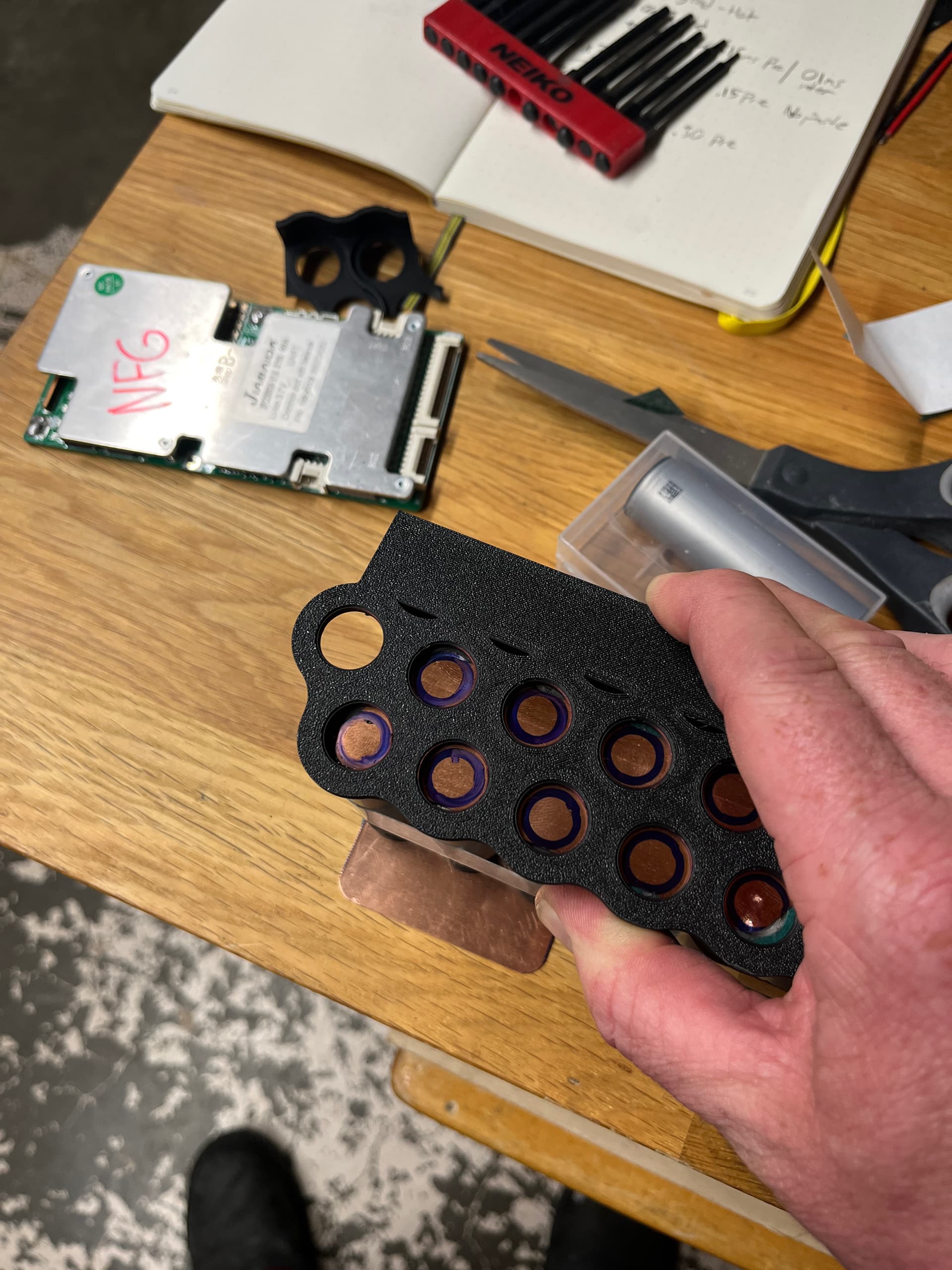 Been busy and working slowly, getting some good results with the p60 welder with .3 and flux. Once again finding pressure and position are critical. If welding too close to the edge you risk a blowout and the positive terminal is the biggest problem so far. Had to replace a cell i blasted a hole in the edge of the positive as i was making one of the series connections which sucked but i stopped the whole process and made a jig to mark the copper so i wouldn’t do that again.