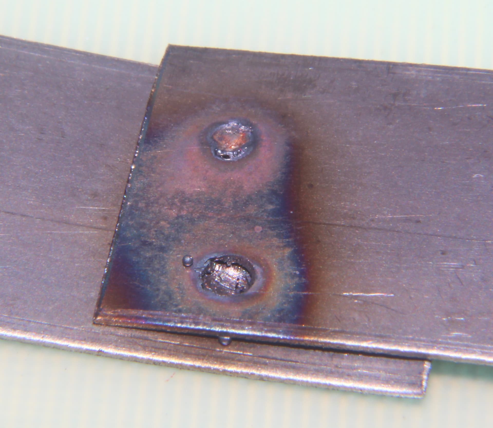 It is also possible my electrode tips are not rounded enough. I have been trying to hold them as vertical as possible, for consistency reasons, and the sharp edges could weaken the copper at edge of weld, making it tear from the weld, too easily.
