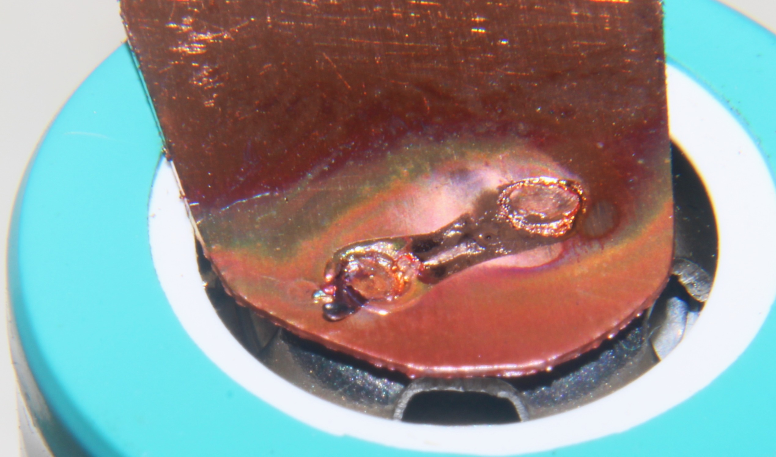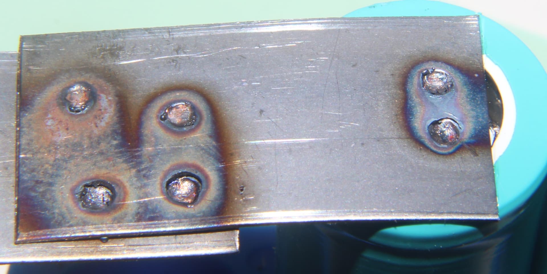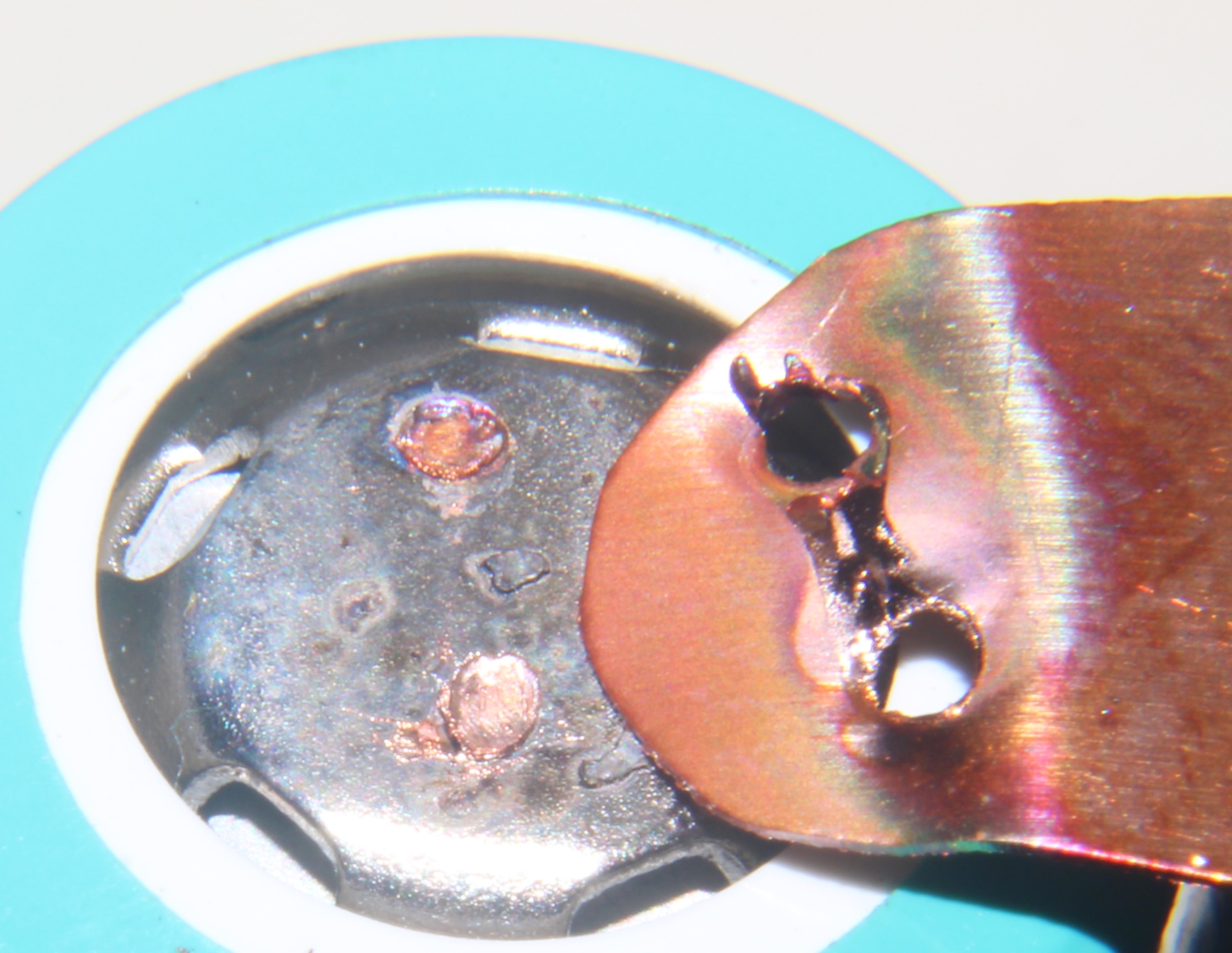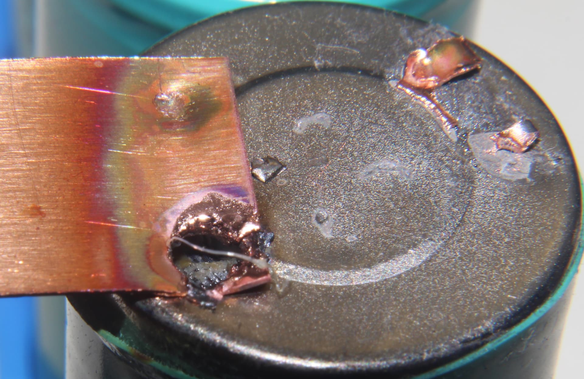 Blowing a hole in the cell can with 0.2mm copper, no flux, has to be a combo of factors. The raised center ridge likely allows the can to be thinner, and even though I used a lot of pressure to conform the copper to the can before pressing the foot pedal, there could have still been a gap, and the air in the gap expanding could have lifted the probes in my hand on first or second pulse, and then the third pulse blew the hole into the can.
