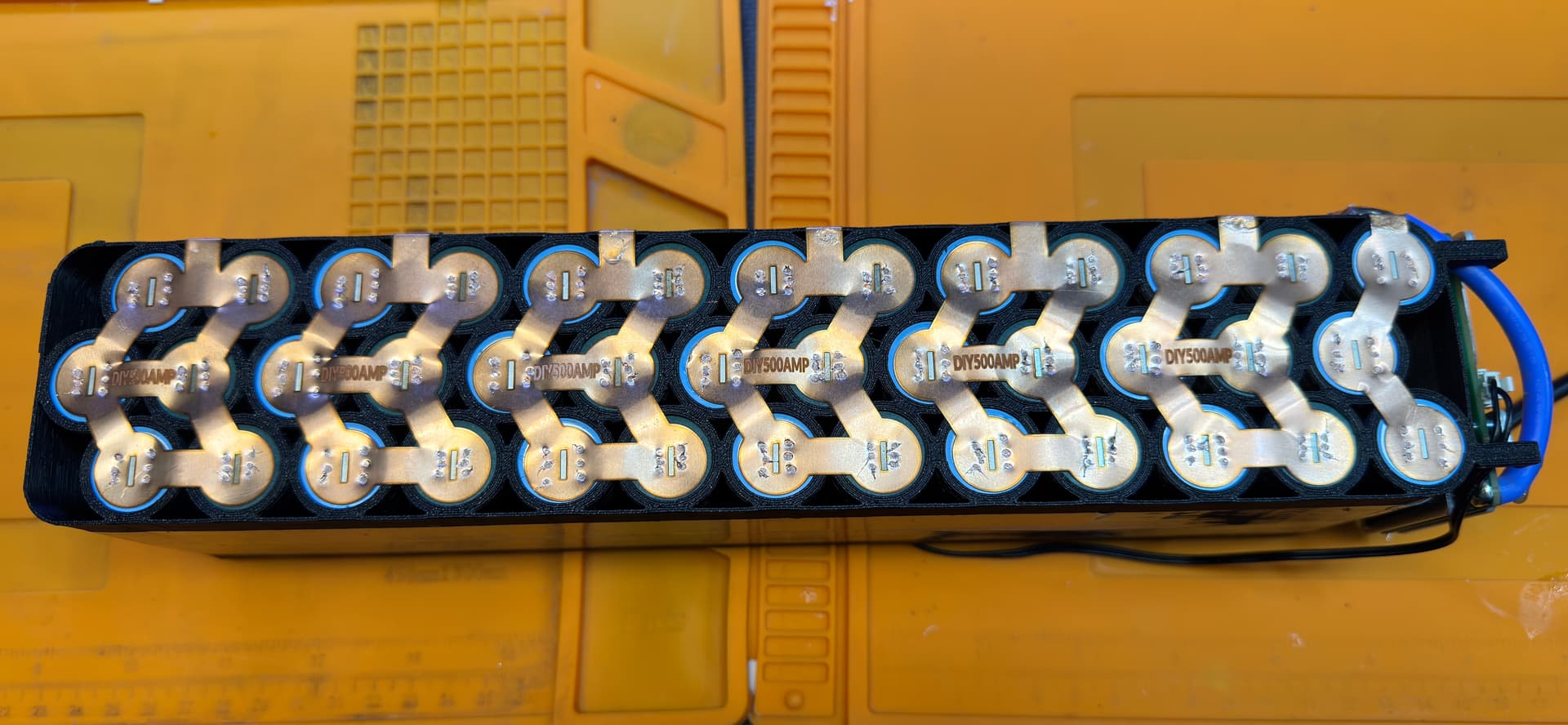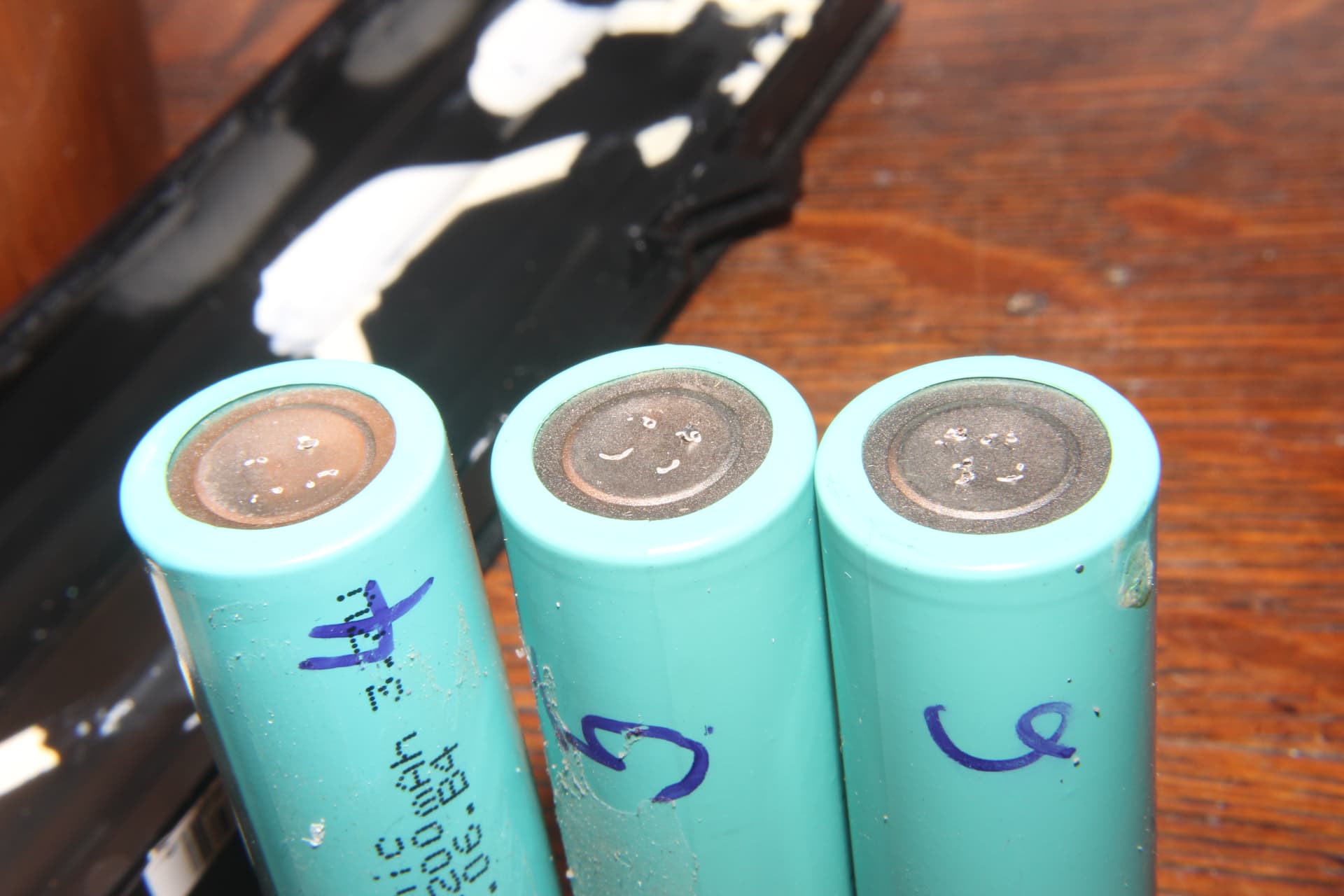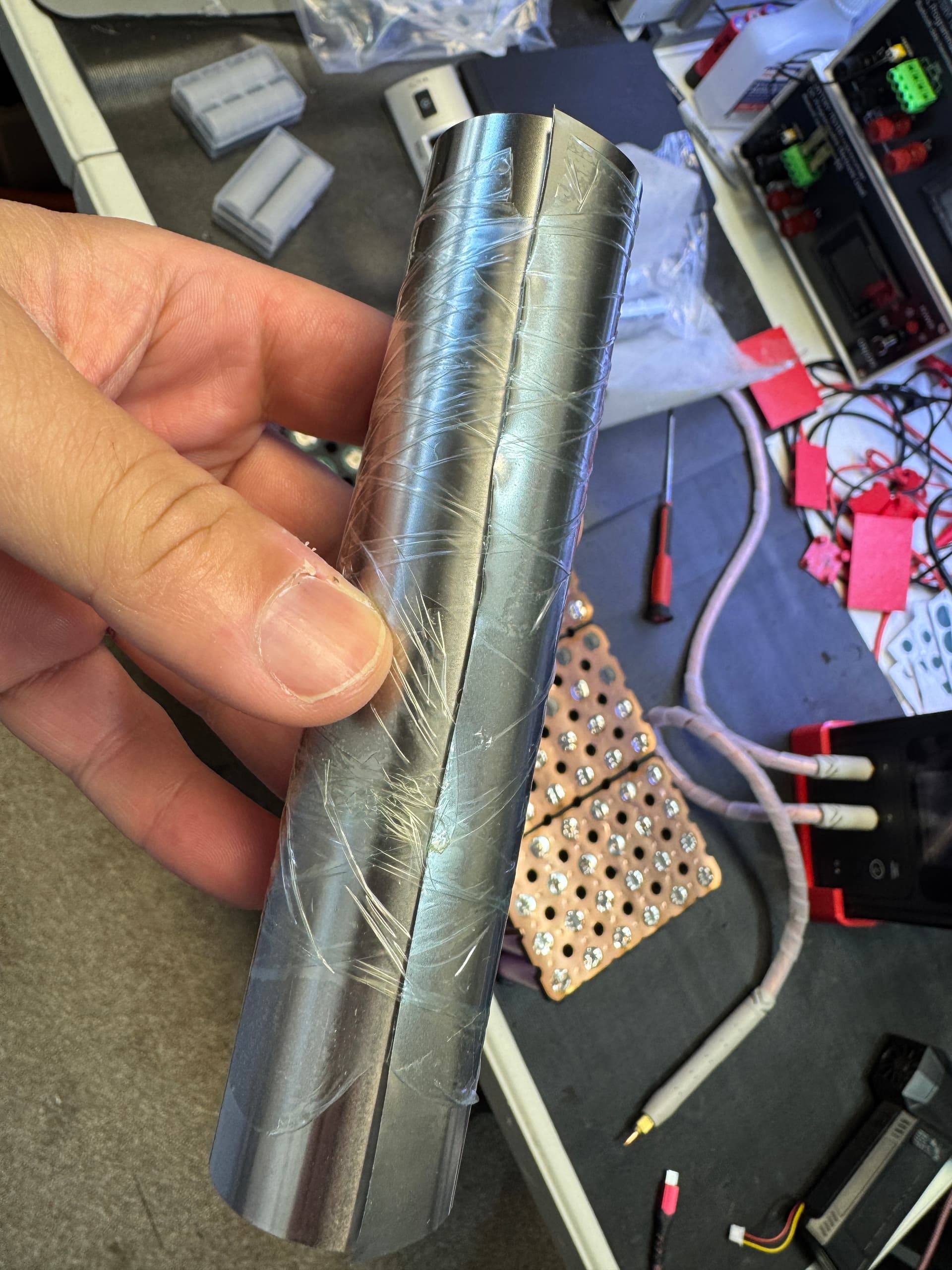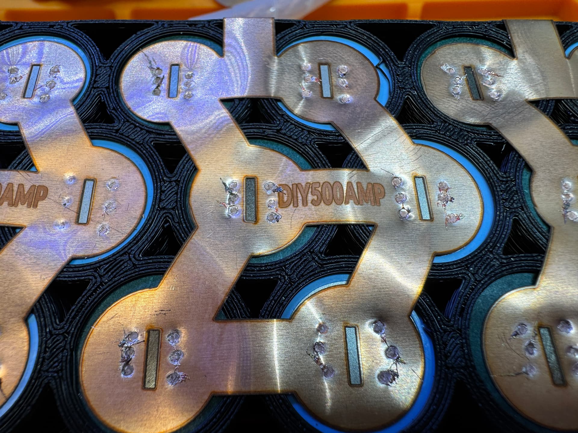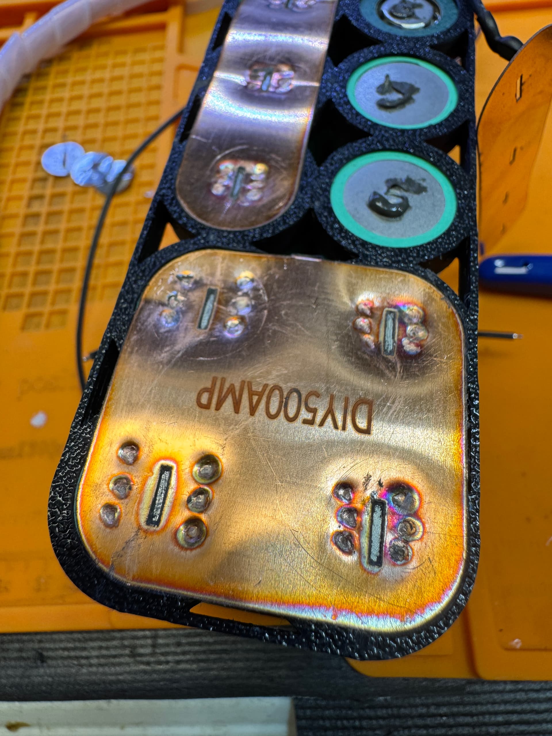 Blowing a hole in the cell can with 0.2mm copper, no flux, has to be a combo of factors. The raised center ridge likely allows the can to be thinner, and even though I used a lot of pressure to conform the copper to the can before pressing the foot pedal, there could have still been a gap, and the air in the gap expanding could have lifted the probes in my hand on first or second pulse, and then the third pulse blew the hole into the can.