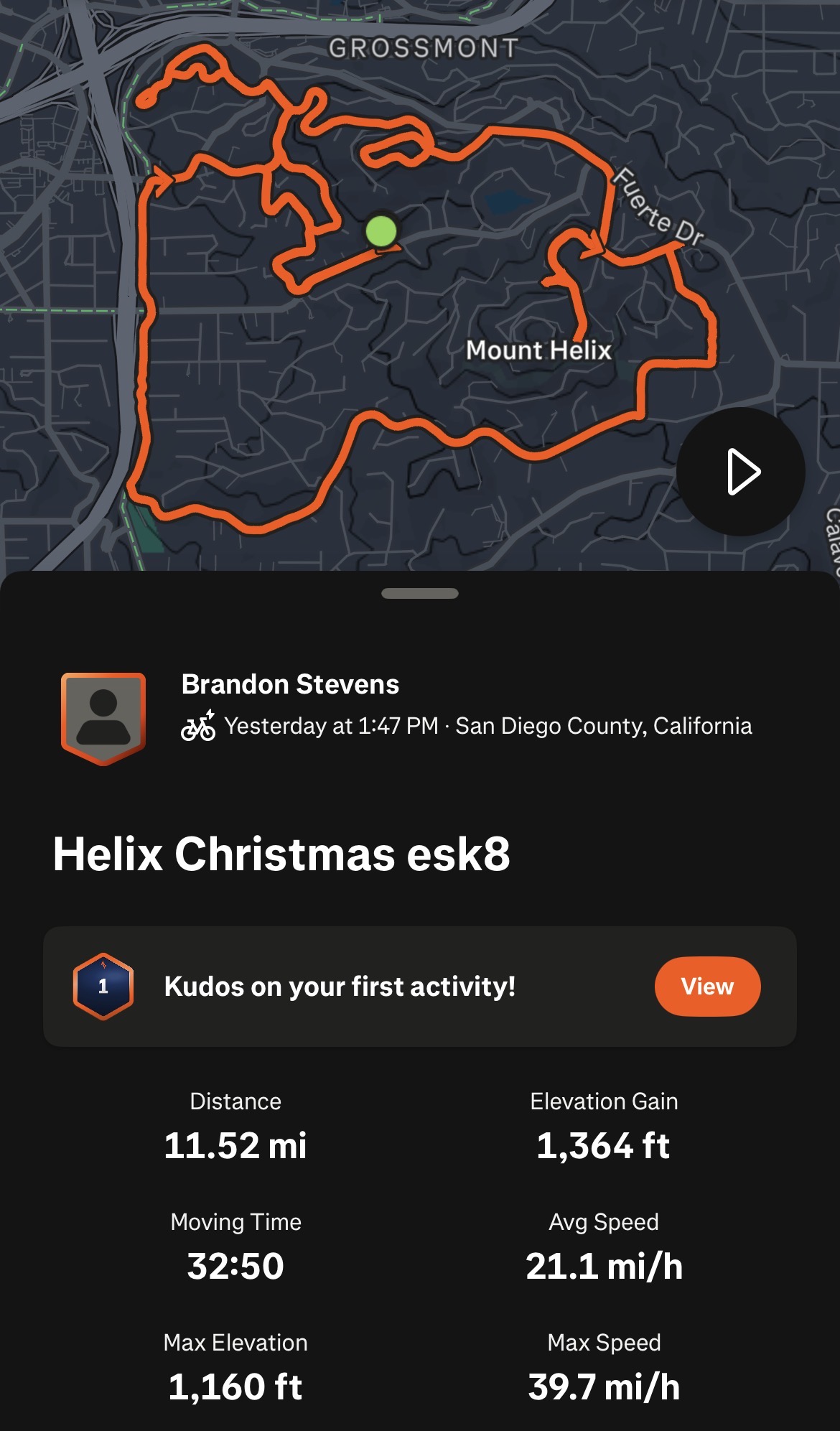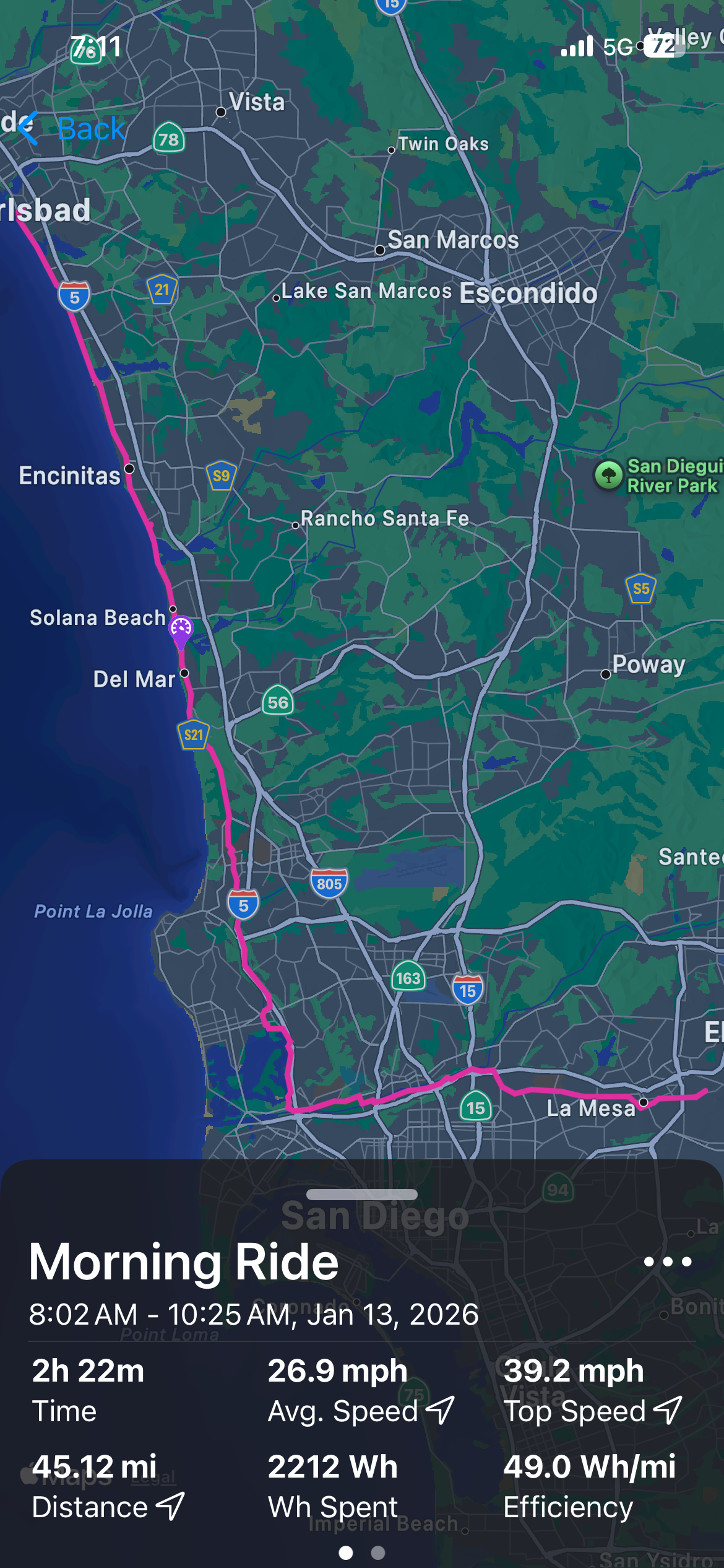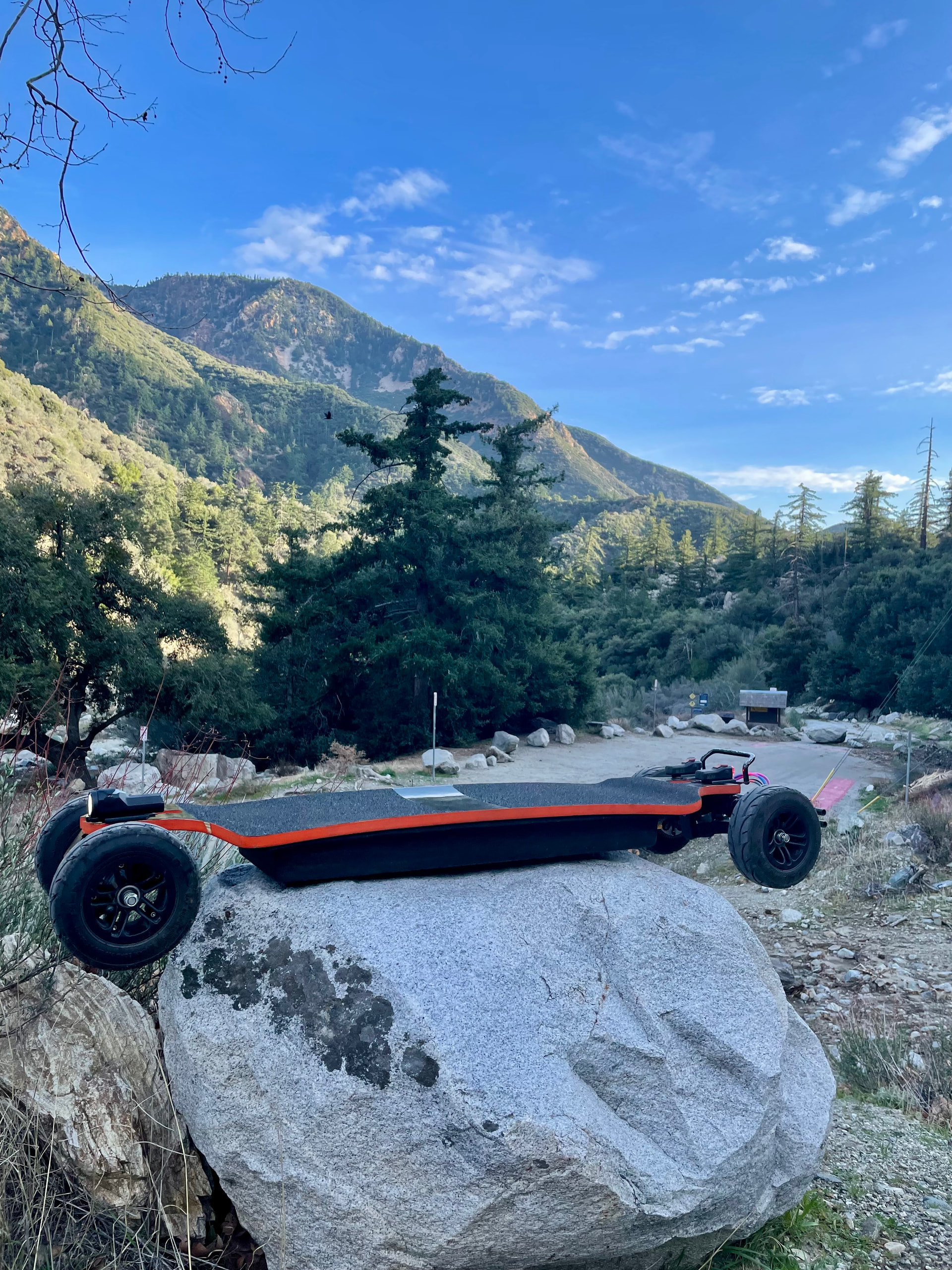 Visiting family in Rancho Cucamonga, CA. Told wife I had to bring the board for a rip up the mountain. First 1/4 of run was beautiful newly paved asphalt that I was able to get 40-45mph very easily. The middle/top section of road (Mt Baldy Rd) was in terrible shape lots of cracks and holes a very weathered road, surprisingly still able to average 30-35mph pretty comfortably. A true testament to how stable and forgiving these duality trucks are. This rmountain run was definitely a test to see how esc and motors handled thermally (I forgot to connect telemetry app but think I got esc to 60C and motors to around 70C) and averaged 60wh/mi again, I definitely enjoy having the telemetry data on vx4 remote. Being able to monitor esc and motor temps and know when to slightly back off to keep cool is game changer.
