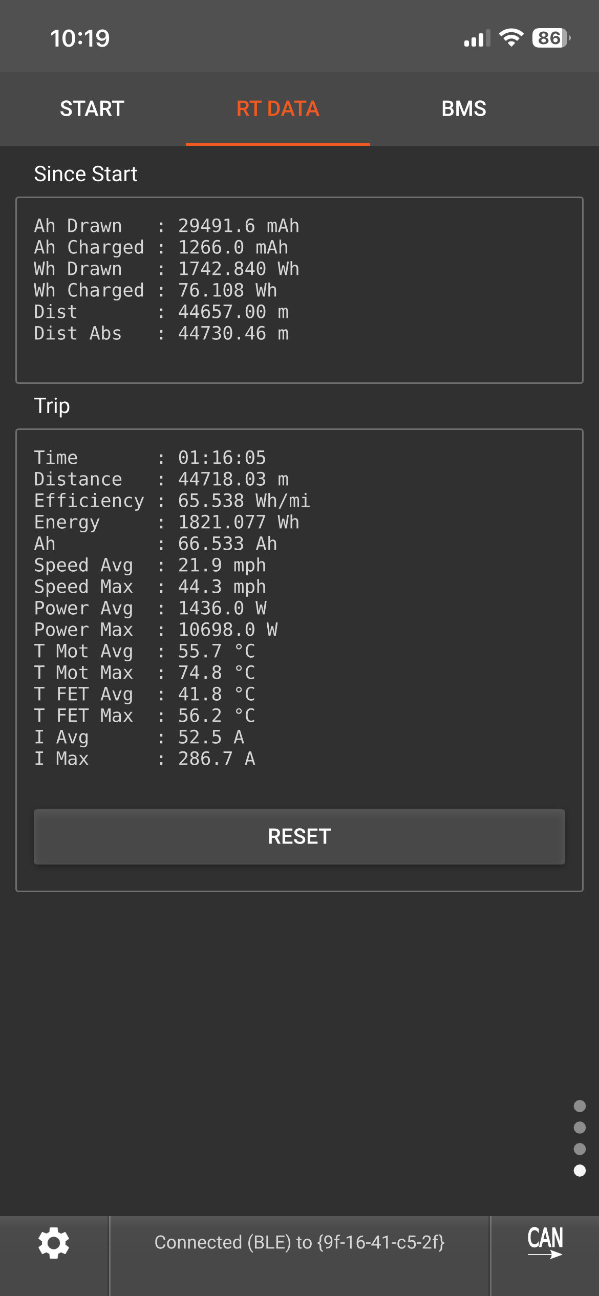 I want to talk about efficiency. I’m getting terrible efficiency, it made some sense getting 60+ wh/mi blasting around town. But I went out for a full discharge ride. Kept speeds moderate at 30mph, pretty soft starts, got up to 39mph briefly. Averaged 49 wh/mi and got 45 miles range before remote started yelling at me low battery (3.1v ish per cell). 45 miles is good range in general, but on 10p 45ah pack I’m thinking I should be seeing more range and definitely better efficiency?