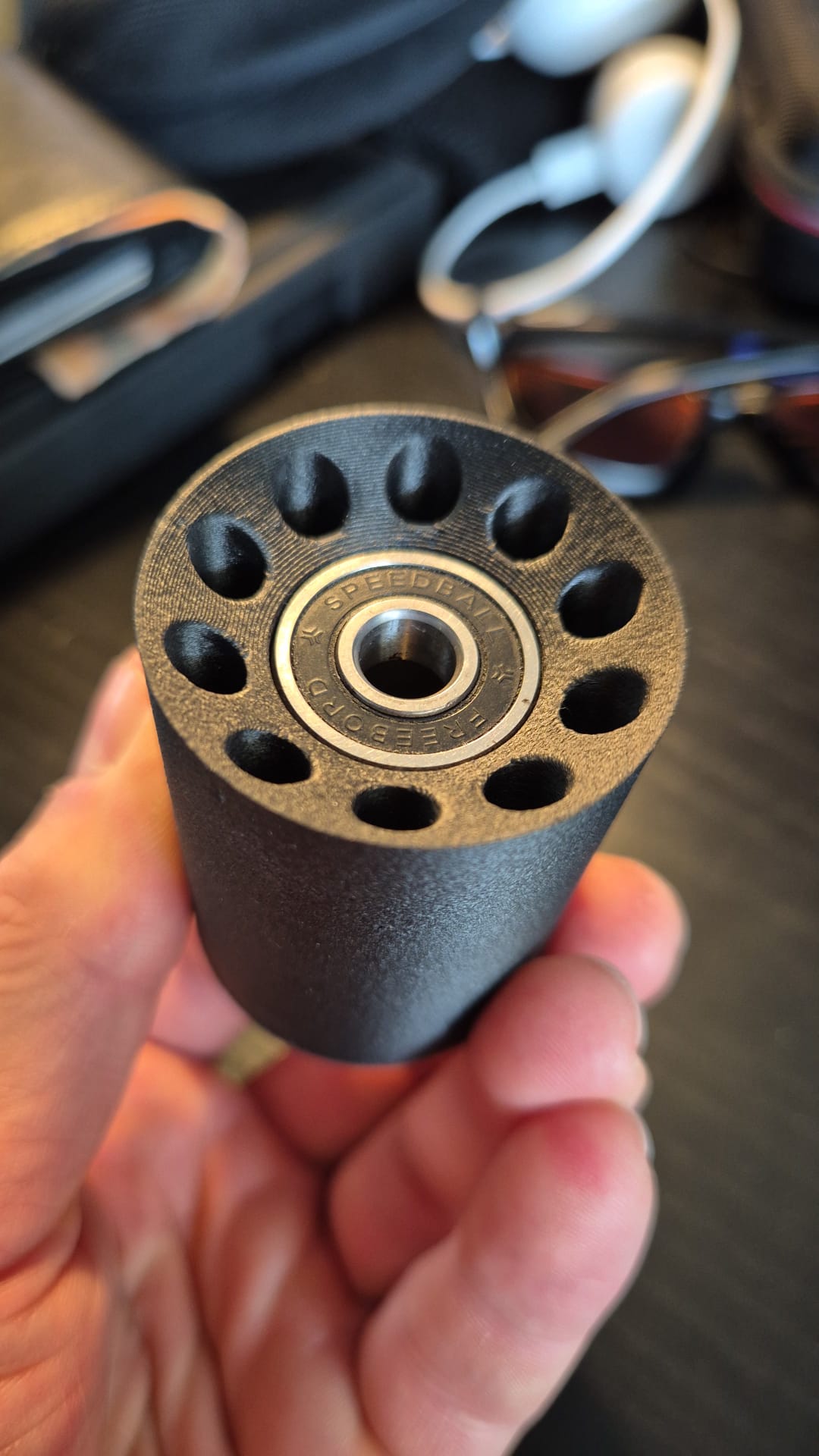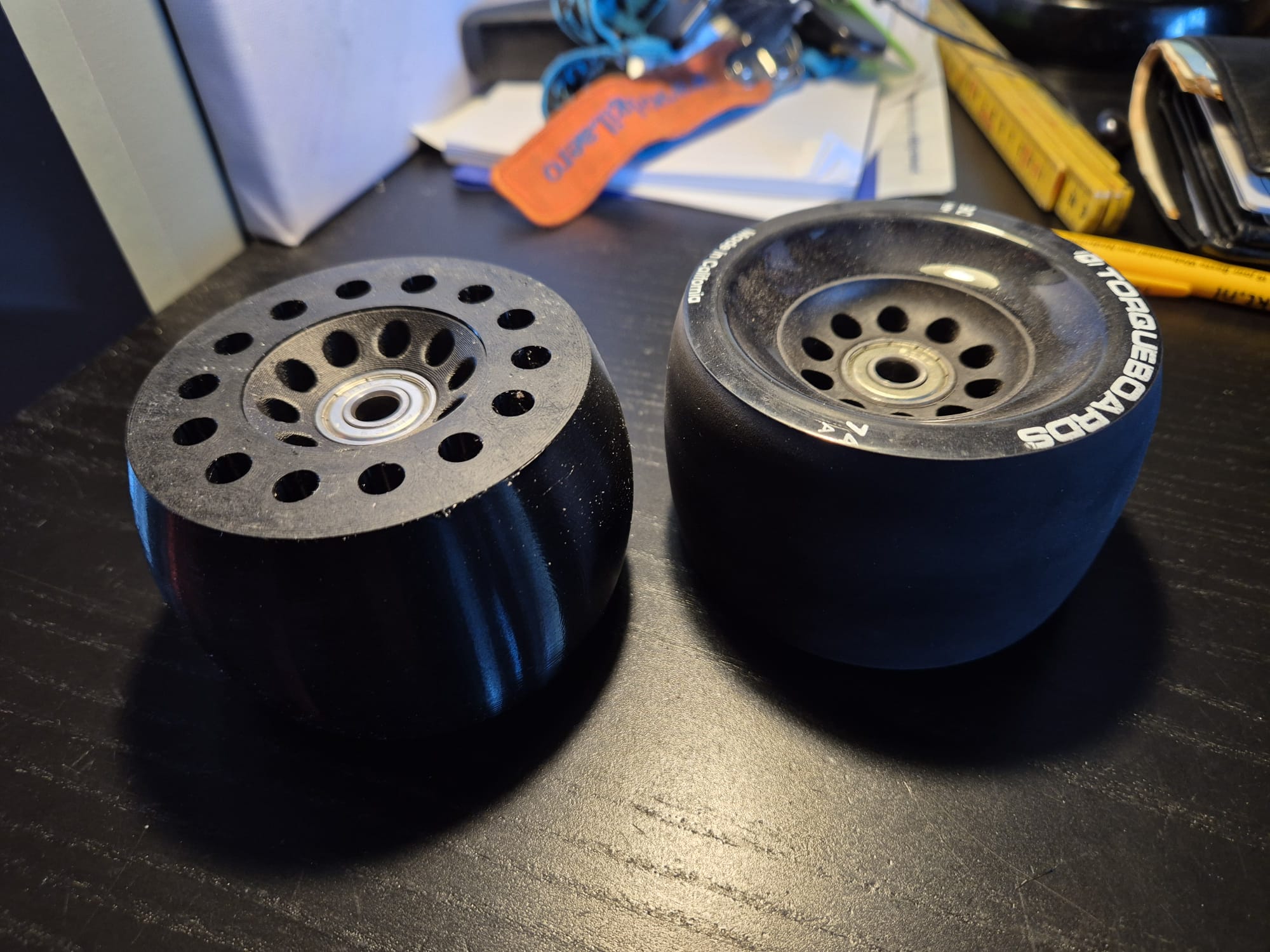 I’ve designed and printed a new 90 mm fully round-profile center wheel with internal suspension holes. The core is PET-CF, which has proven super durable on my other drive setups. I’ve tested several shapes before, and this one performs best. I’m now looking for a good 2 component epoxy to glue te core and tire together.