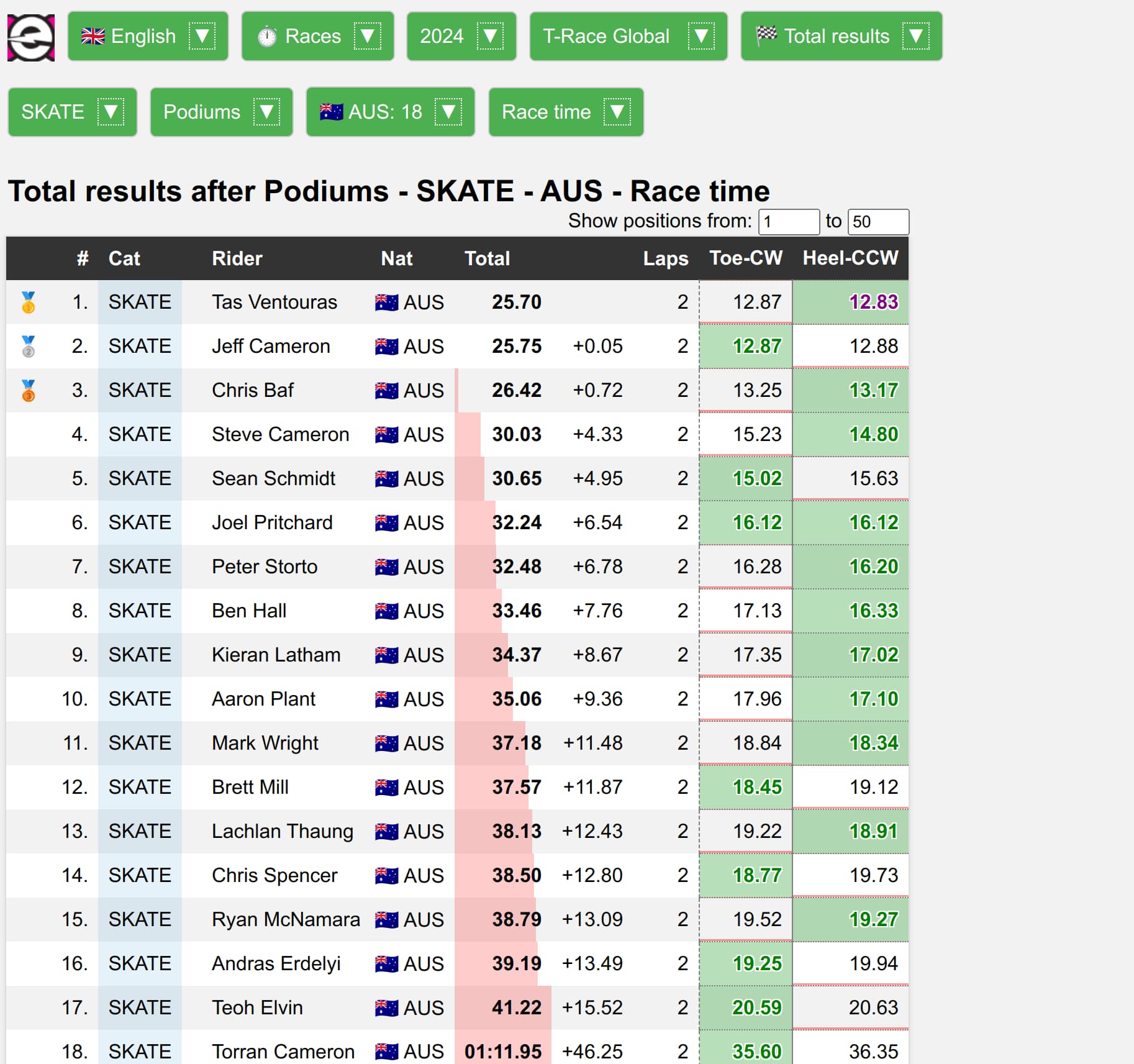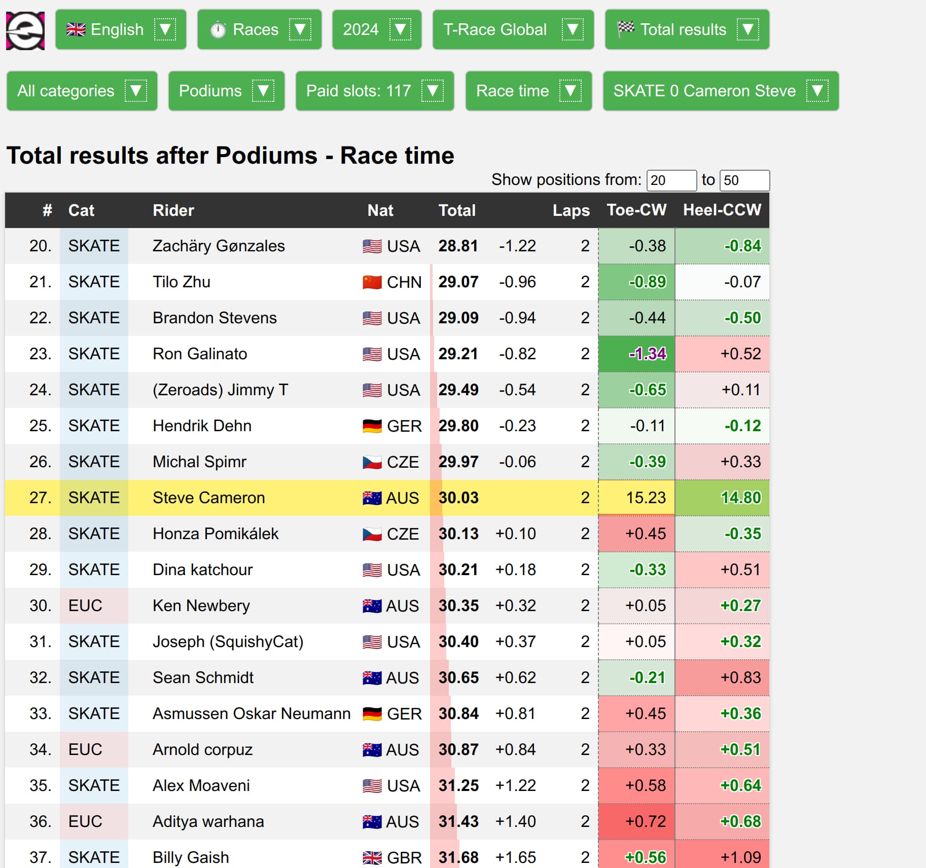 For people following T-Race I have imported the data into our race system to make the results look bit more fancy and allow some easy filtering. You can filter only positions around you, click on your name to see the data relative to your times, see how close you are on each side, filter only skate category, filter your nationality, etc. Will try to keep it in sync with official table from @davidbonde