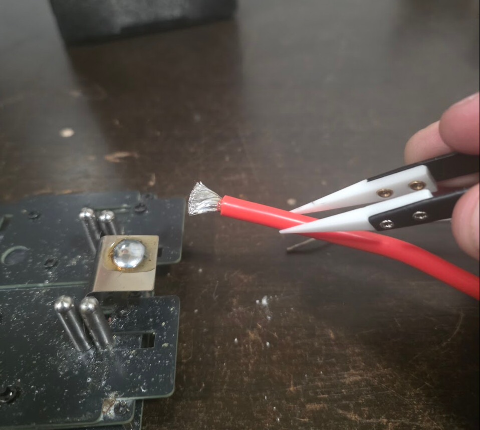 When you fan the strands out like this, do you still pre-tin the wire (light flux + solder) before attaching it to the nickle, or do you skip tinning and let everything flow together during the final soldering step?