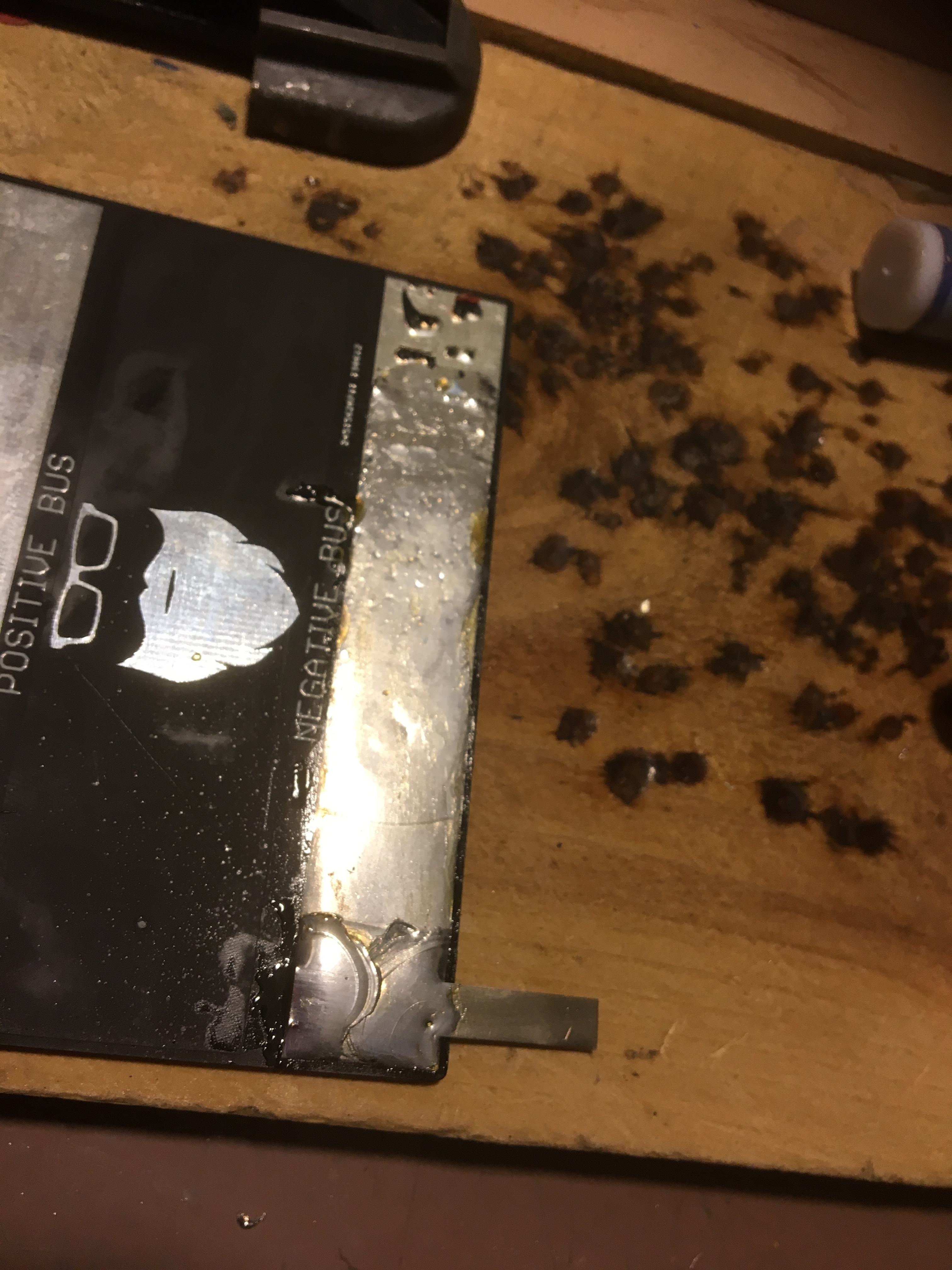 So here is the PCB I tried to weld. Those welds came off too easy. Tried to float a slab of solder onto the PCB, never done this before, but I feel like I got the hang of it as I worked. Then I tried to set a nickel strip into it… did I overdo the solder? Do I go over the strip or just let the underside adhere to molten solder?