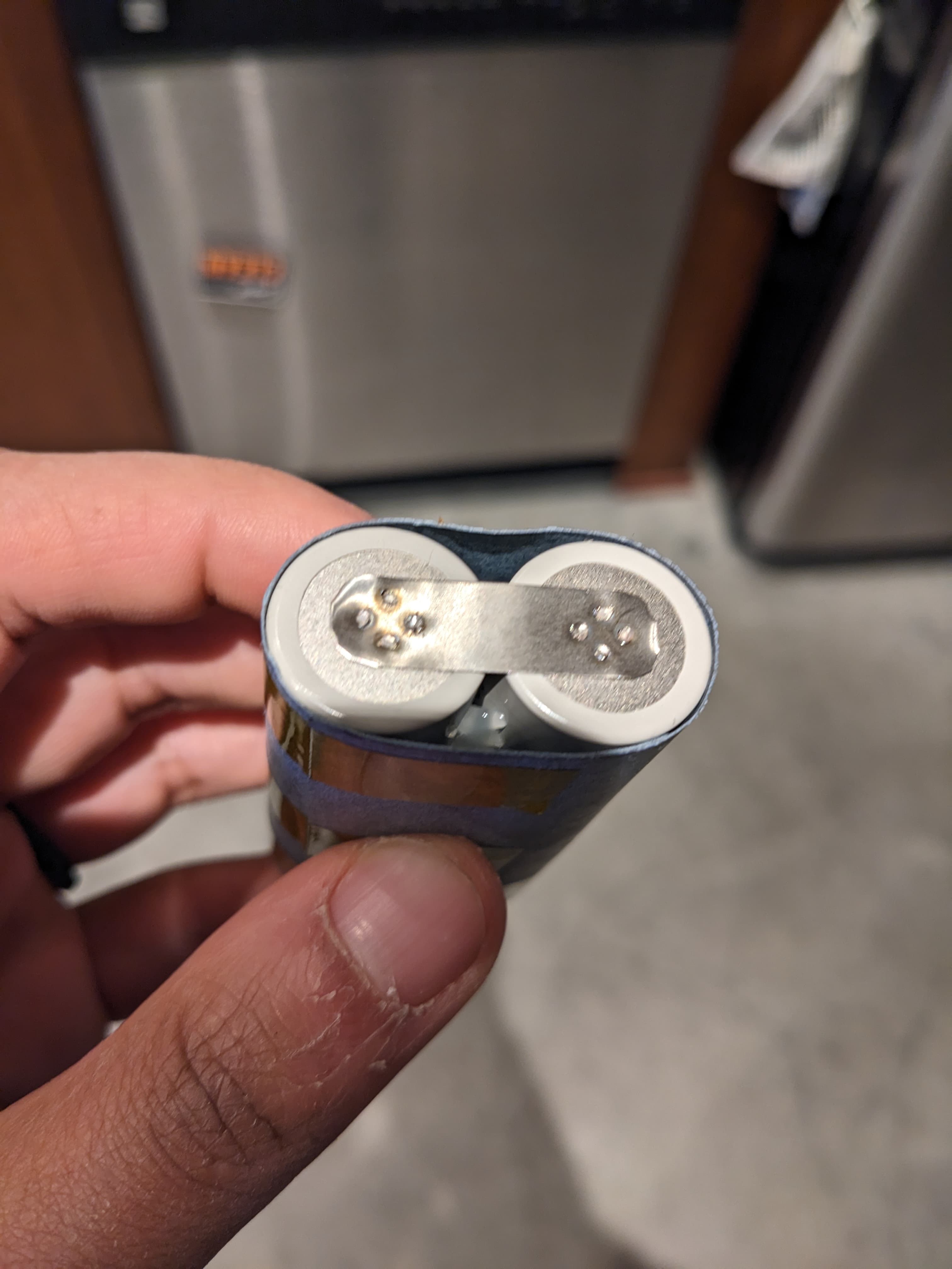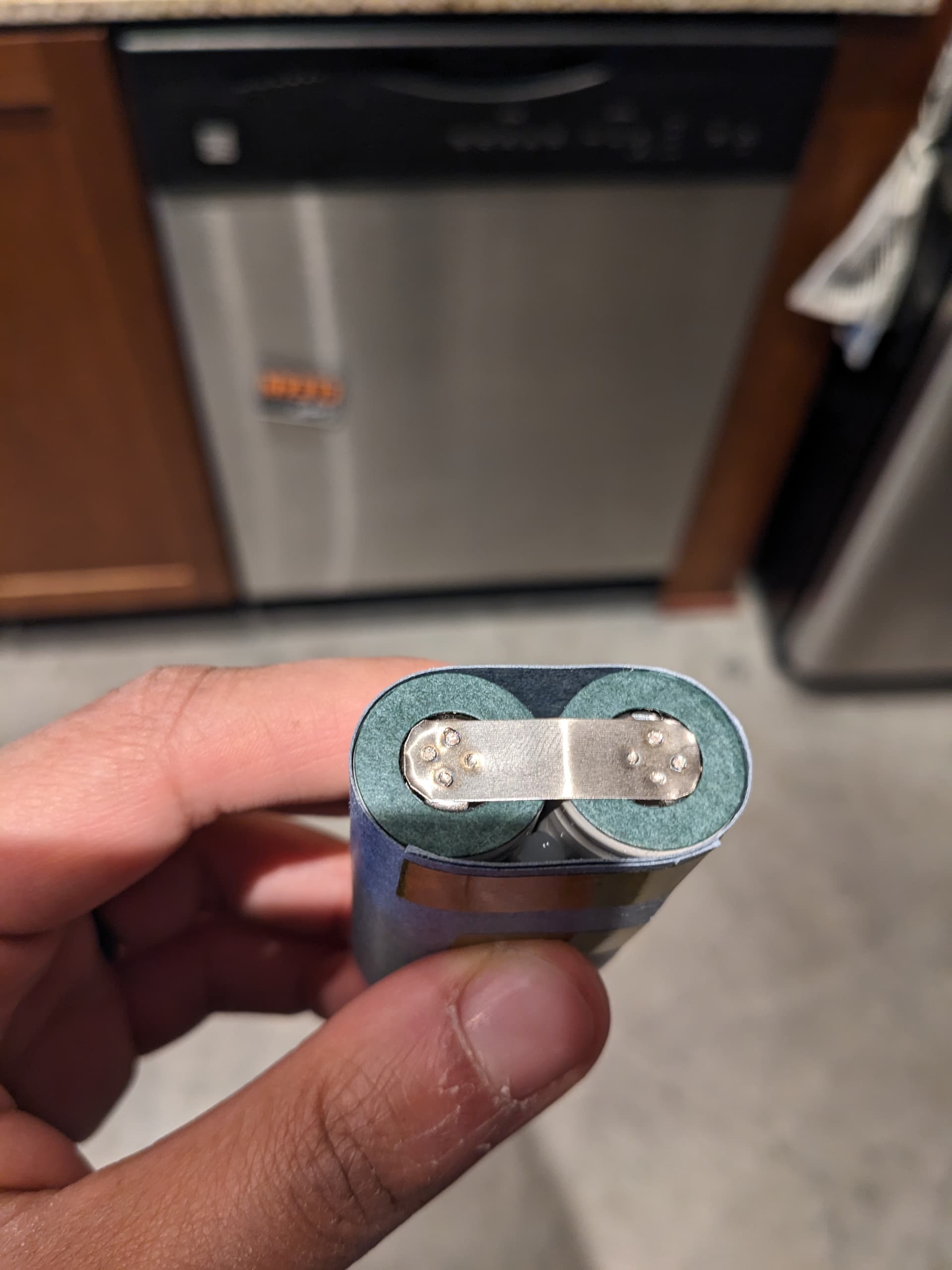 The challenge is finding any reputable nickel strips wide enough (~65mm) to overlap all the cells and fold over the top with enough real estate to solder wires to.