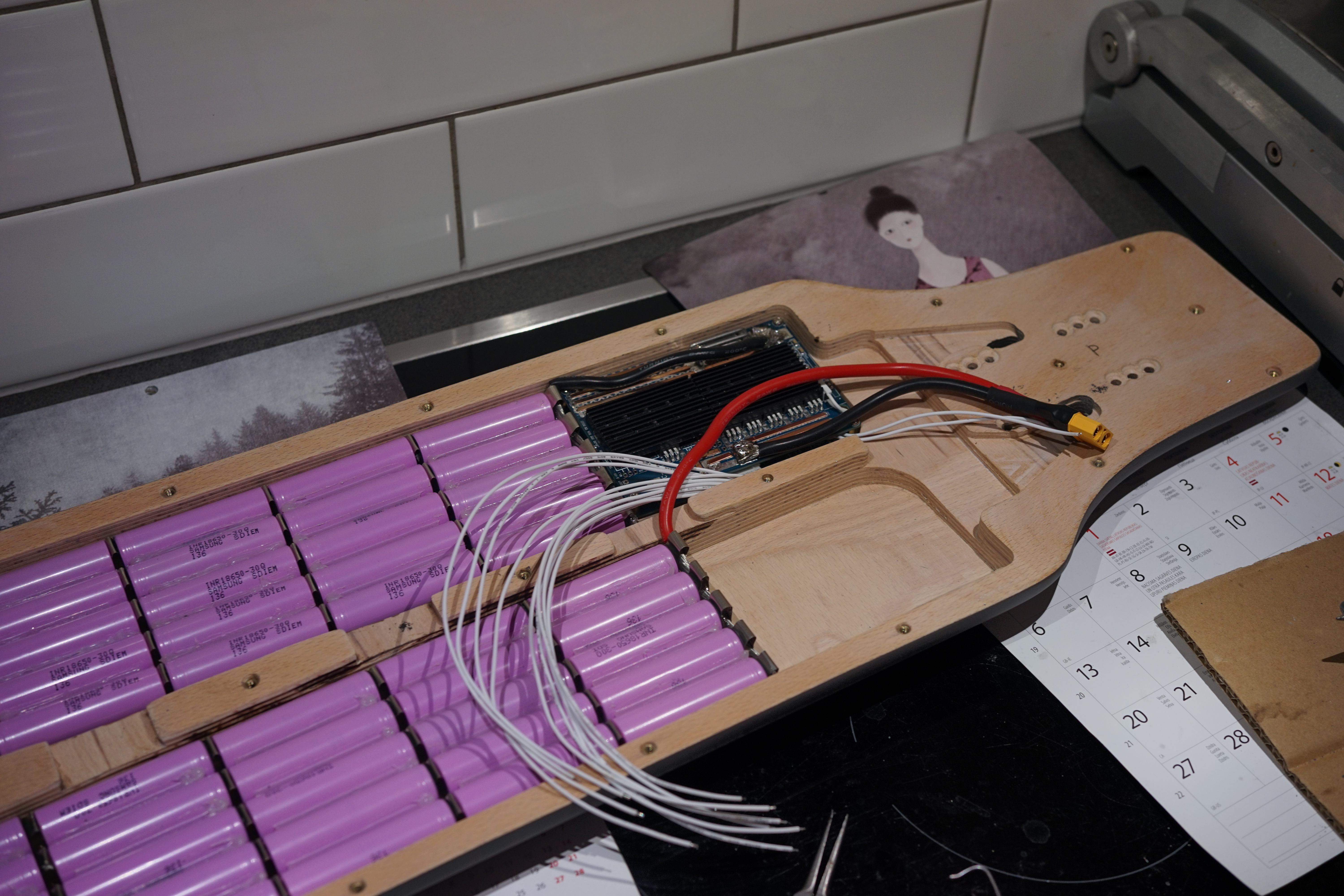 I’m pretty tired of sanding away the middle beam of the Haya shortboard, so I was thinking I wouldn’t wrap each group in fish-paper and heat shrink (which would make the pack wider, requiring me to make more space), but just put fish paper on top of each p-group, then solder the balance wires like I already did with the first (fish paper would be between the balance wires and cells, protecting from shorts). Finally, I would use kapton tape, and then packing tape (because kapton isn’t durable) around each p-group connection point to protect the balance wire connections and nickel from shorting with anything from above.