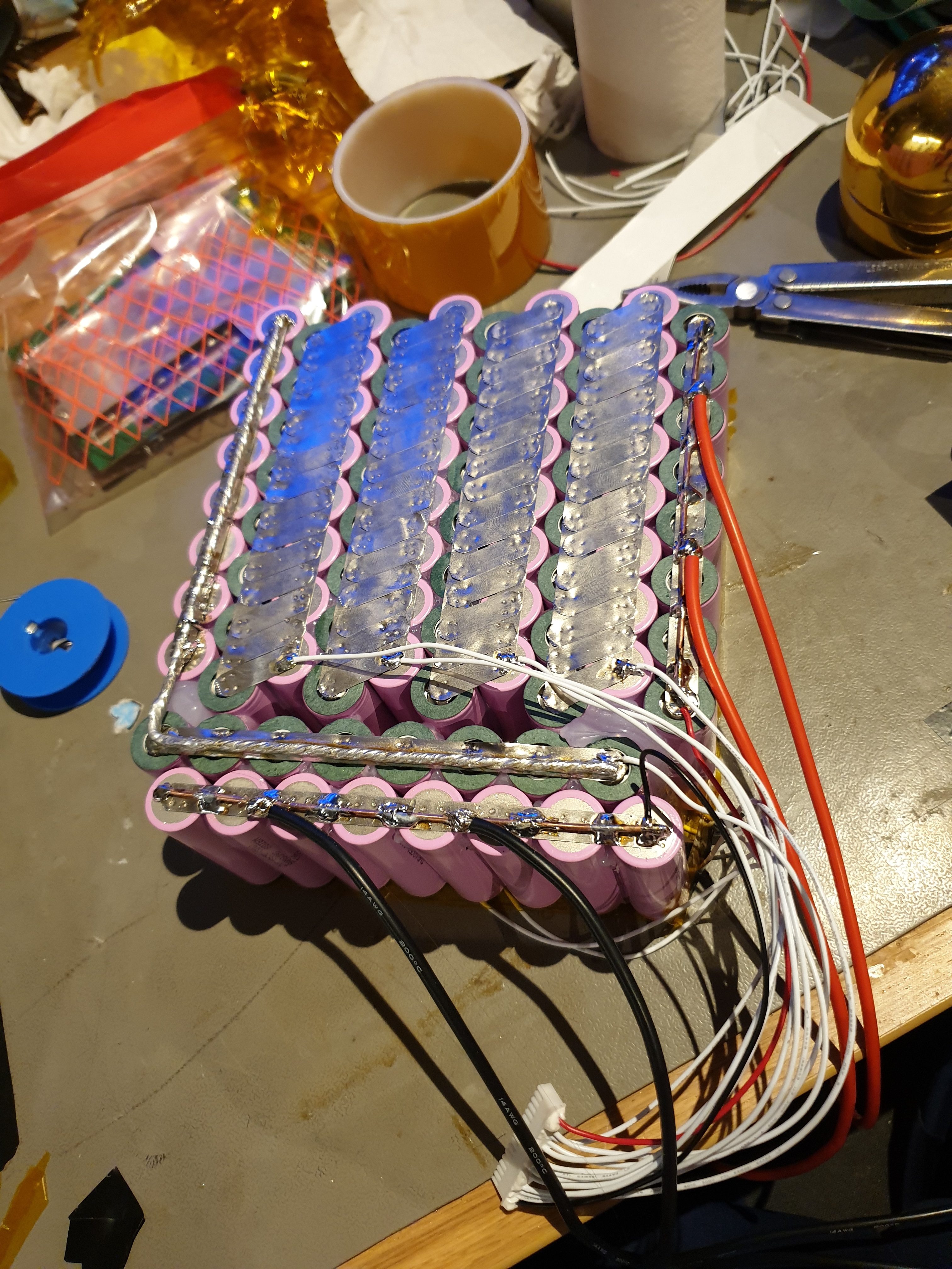 All wiring oversized to maintain nice cool operation. 0.2x10mm nickel strip with dual 12awg series connections with tinned flat copper bus bars on either end. 10awg main leads