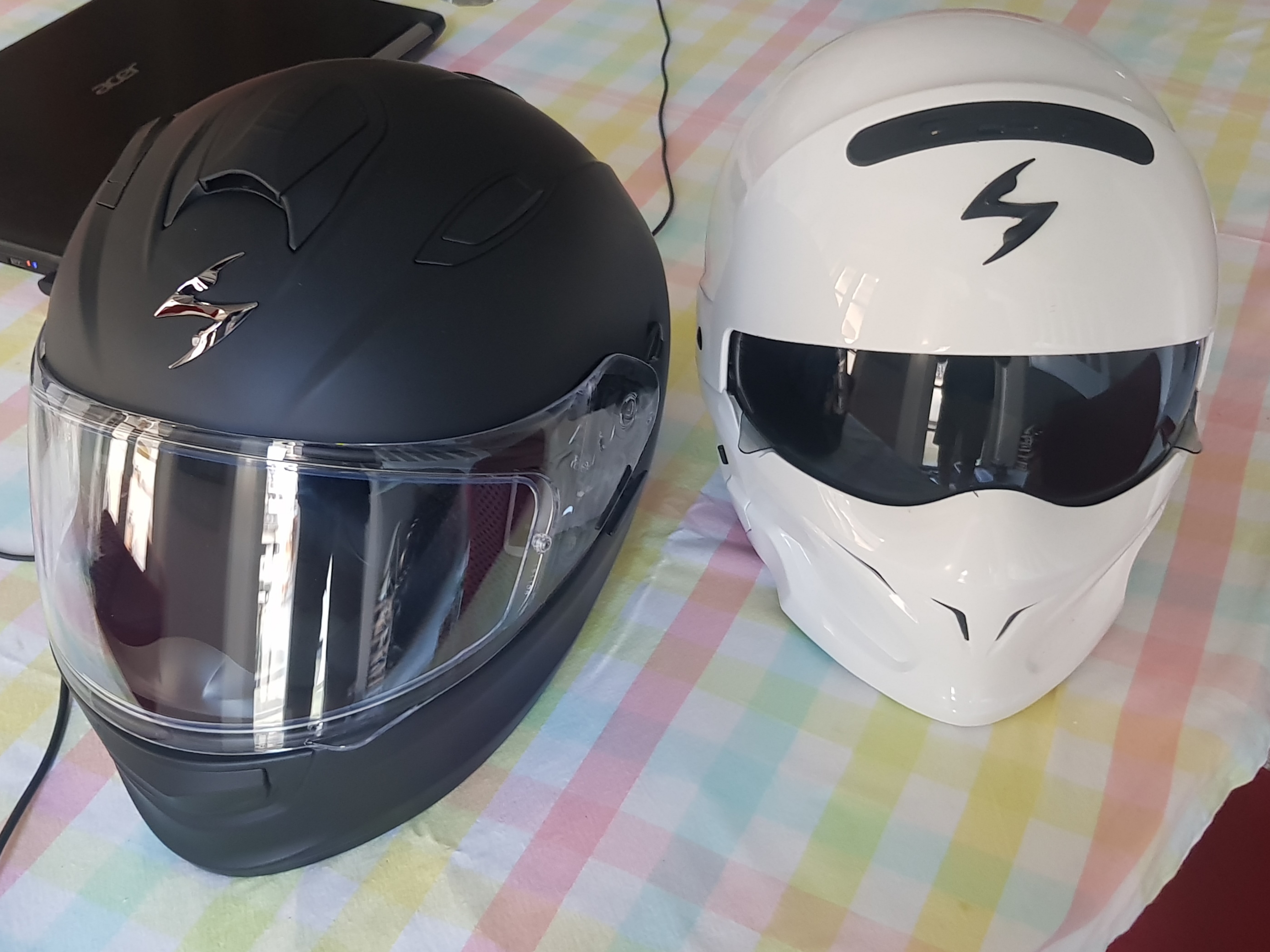 I like the bike helmets made for city riding. With a lot of years of wrestling and Brazilian Jiu Jitsu behind me I am comfortable that I can fall without sticking my chin out so I don’t see the need for a full face helmet (for me). I have both of these helmets with half visors to protect my eyes: