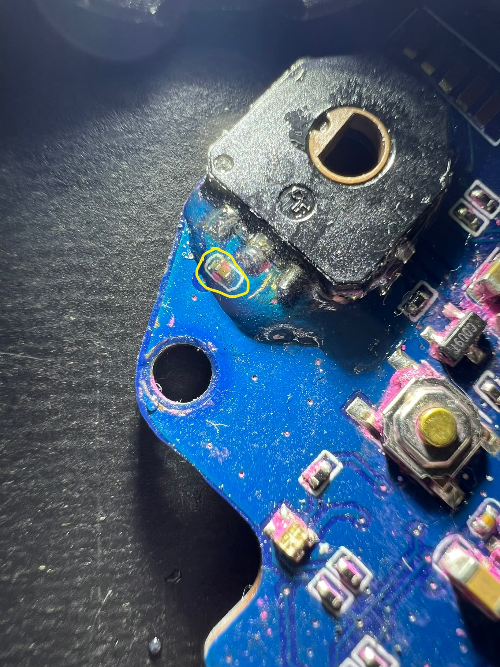 So, it’s not the potentiometer leads. I’ve already reinforced all of those long ago (edit - have reinforced pot leads on other remotes, just realized this is one that hasn’t been yet & I snapped the pic of the diode in question before topping off the pot leads w/a hefty dose of solder. I assure you they are well solder blobbed & reinforced at this point). This is the very small diode(?) that happens to be placed closely to the pot leads.