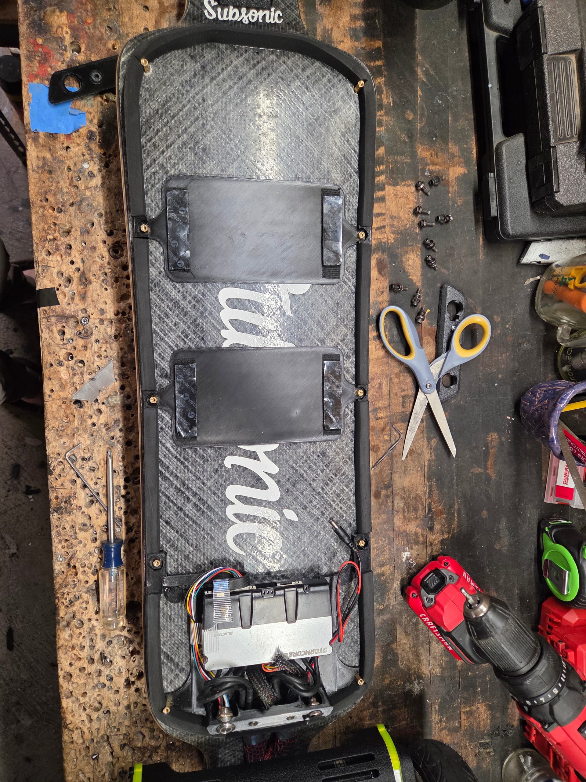 I ordered a 12s4p lishen pack from mboards. Its used but looks okay and fully charges. It was 250 dollars which I thought was a good price. The dimensions are 17x 7x 1 it should fit great where the velcro is. The subsonic underside uses 6x 5mm stand offs and 4 x 10mm standoffs at the corners. Its sealing nicely but im not happy with the power button/charge port seal, as well as the motor cables. Im really interested in the standoff approach if there are better ways to do it.