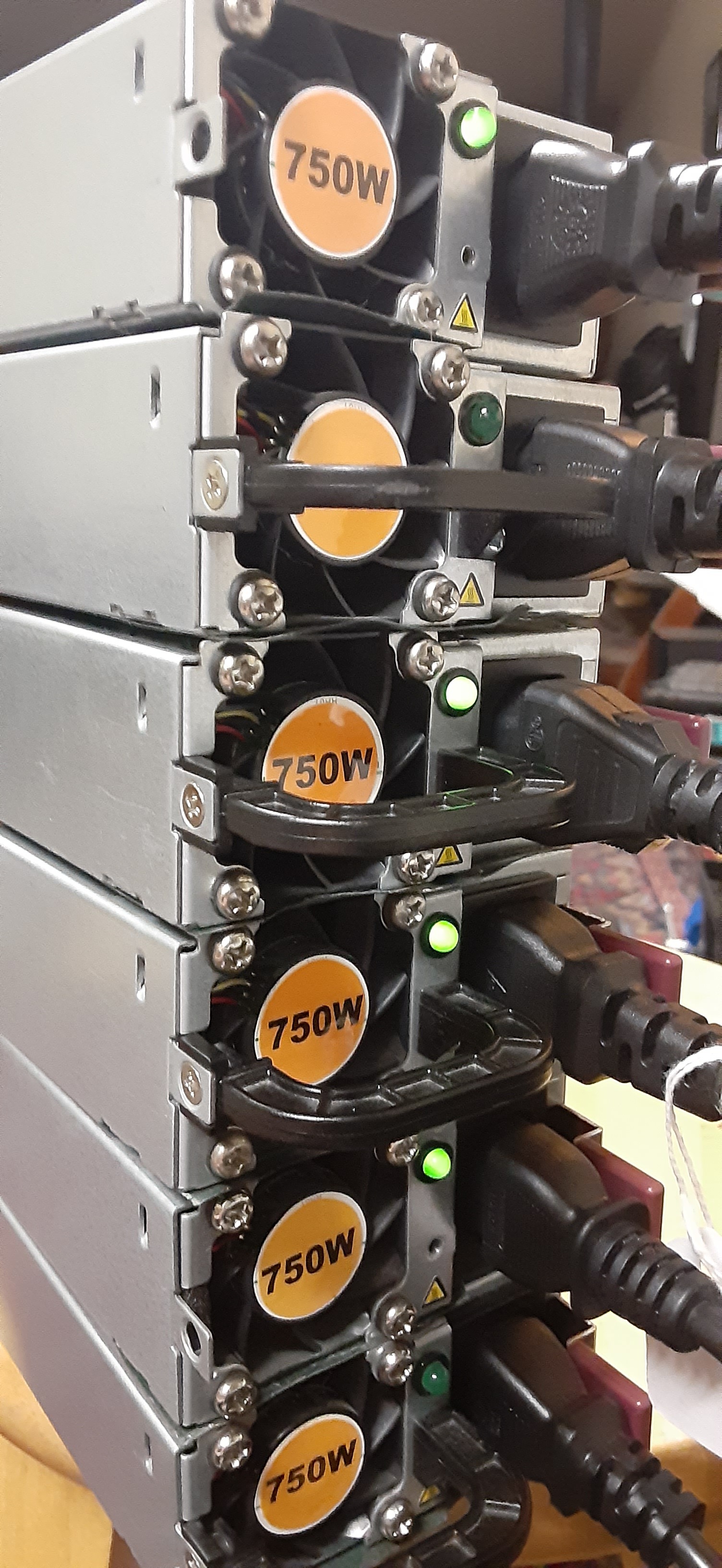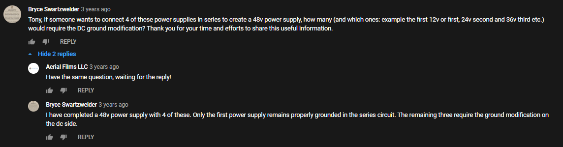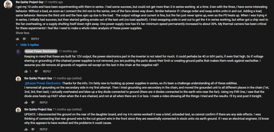 The first issue I ran into is when series connecting 3+ power supplies without the AC ground isolated the fans will spin faster as more are connected.