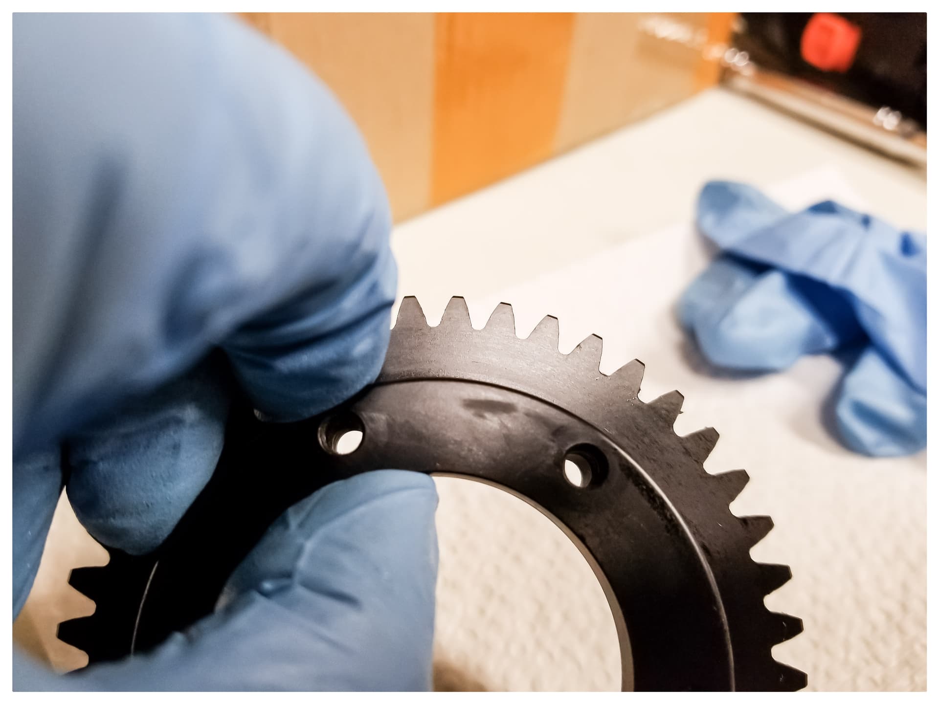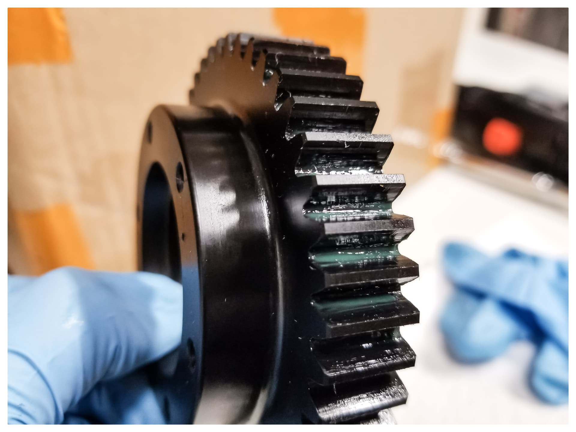 Then I inspected the motor pinion. Pretty interesting to look at the grease build up around the case. There doesn’t look like much wear on the motor pinion, but I could see some spots where the black anodization was starting to wear off.