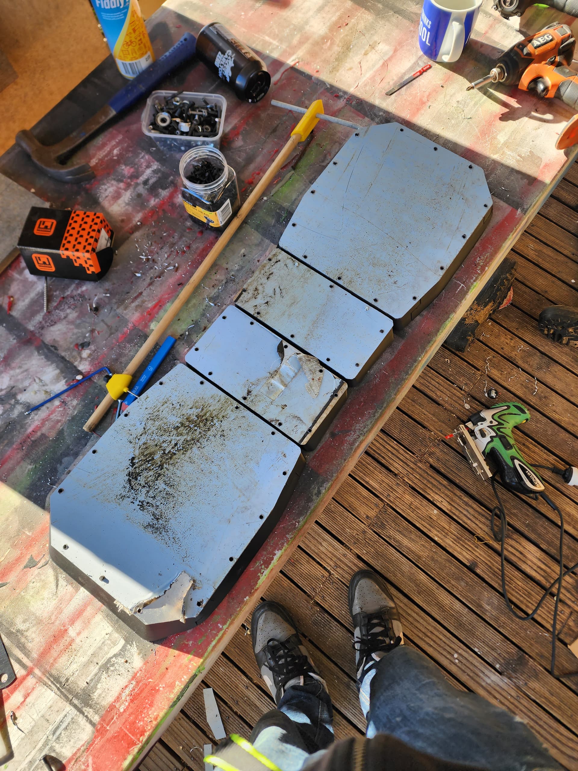 The aluminium plates for the enclosure are roughly cut and drilled, need to snag some sikaflex from work to fully assemble the enclosure, will bond the enclosure walls together and to the aluminium and then i can sand and paint as one.
